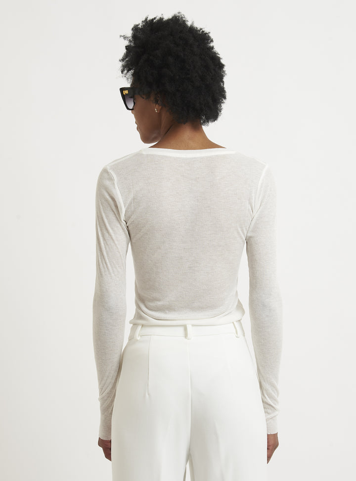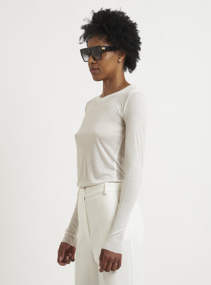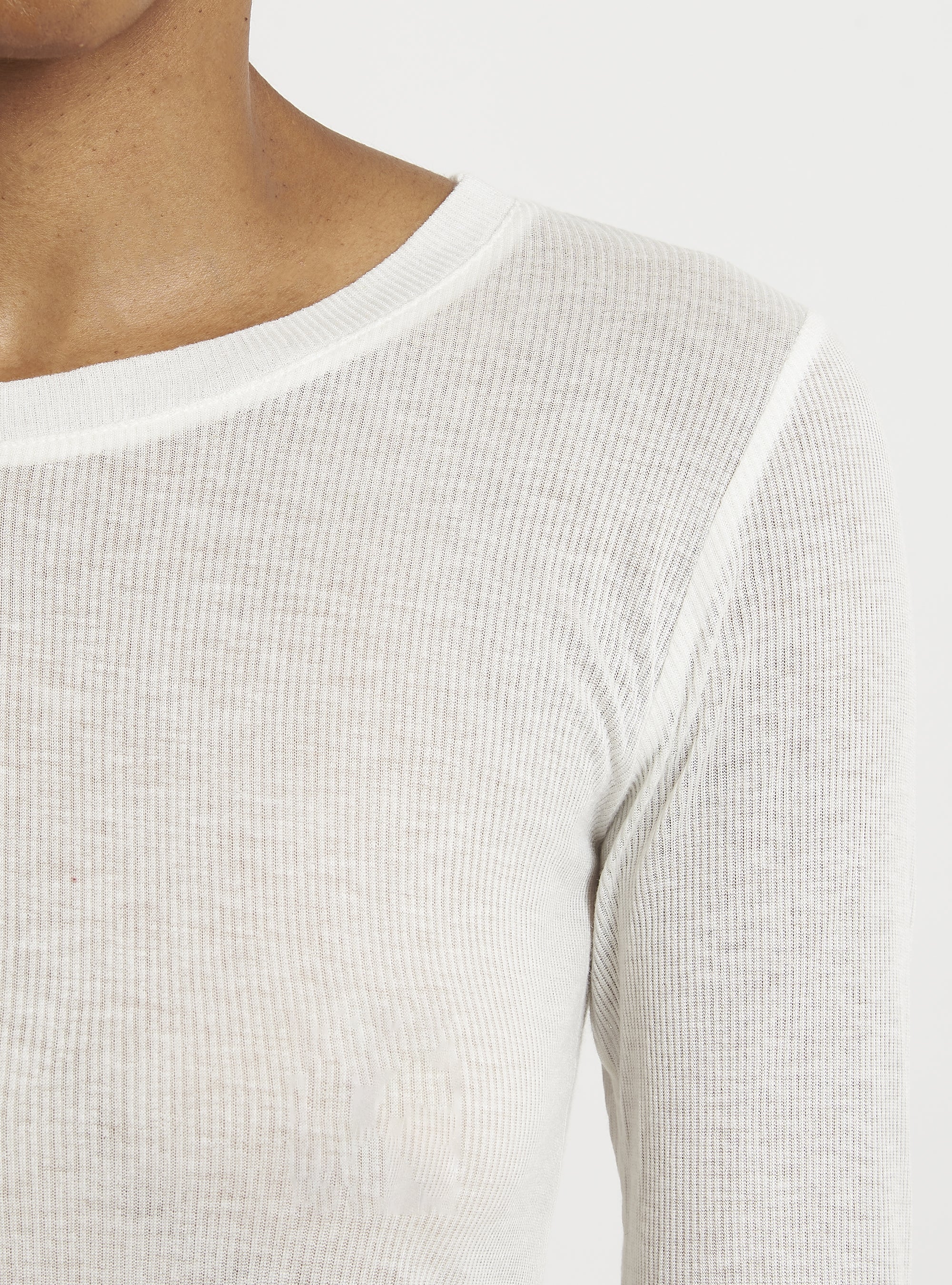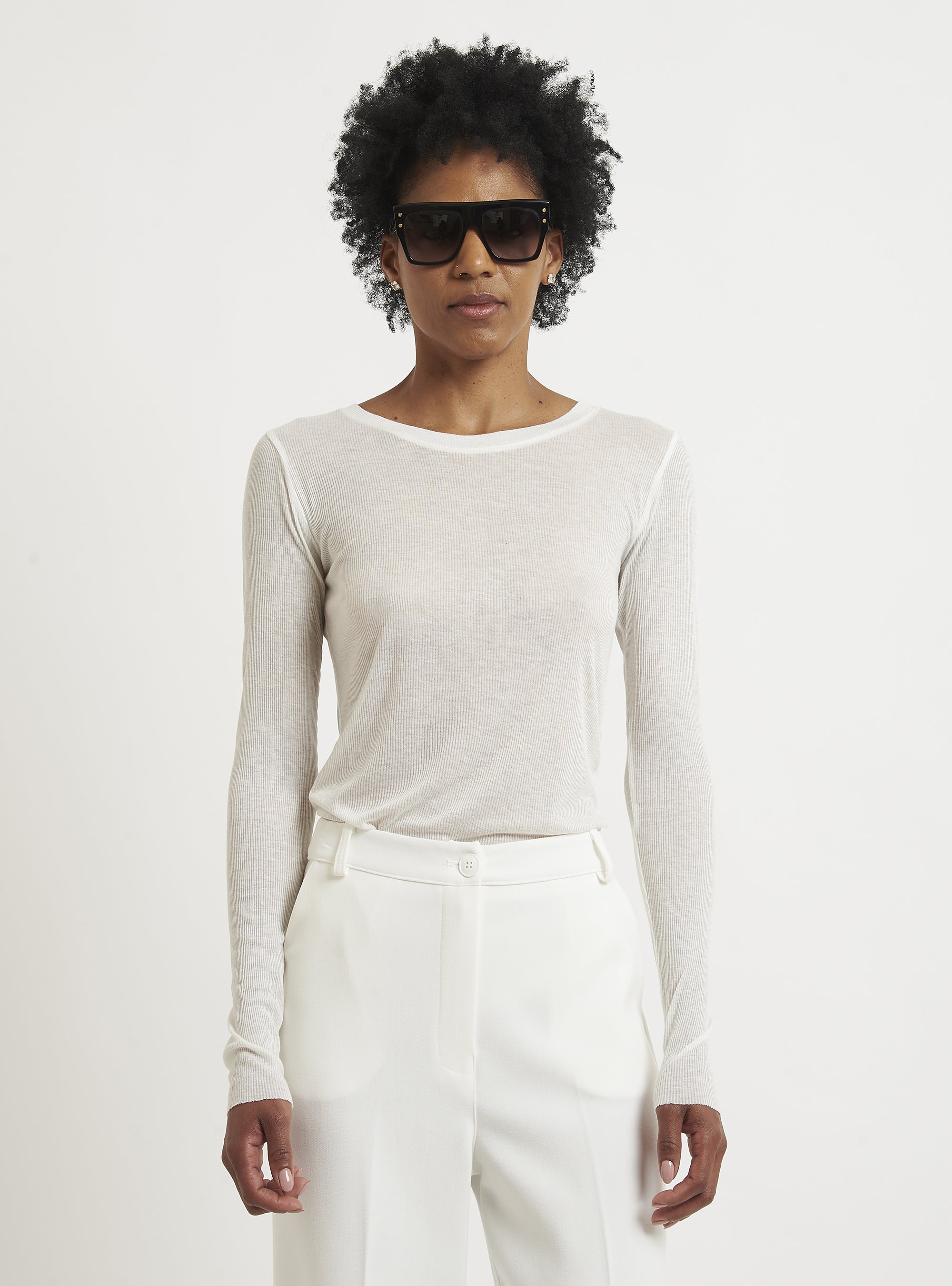 A casual yet sophisticated style characterizes this cashmere sweater. The fitted lines and ribbed knit create a casually feminine silhouette. Pair with a pencil skirt or cashmere leggings. Relax fit.