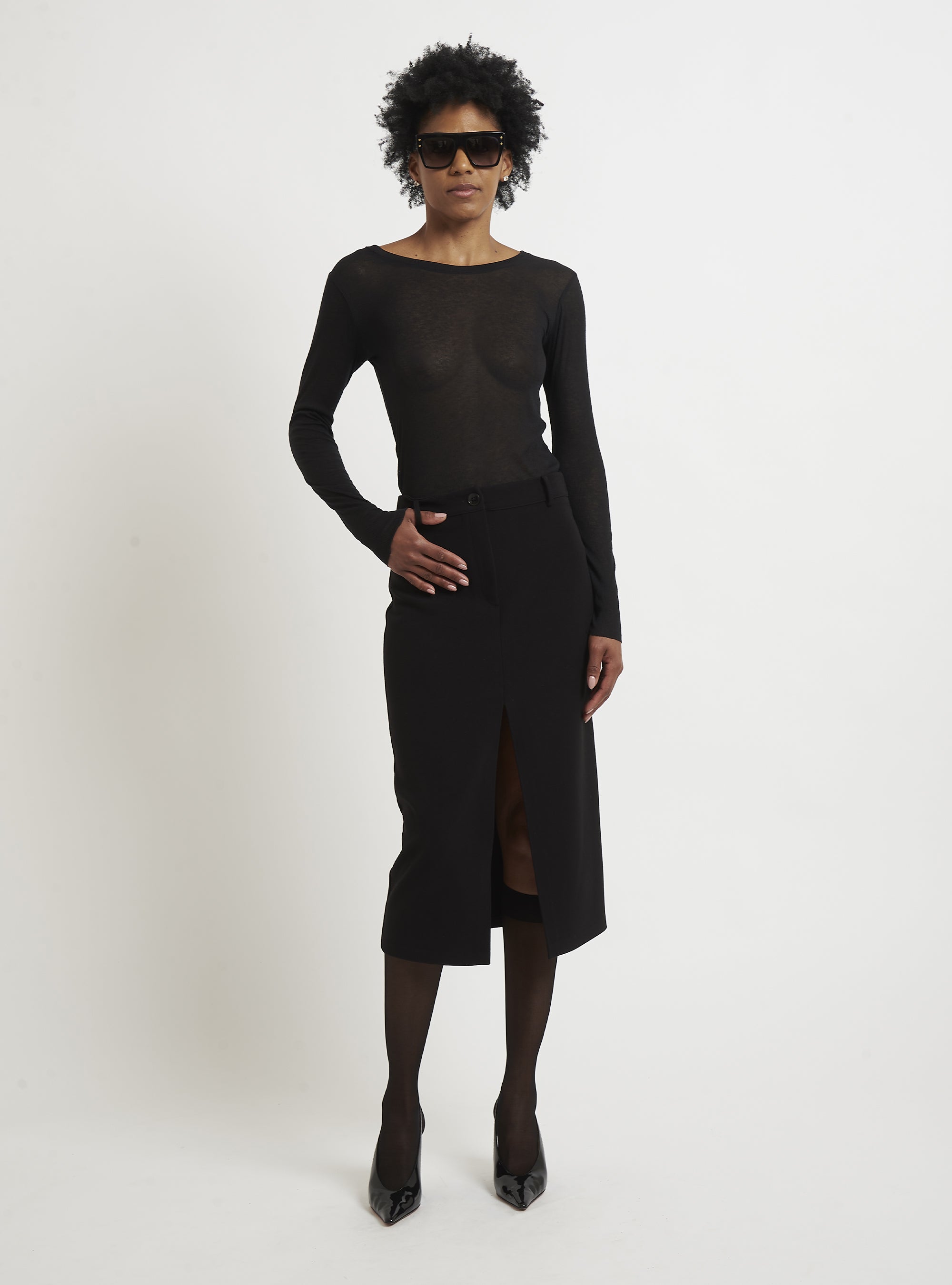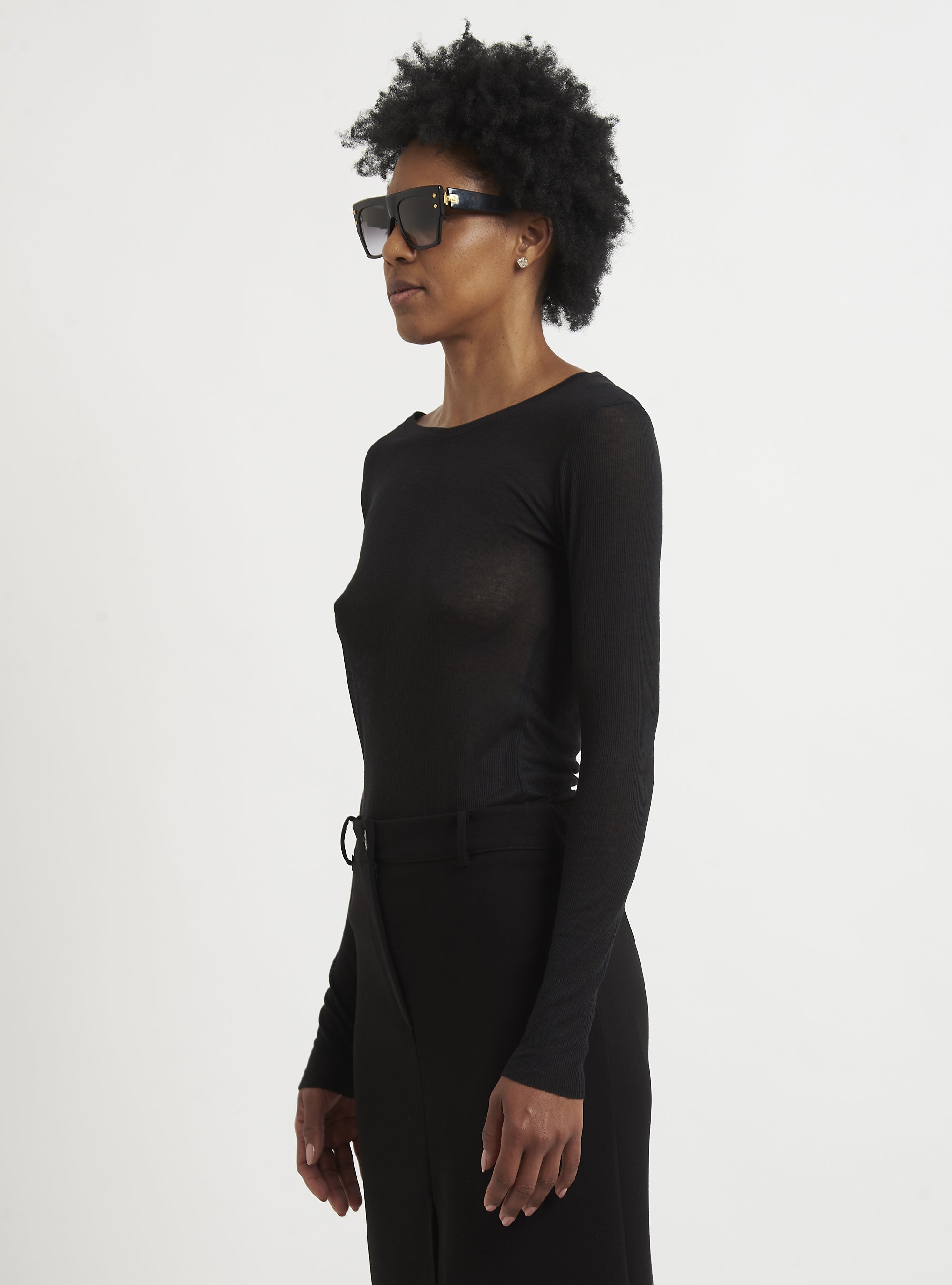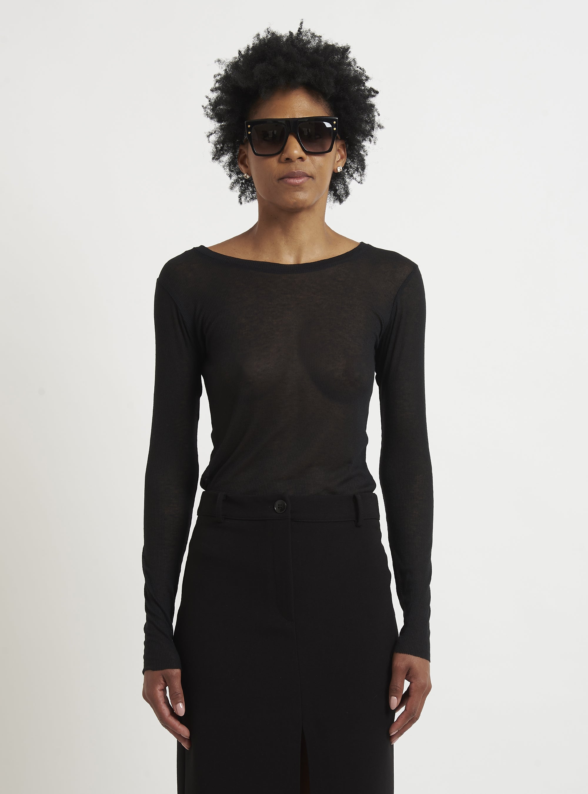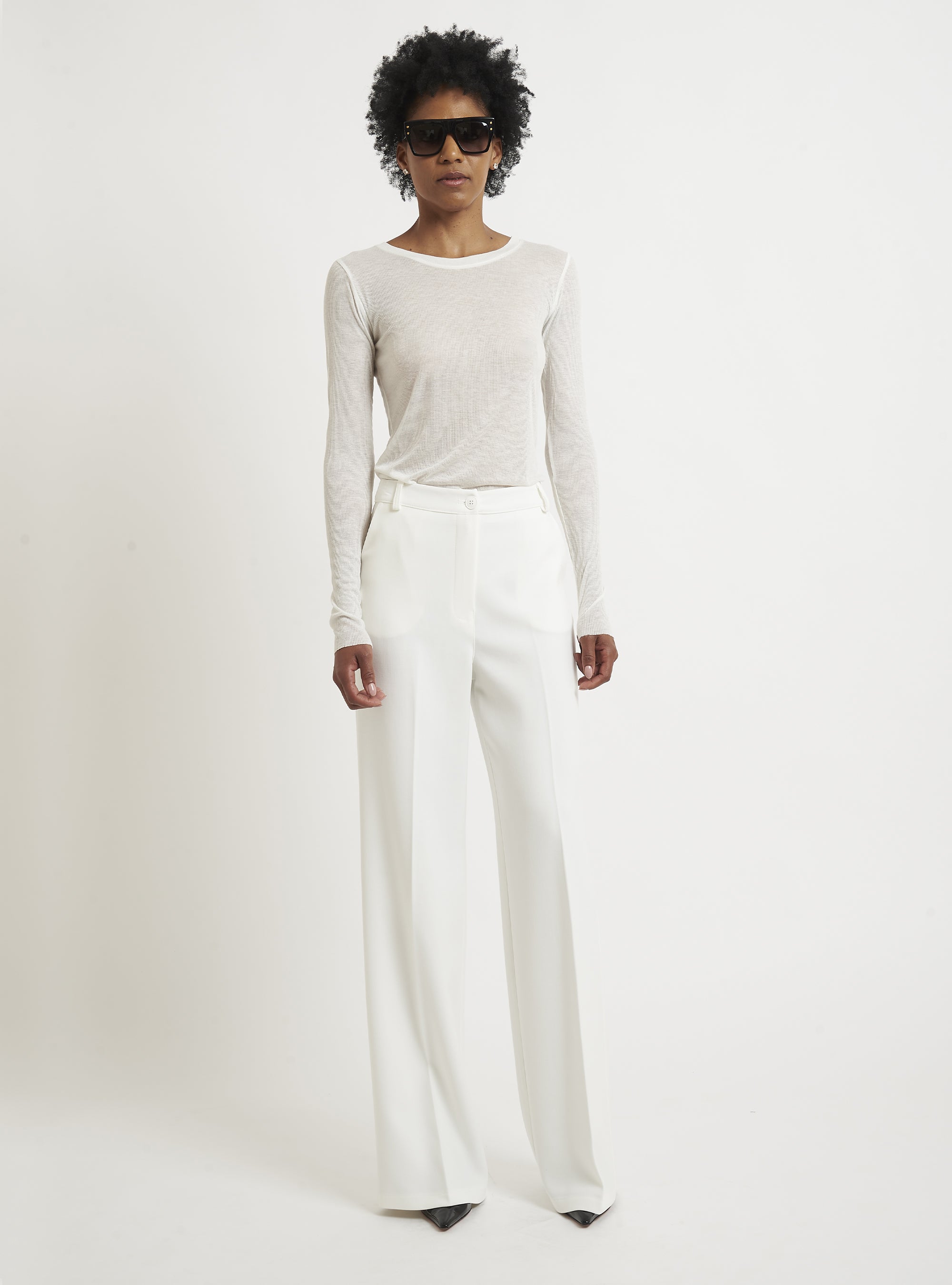A casual yet sophisticated style characterizes this cashmere sweater. The fitted lines and ribbed knit create a casually feminine silhouette. Pair with a pencil skirt or cashmere leggings. Relax fit.