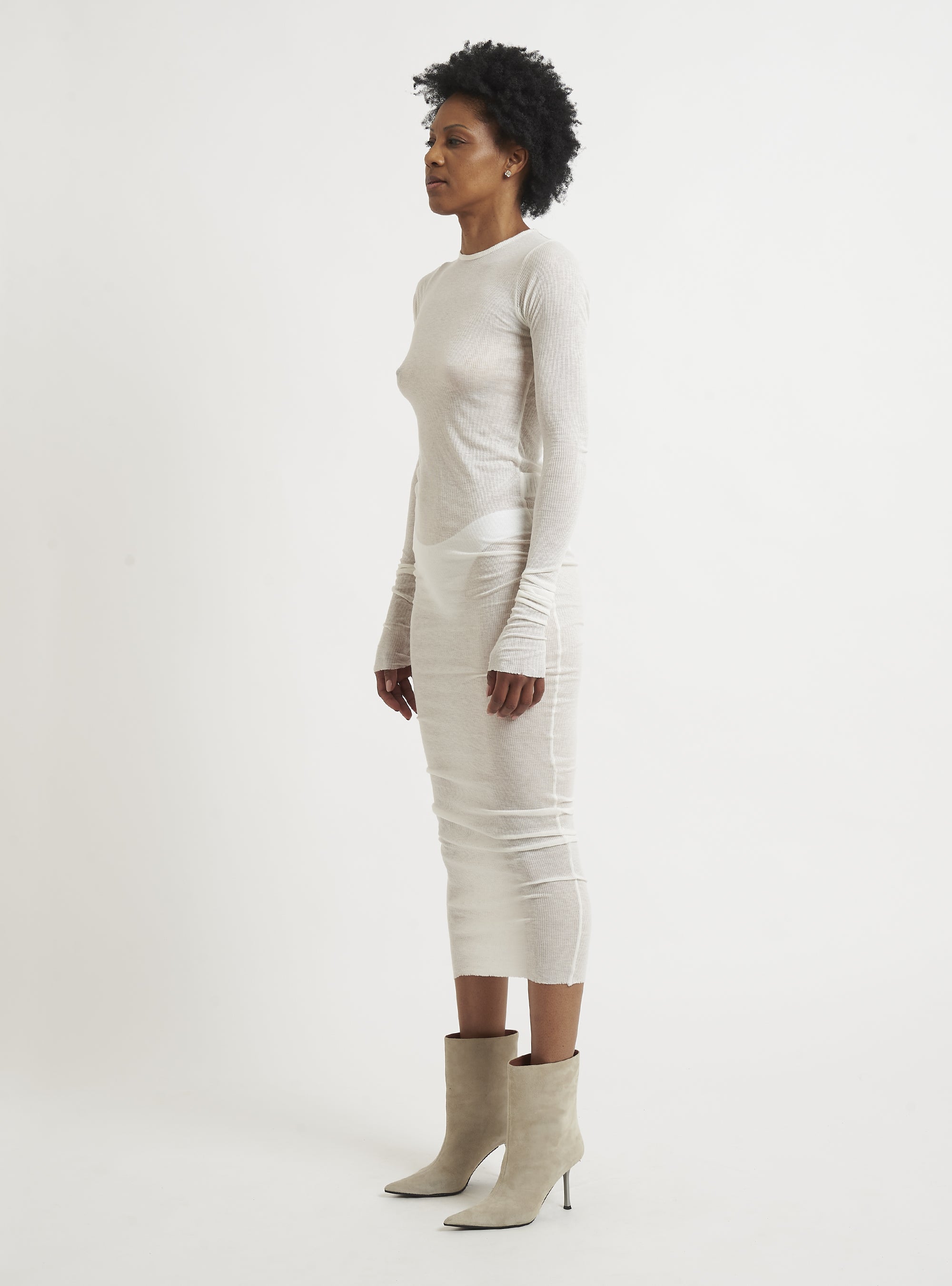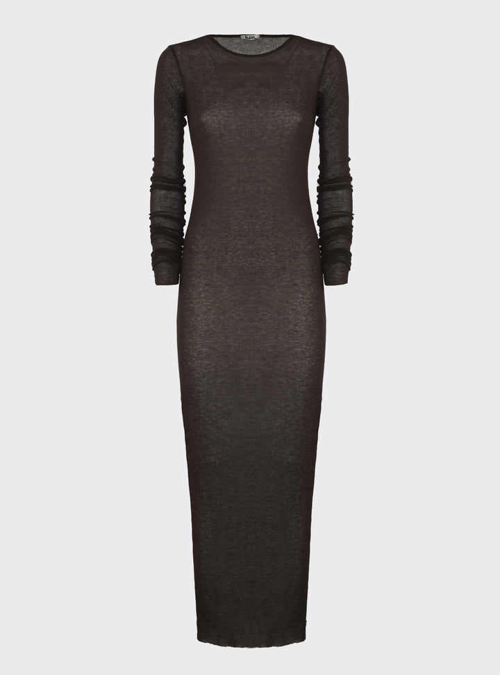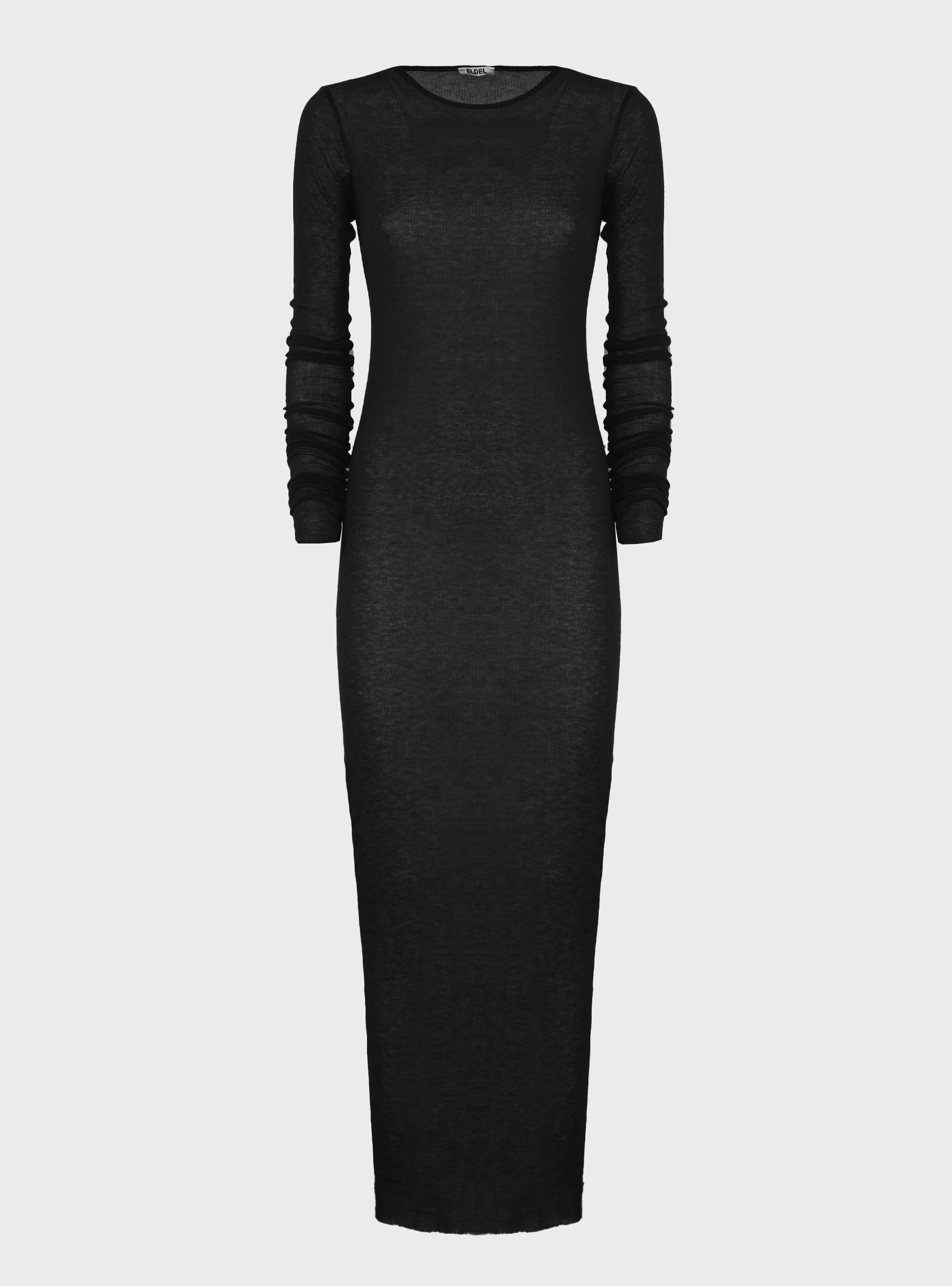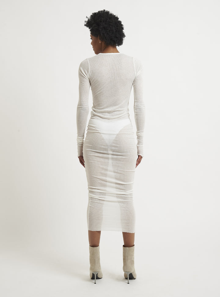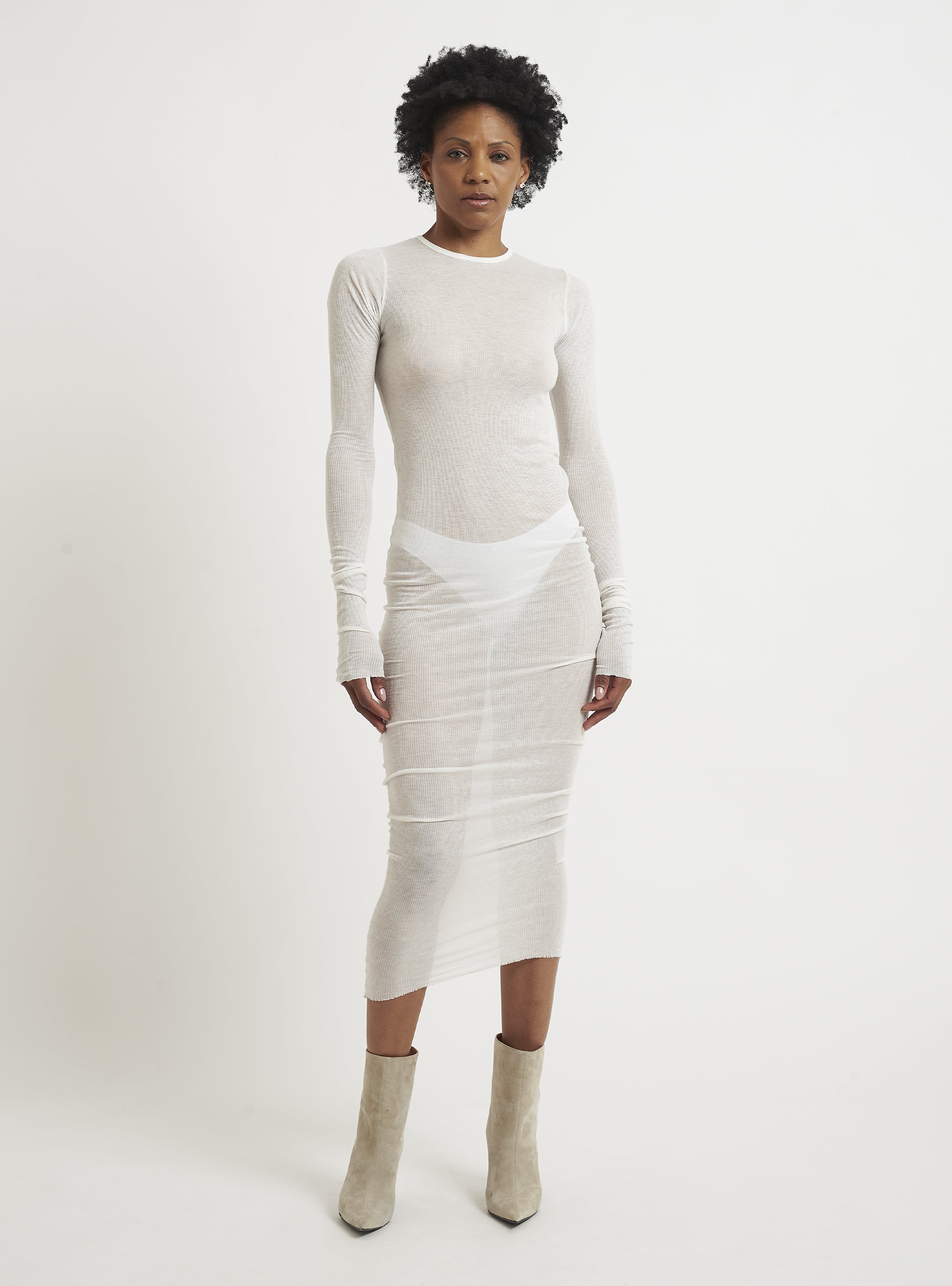 A casual yet sophisticated style characterizes this ribbed crew neck dress. The fitted lines create a casual yet feminine silhouette. Pair it with cashmere leggings for a sophisticated look. Slim fit.
