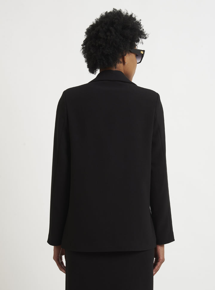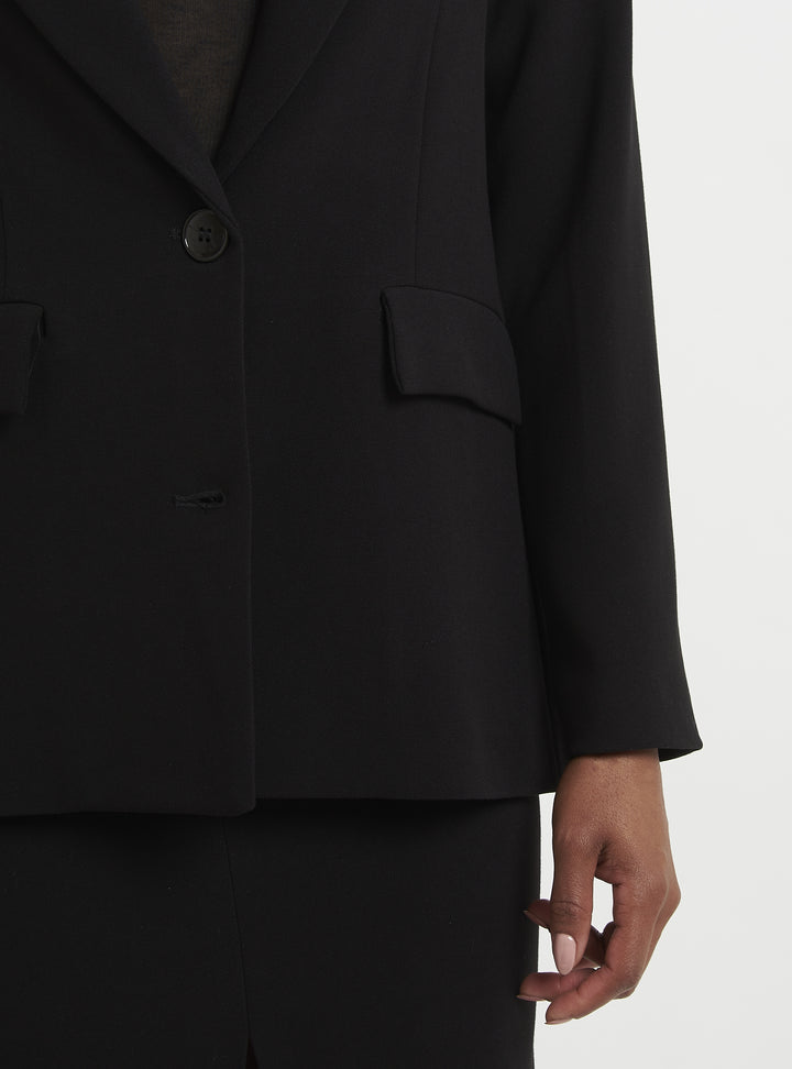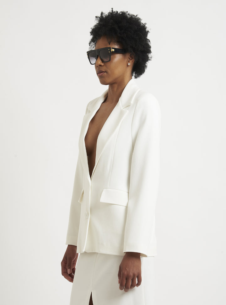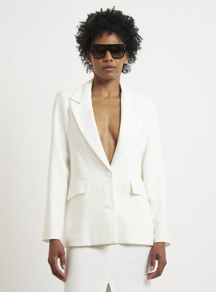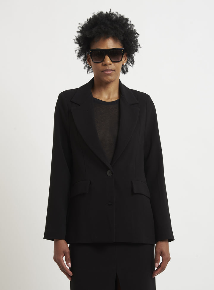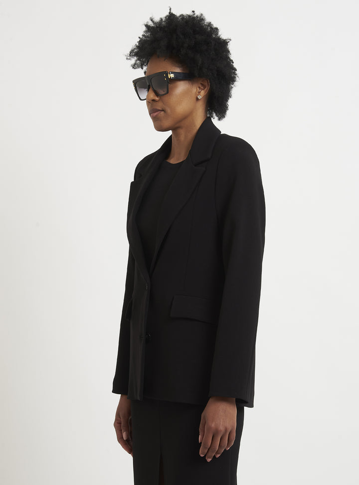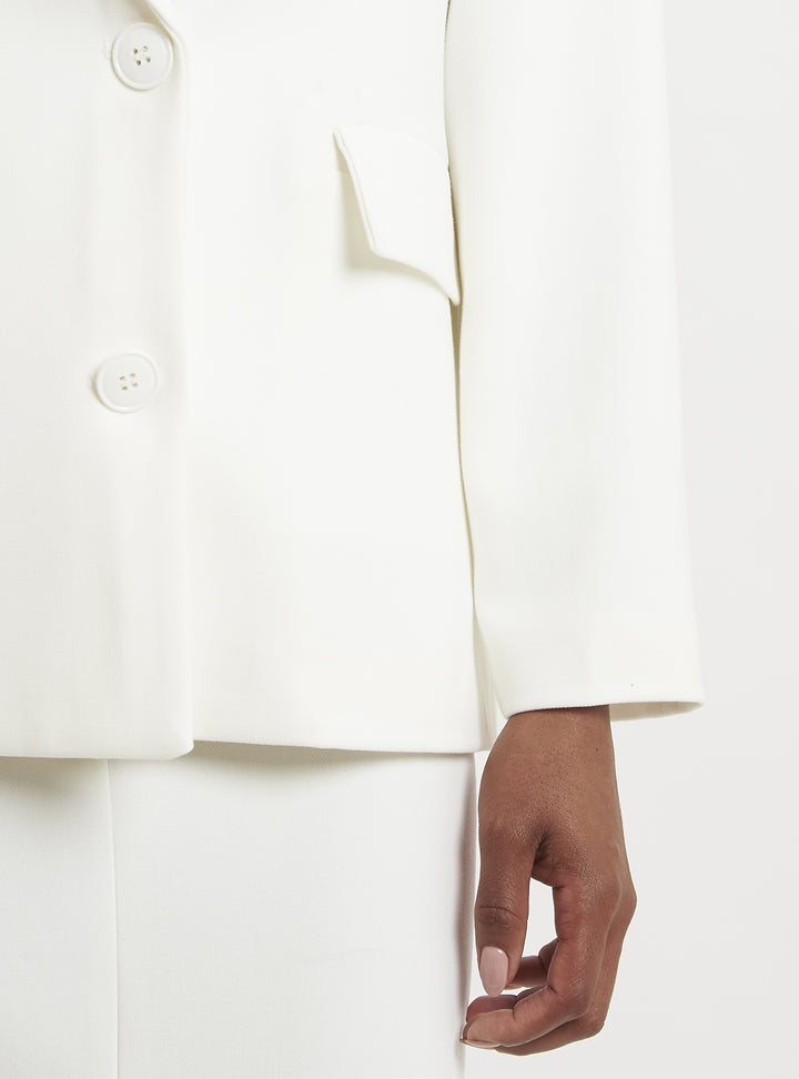 Single-breasted wool jacket. Boxy fit with peak collar and flap pockets. This versatile piece defines your unique style. Fits true to size.