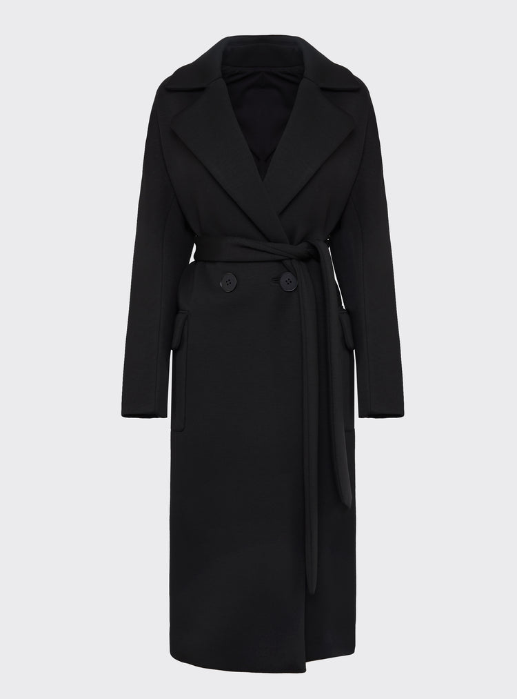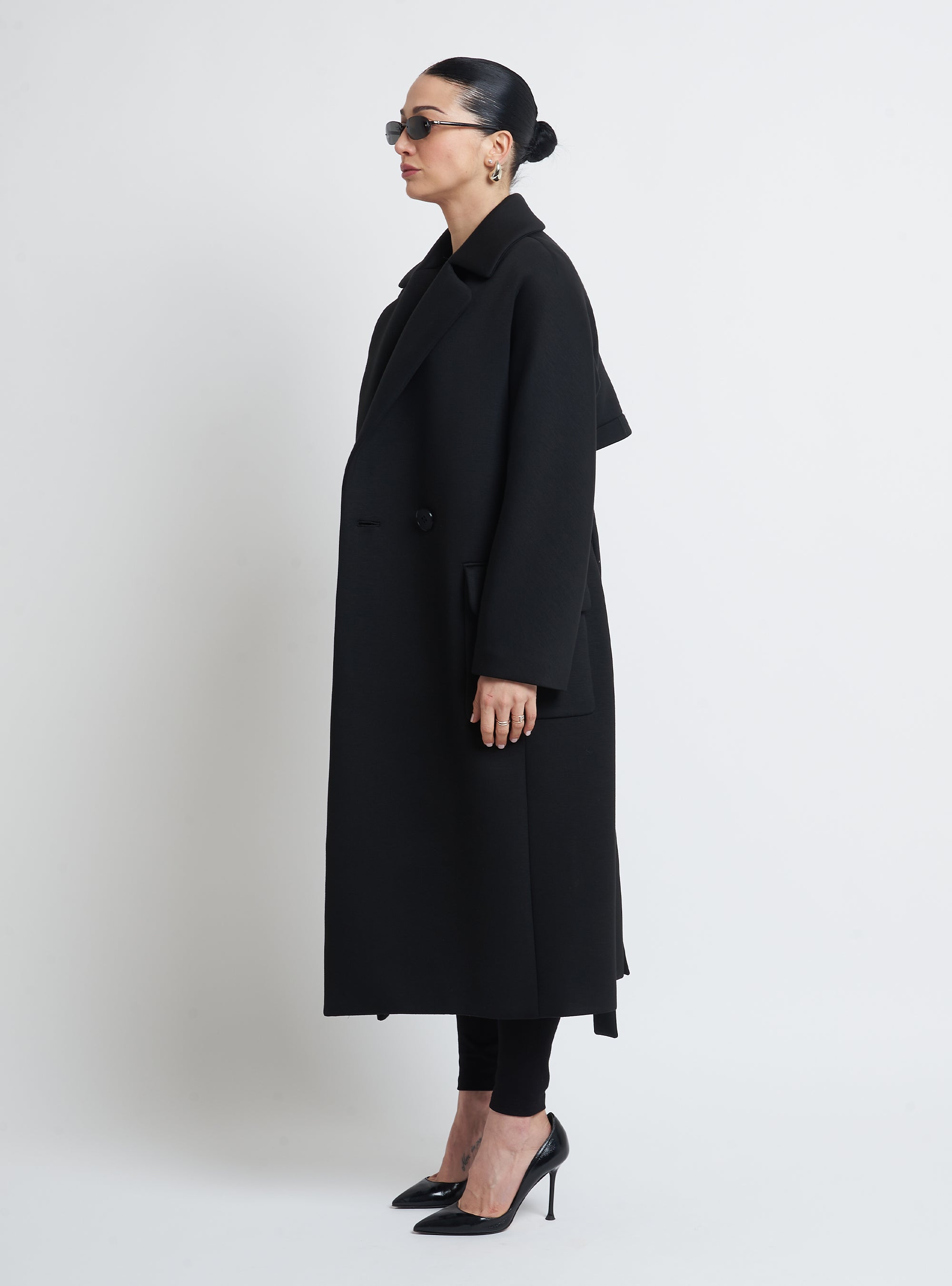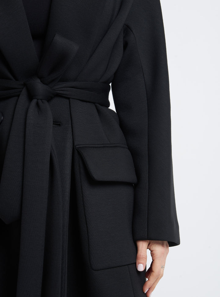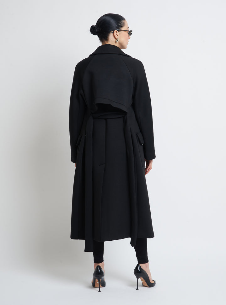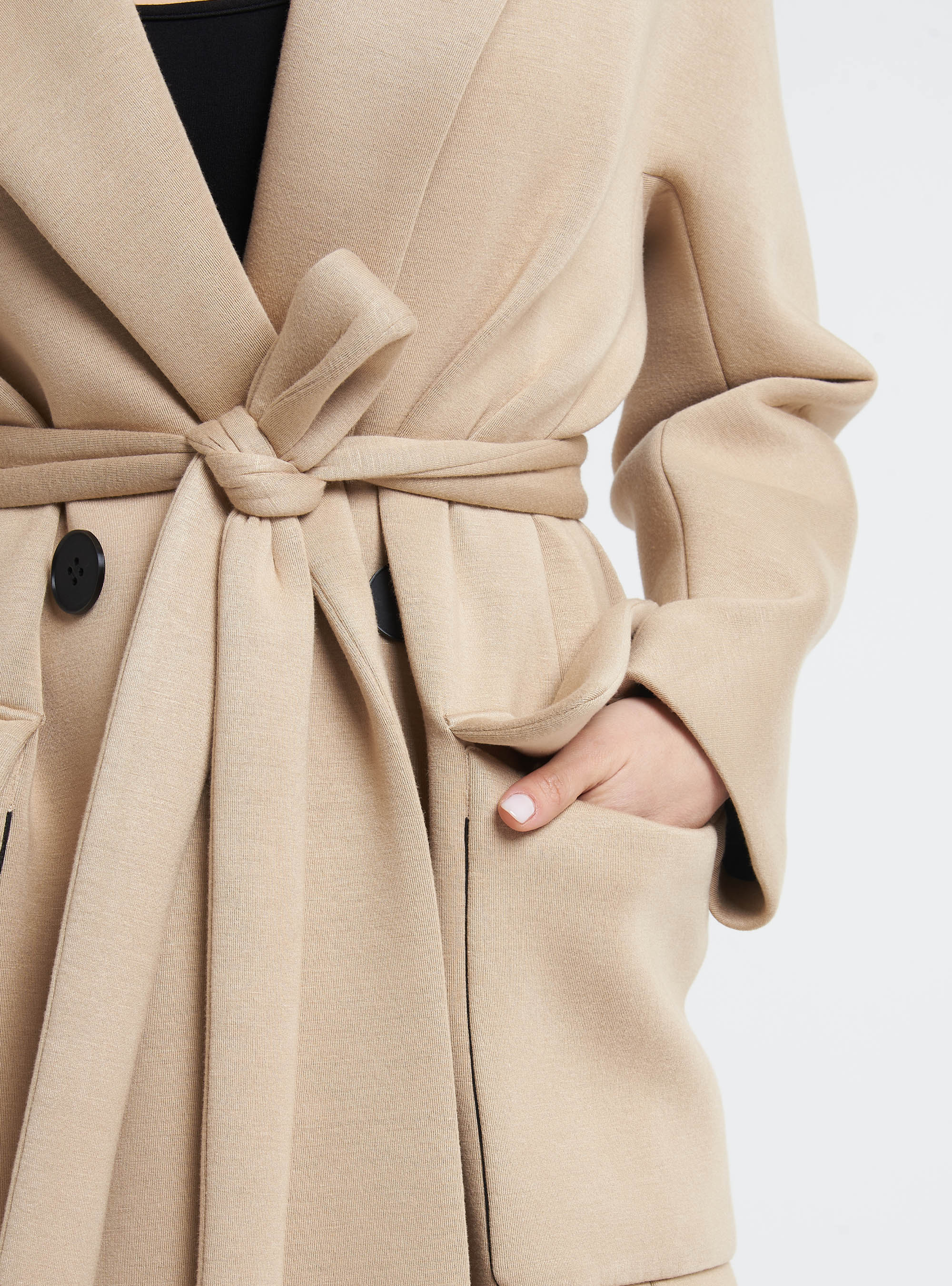 Double-breasted coat, regular fit. Equipped with patch pockets, matching fabric belt and back cape.