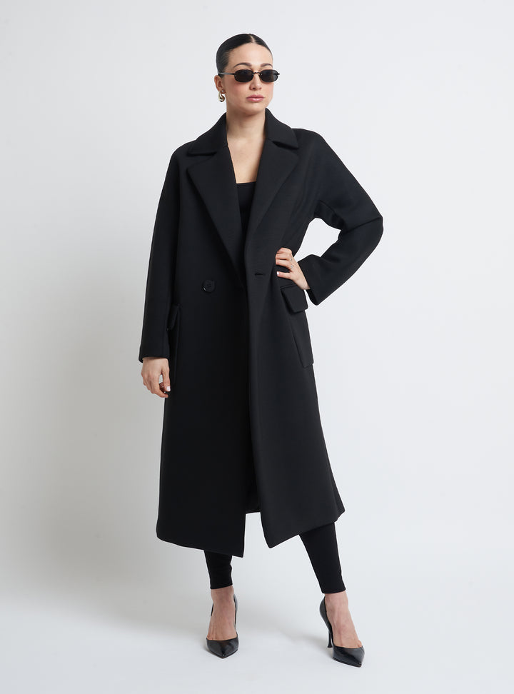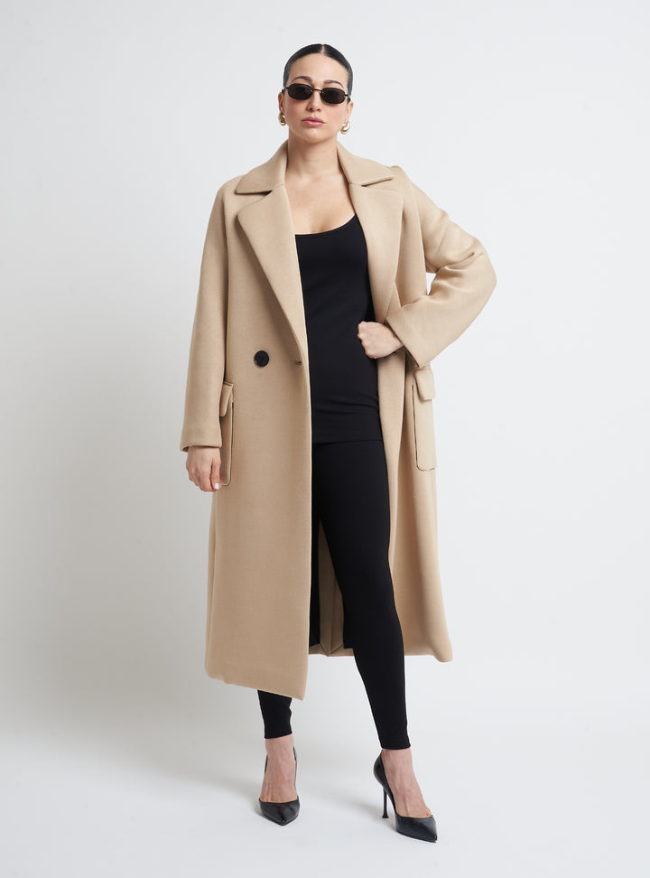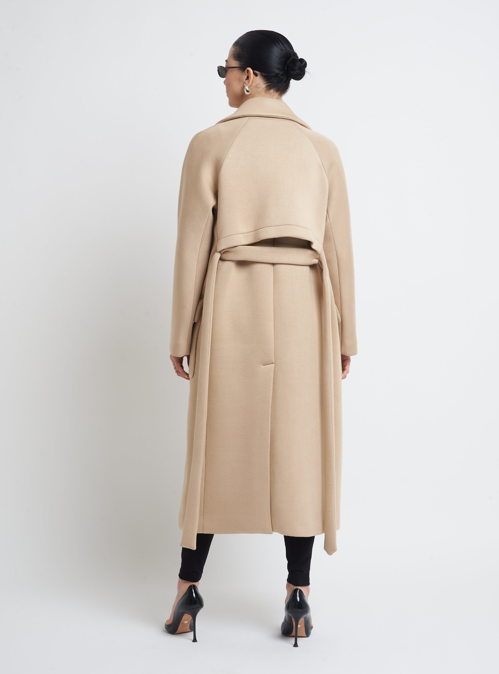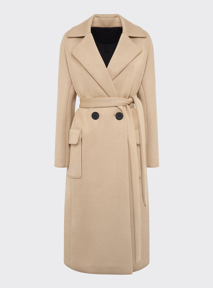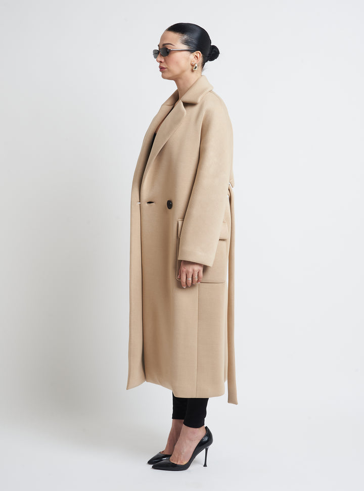 Double-breasted coat, regular fit. Equipped with patch pockets, matching fabric belt and back cape.