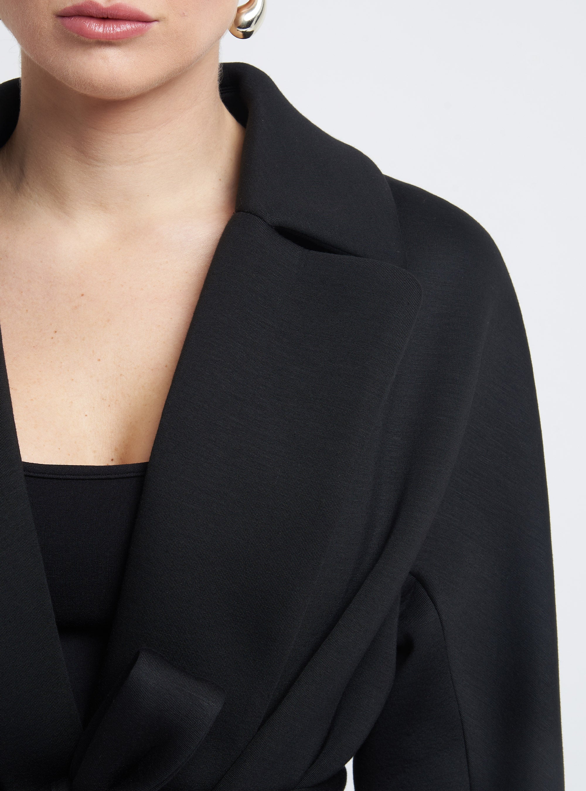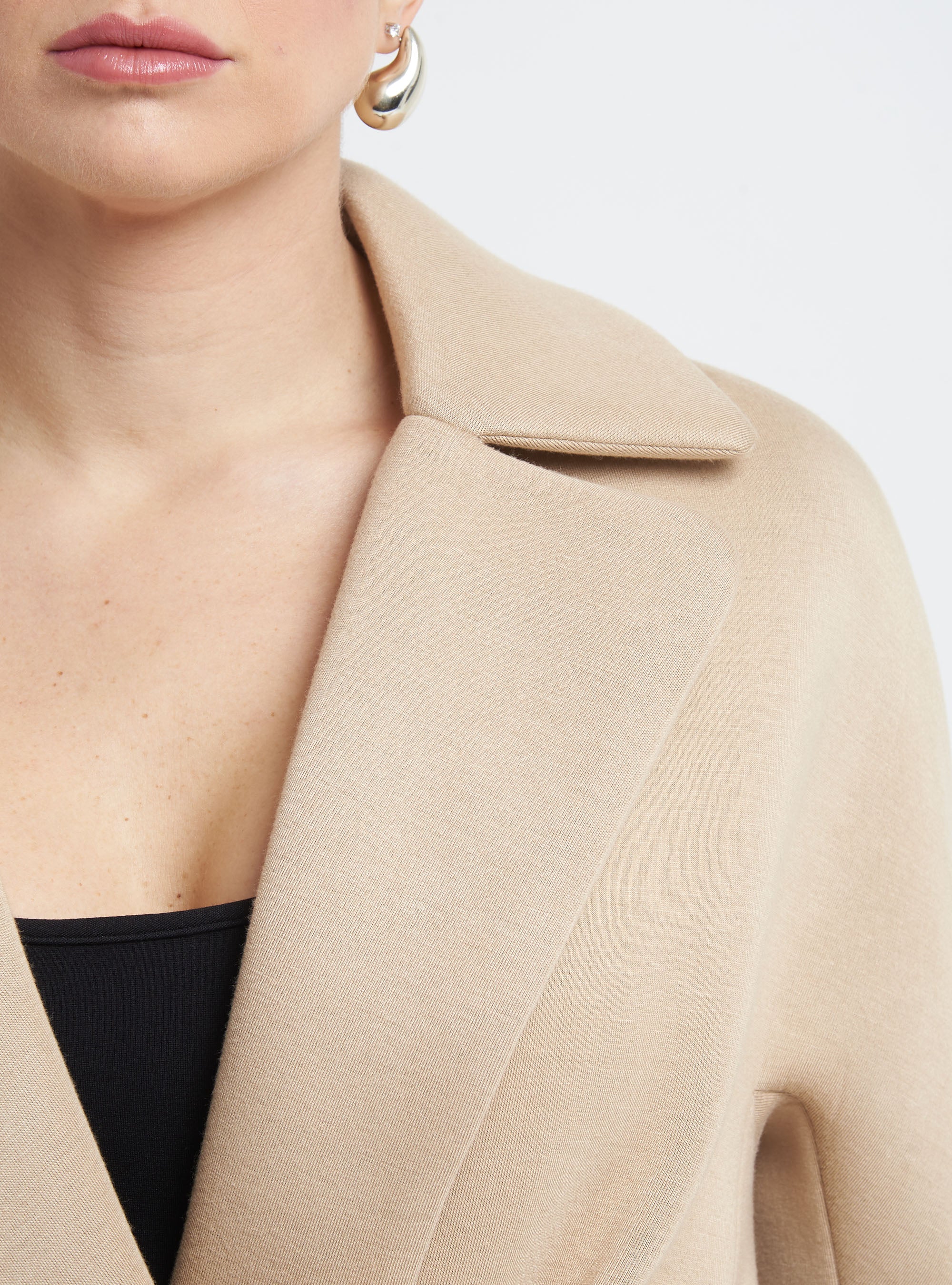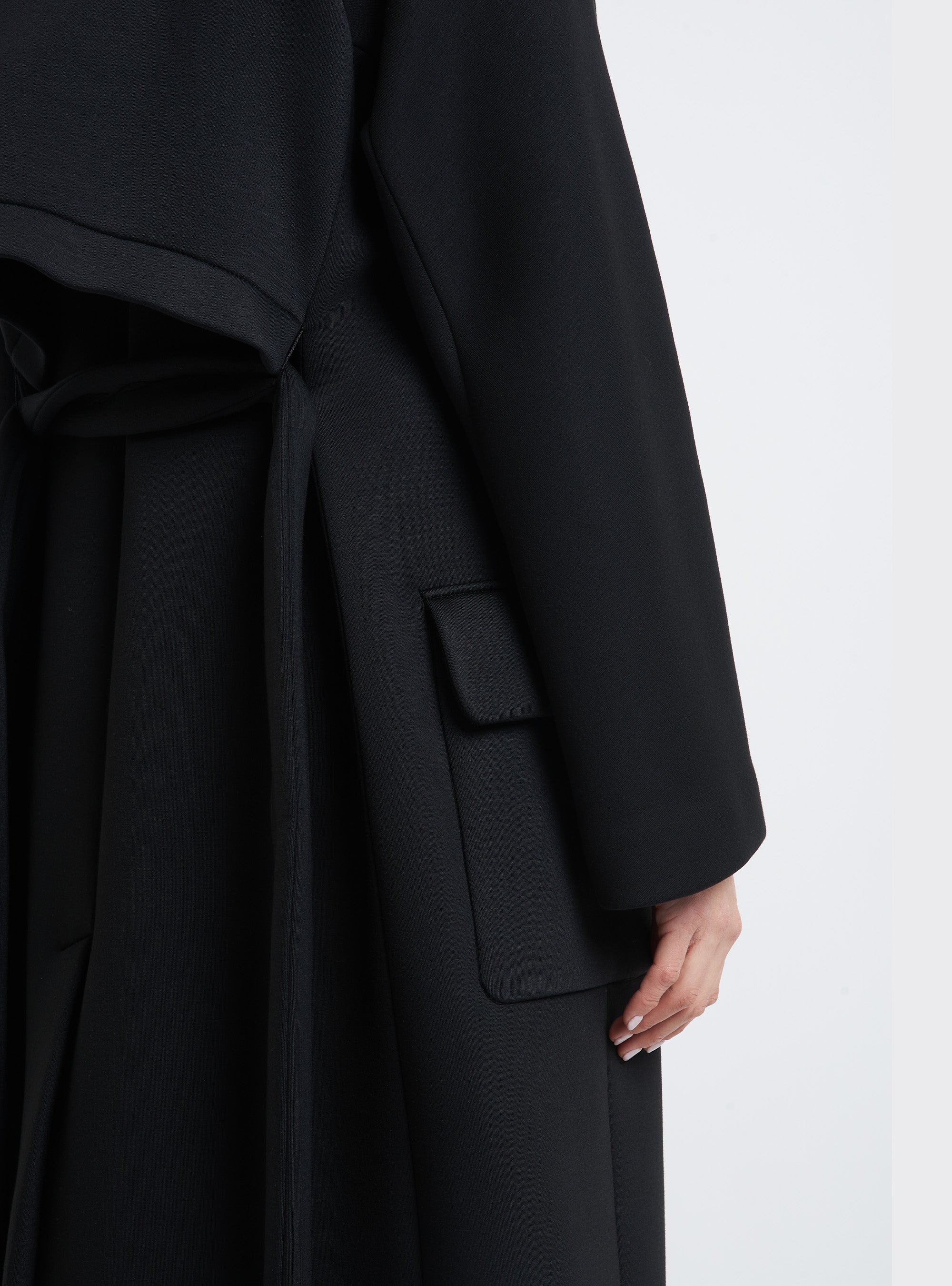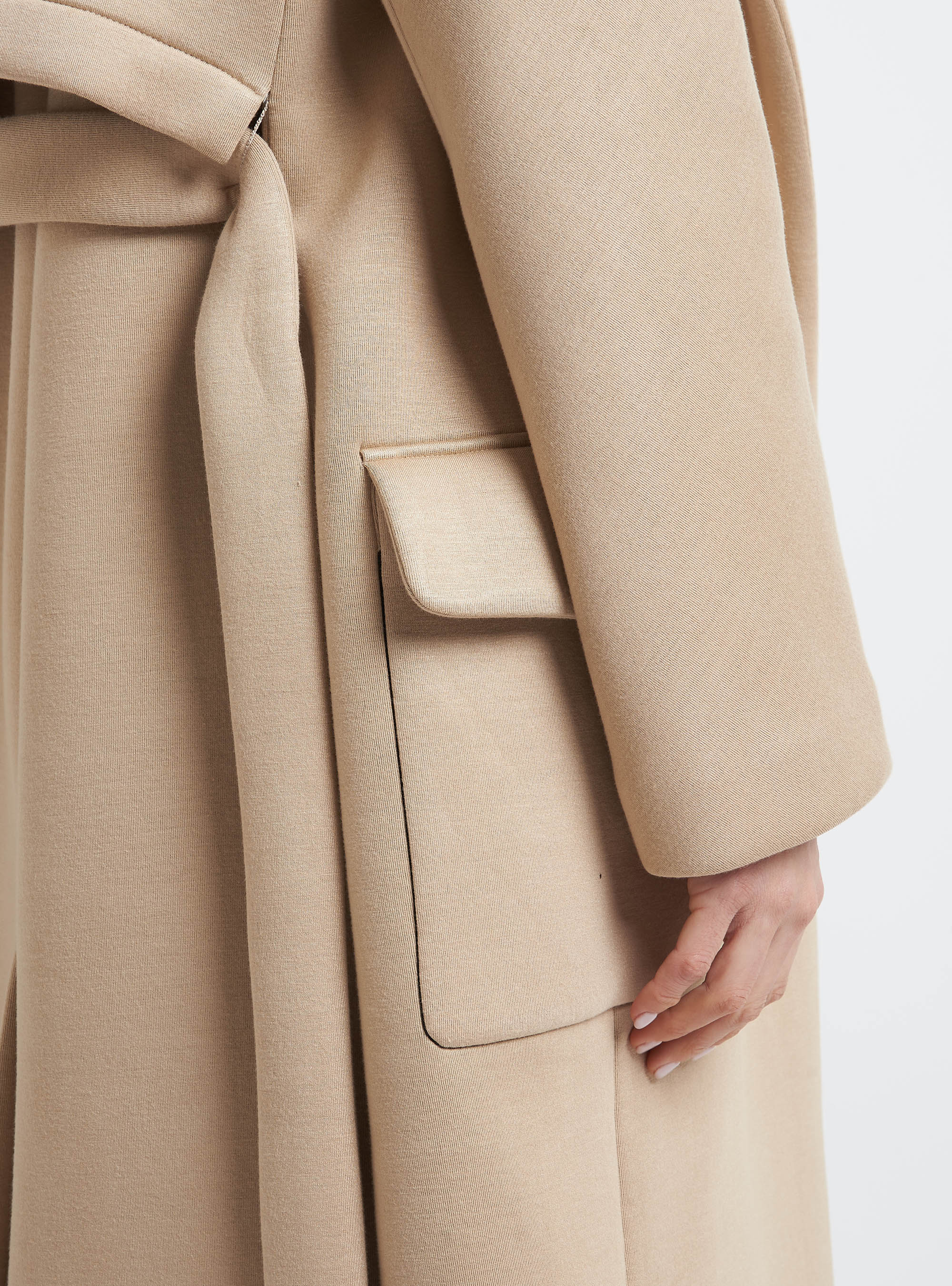 Double-breasted coat, regular fit. Equipped with patch pockets, matching fabric belt and back cape.