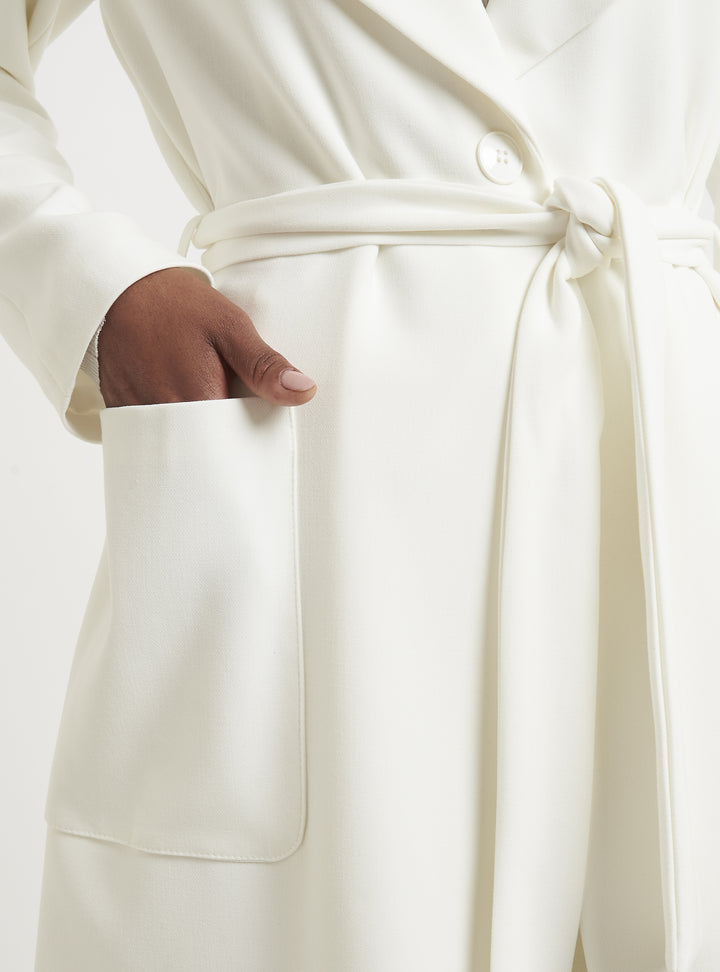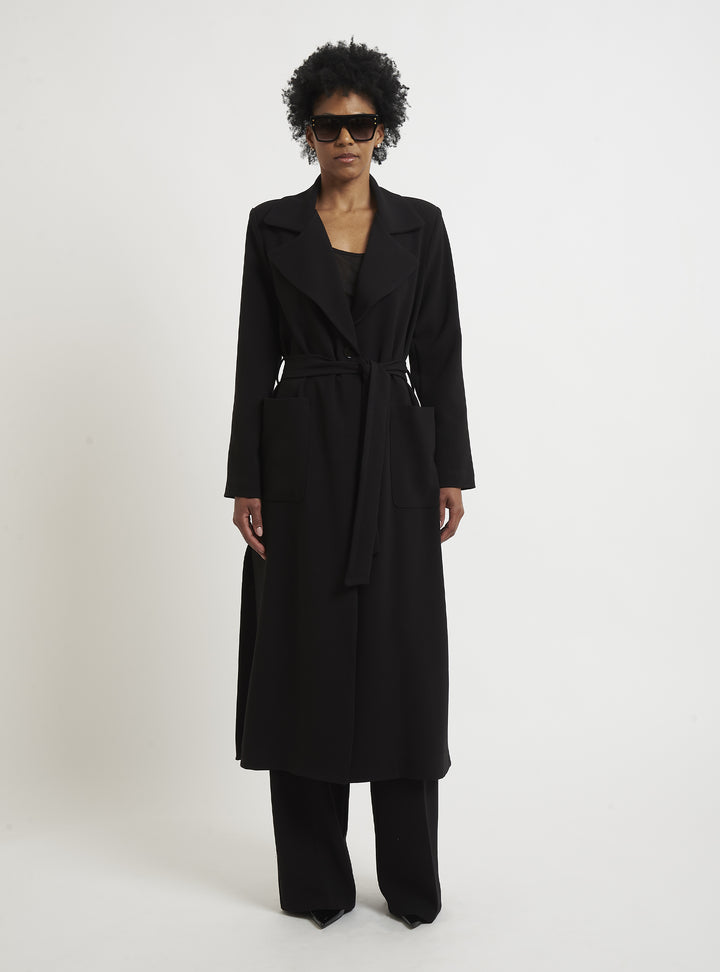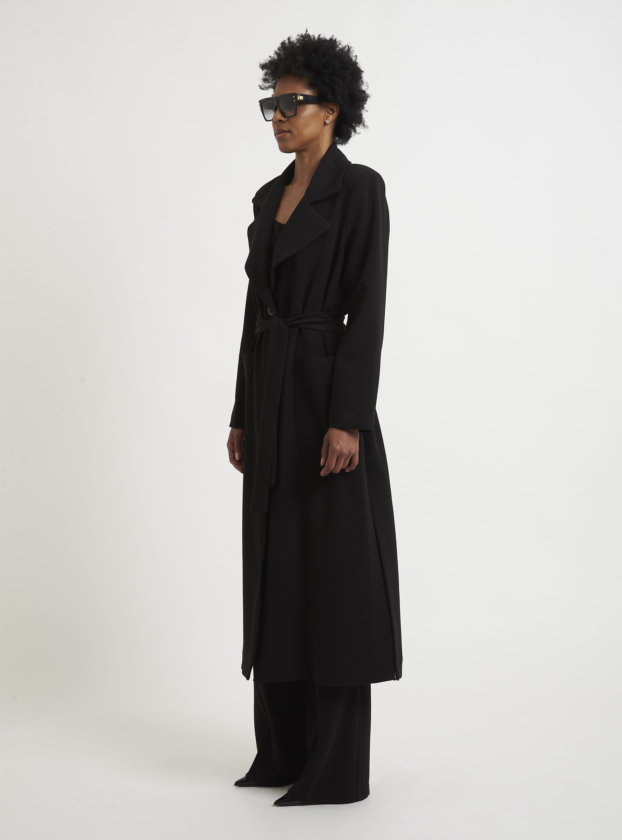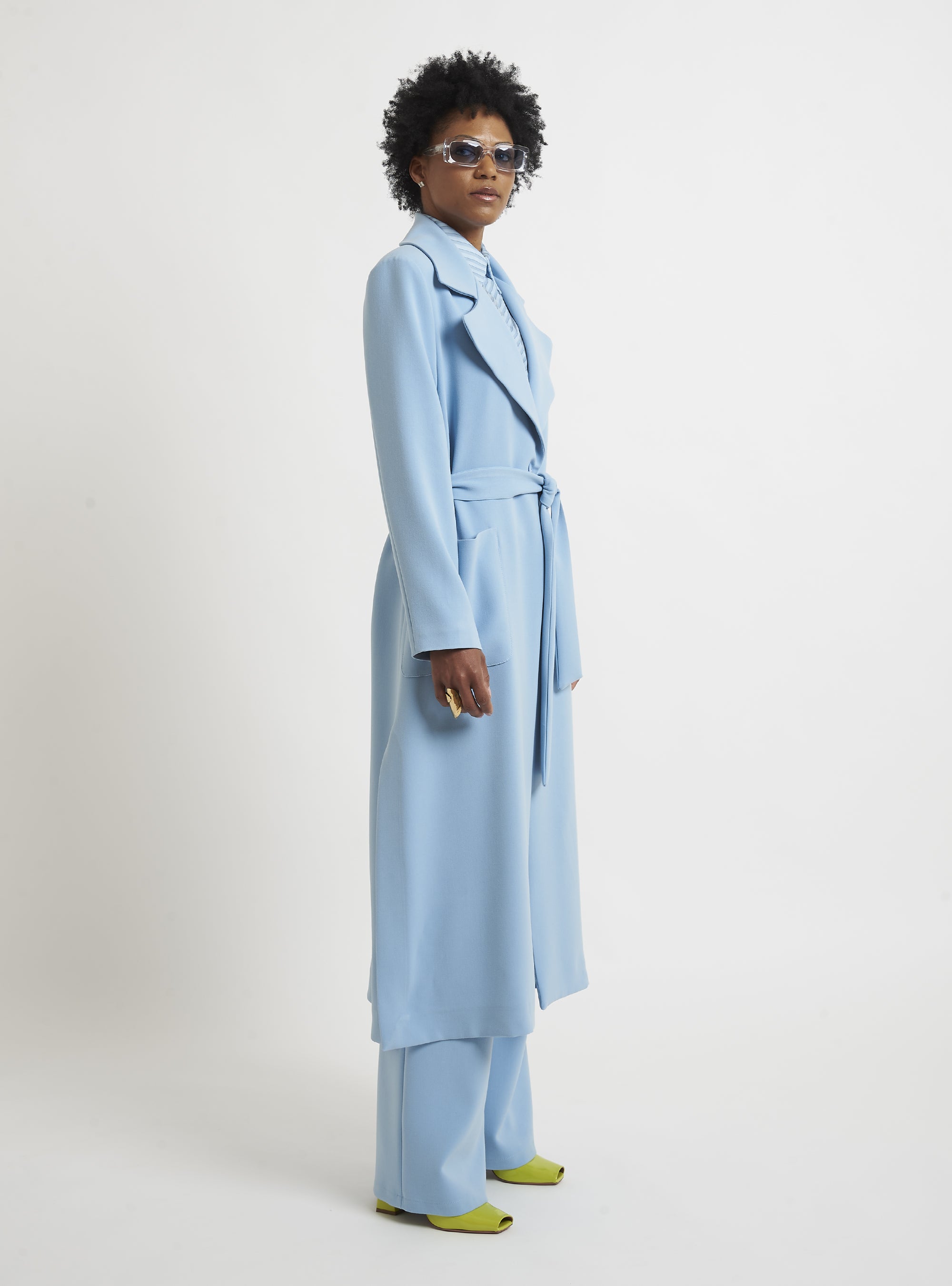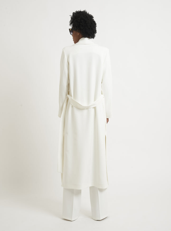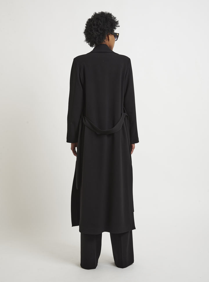 Long wool coat with a slim, tailored fit. It features a peak collar and an elongated back vent. True to size.