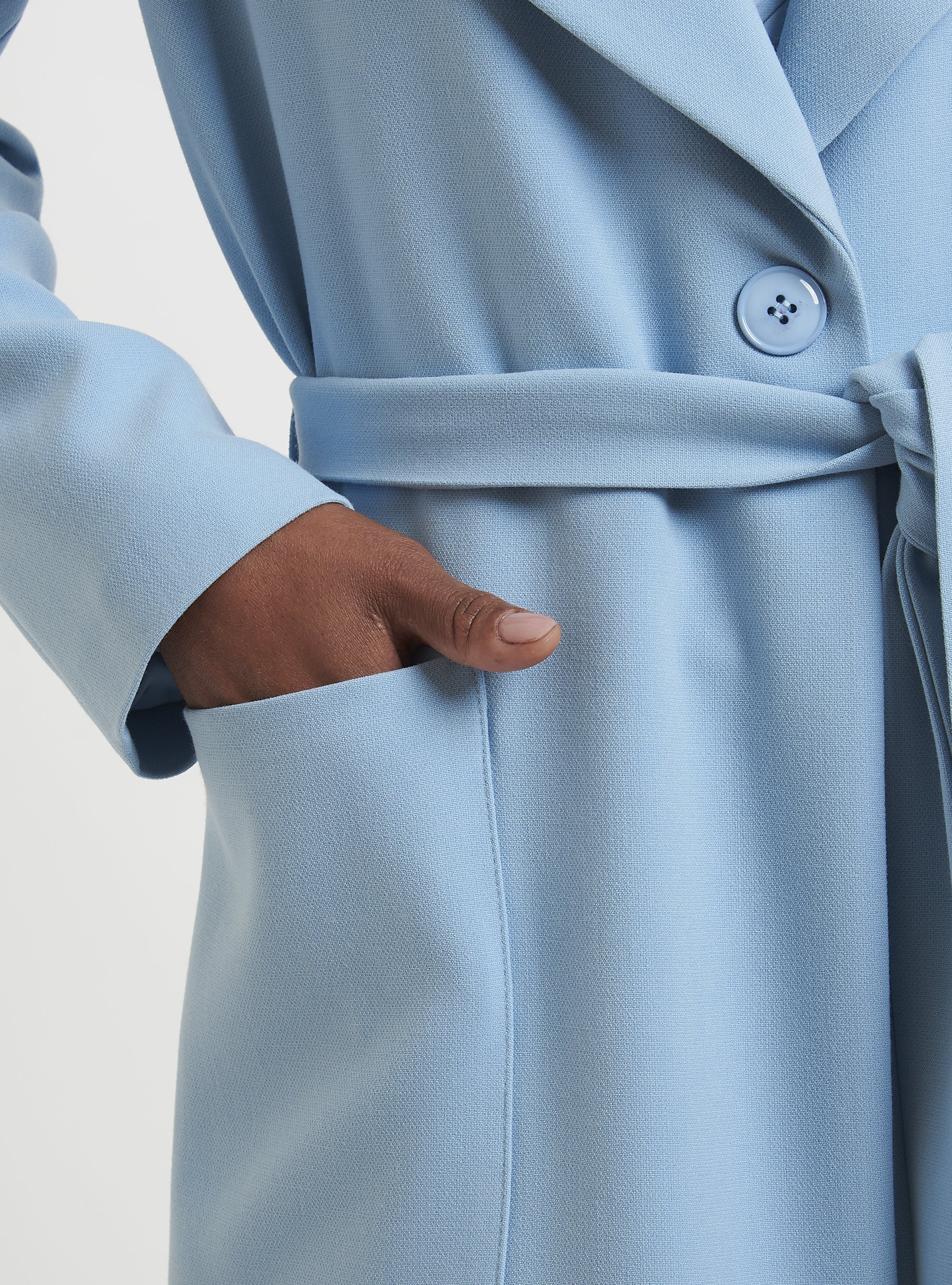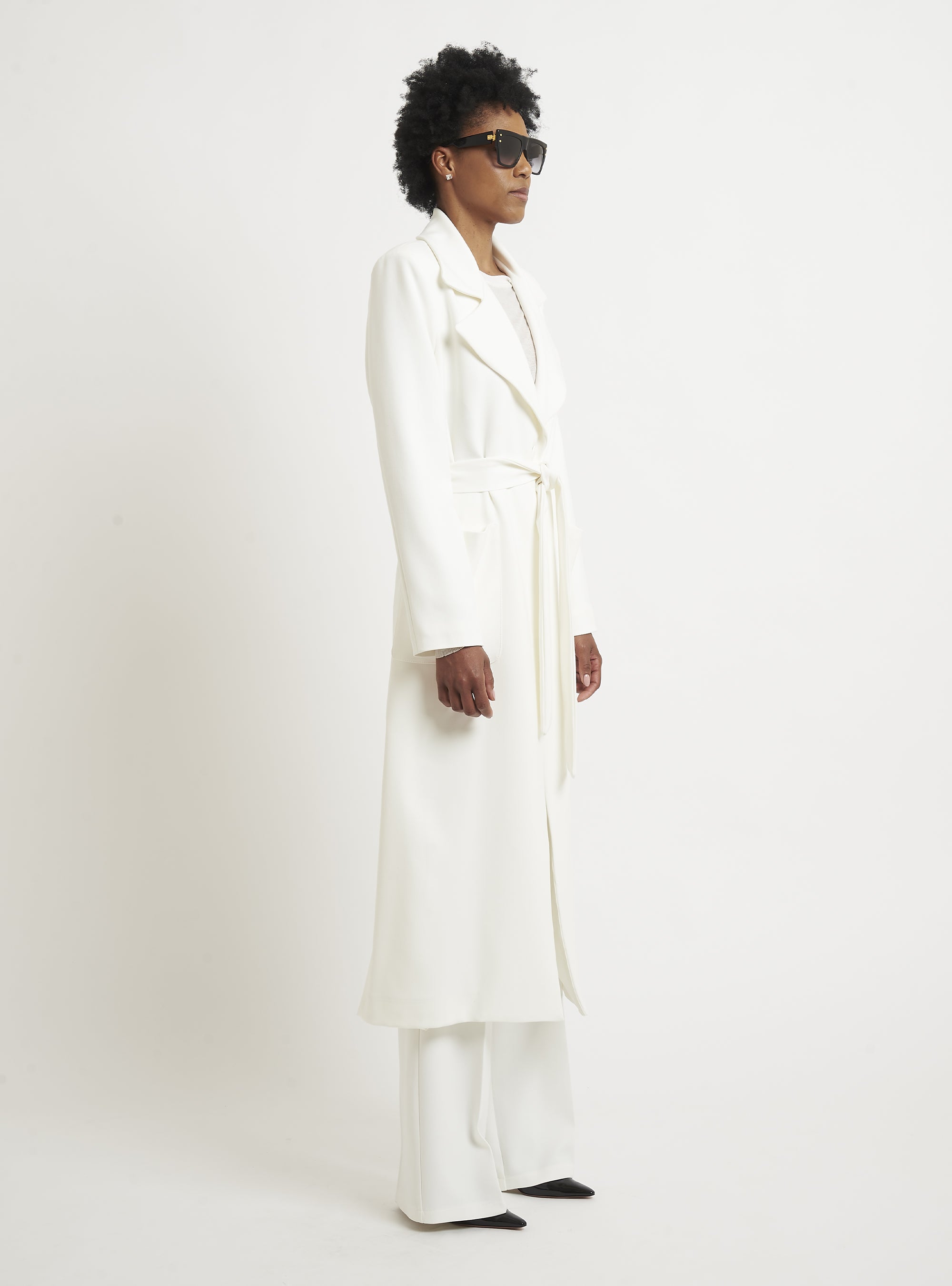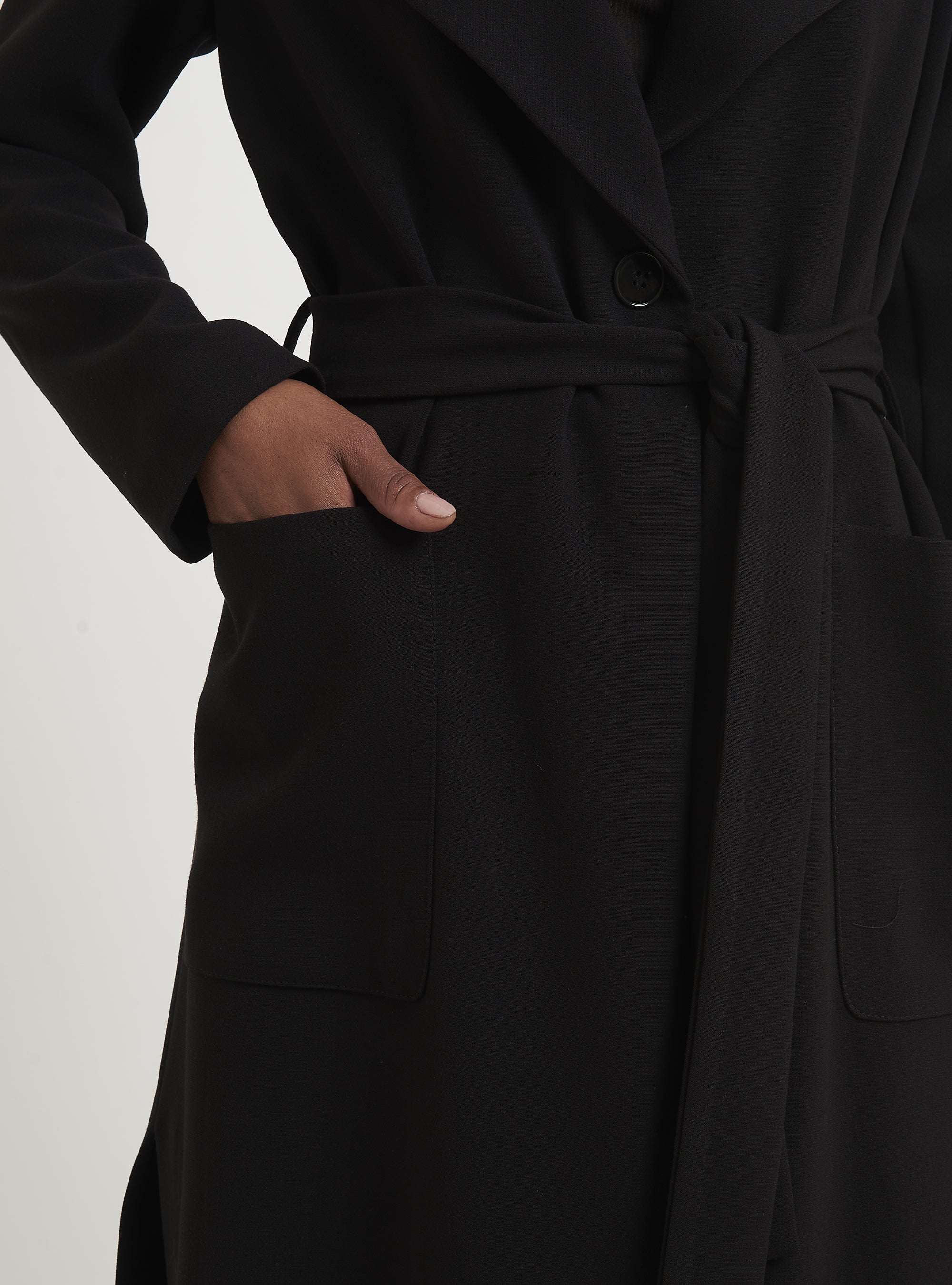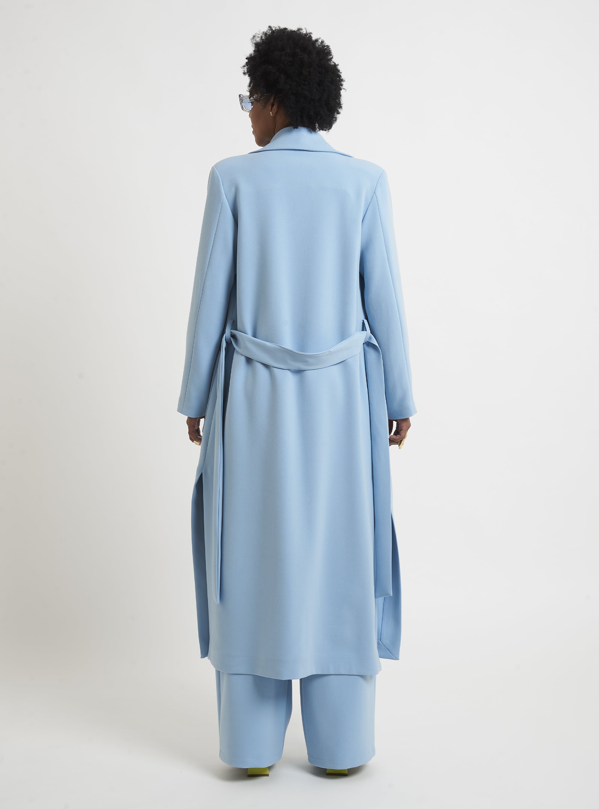 Long wool coat with a slim, tailored fit. It features a peak collar and an elongated back vent. True to size.