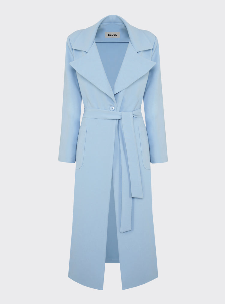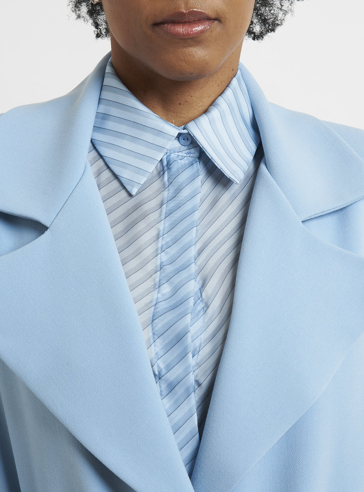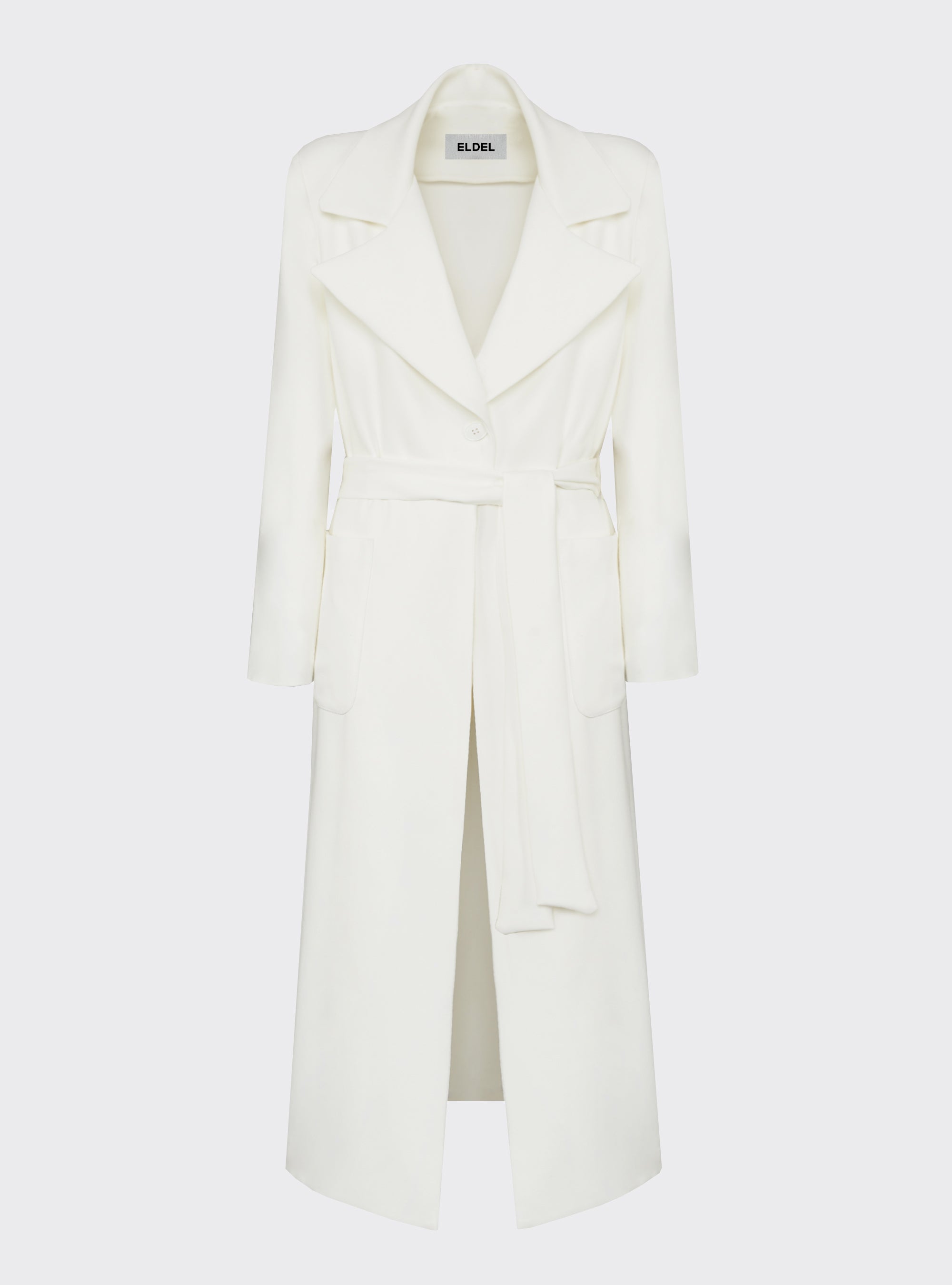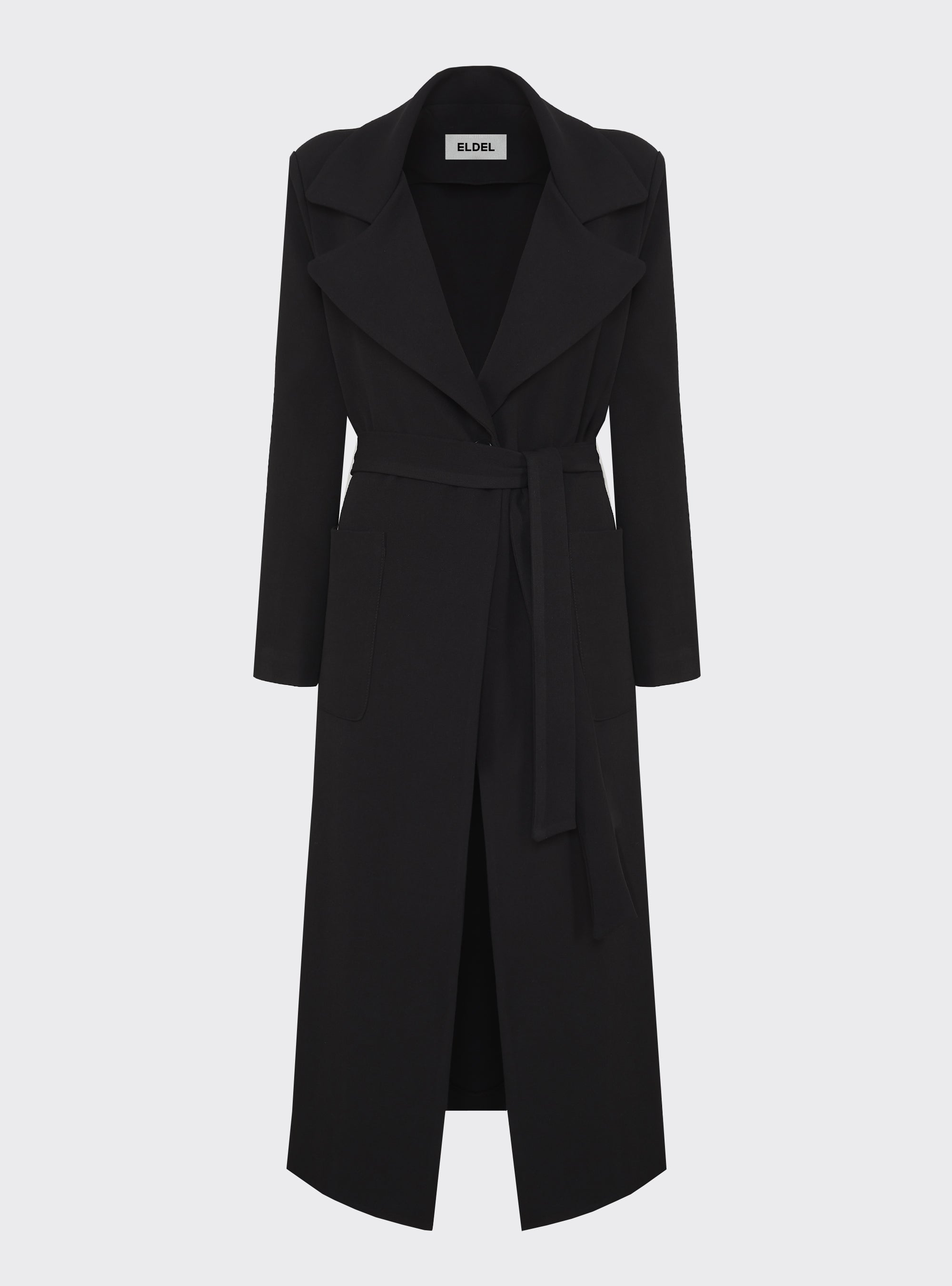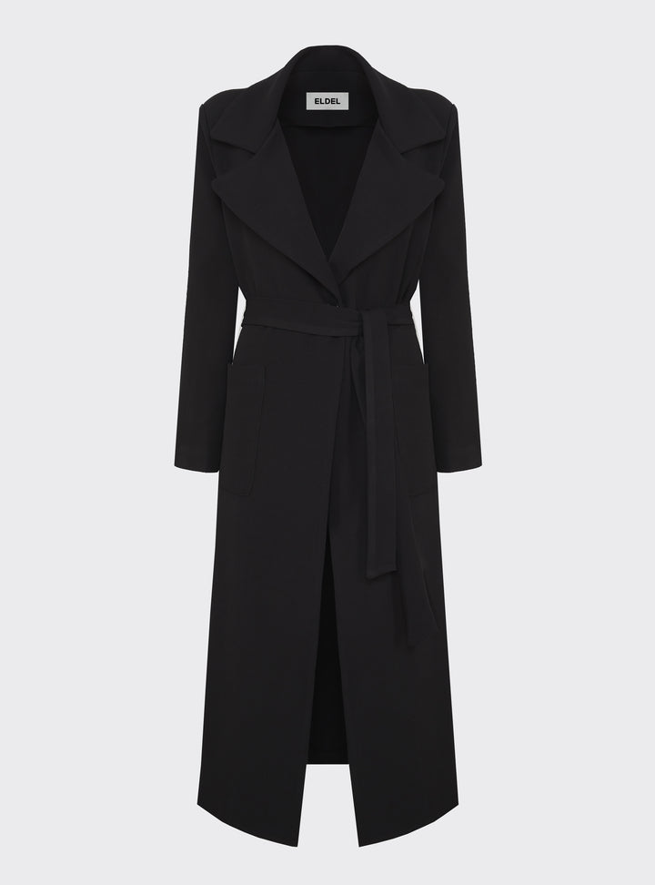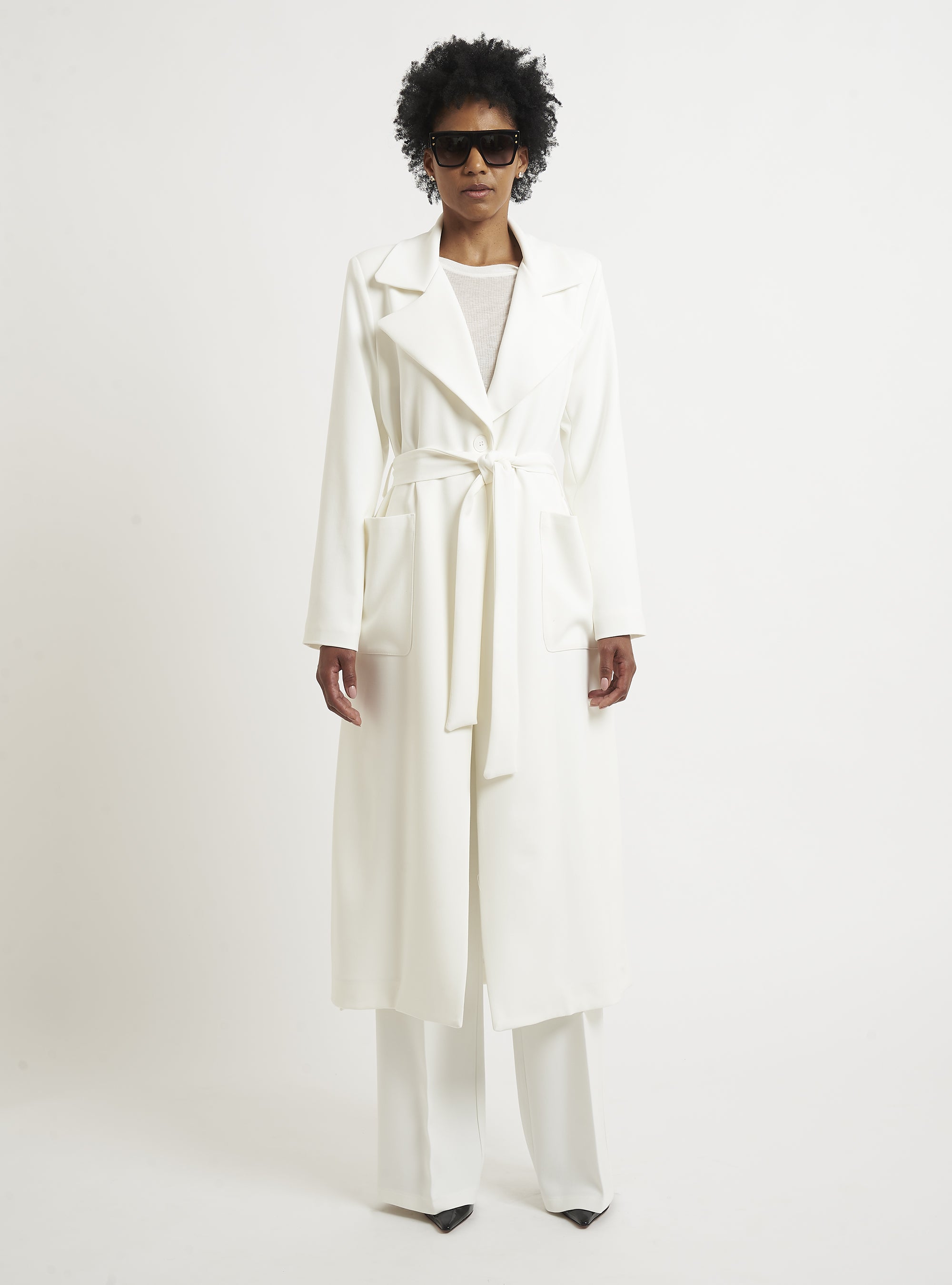 Long wool coat with a slim, tailored fit. It features a peak collar and an elongated back vent. True to size.