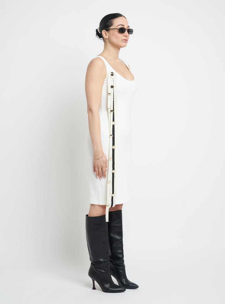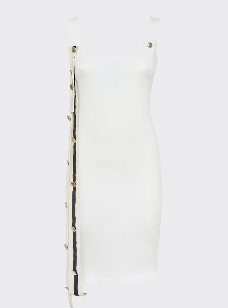 Knitted midi tank dress with wide double neckline featuring laces and buttons, Slim fit.