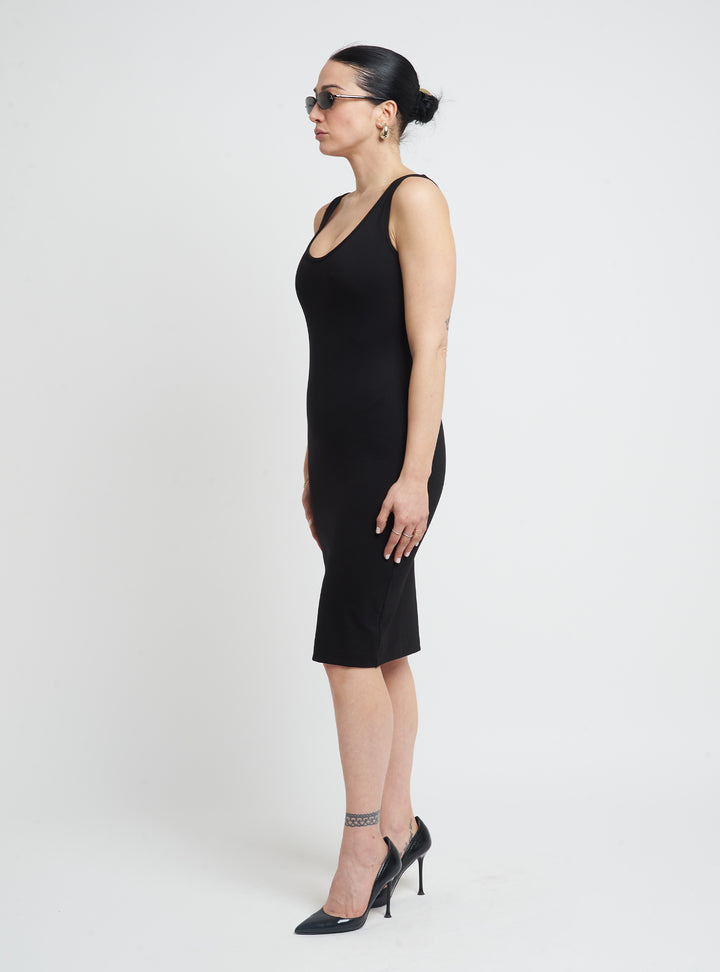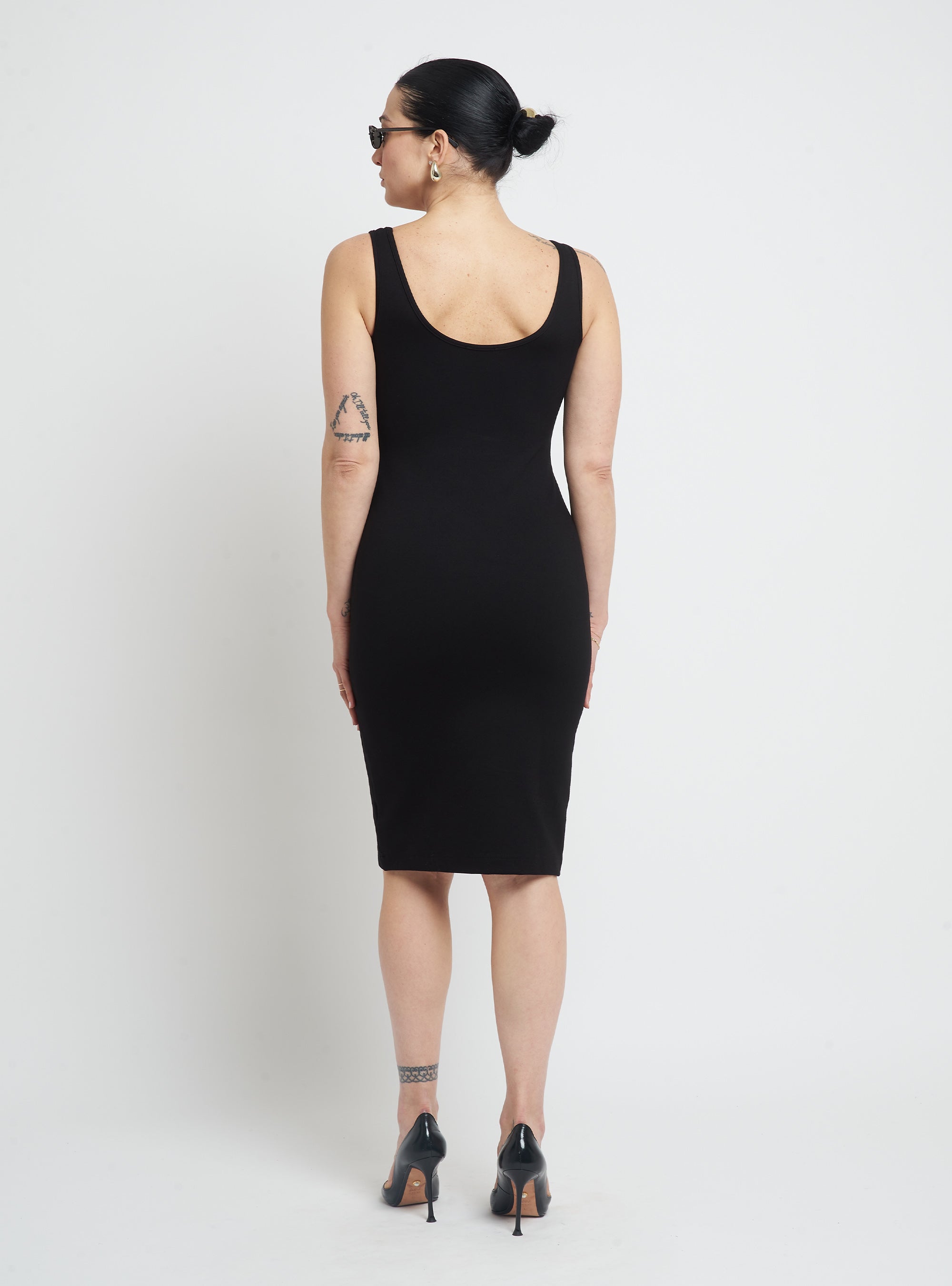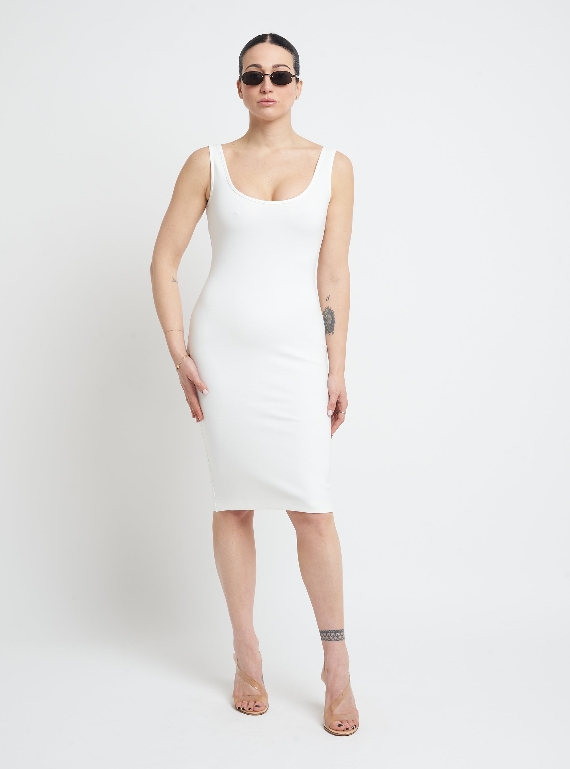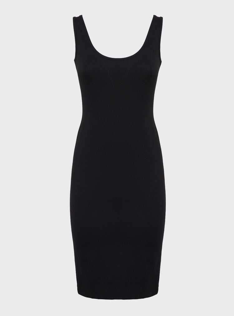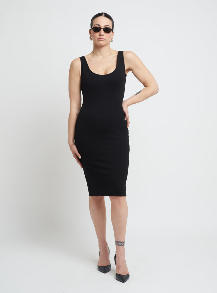 Knitted midi tank dress with wide double neckline, Slim fit.