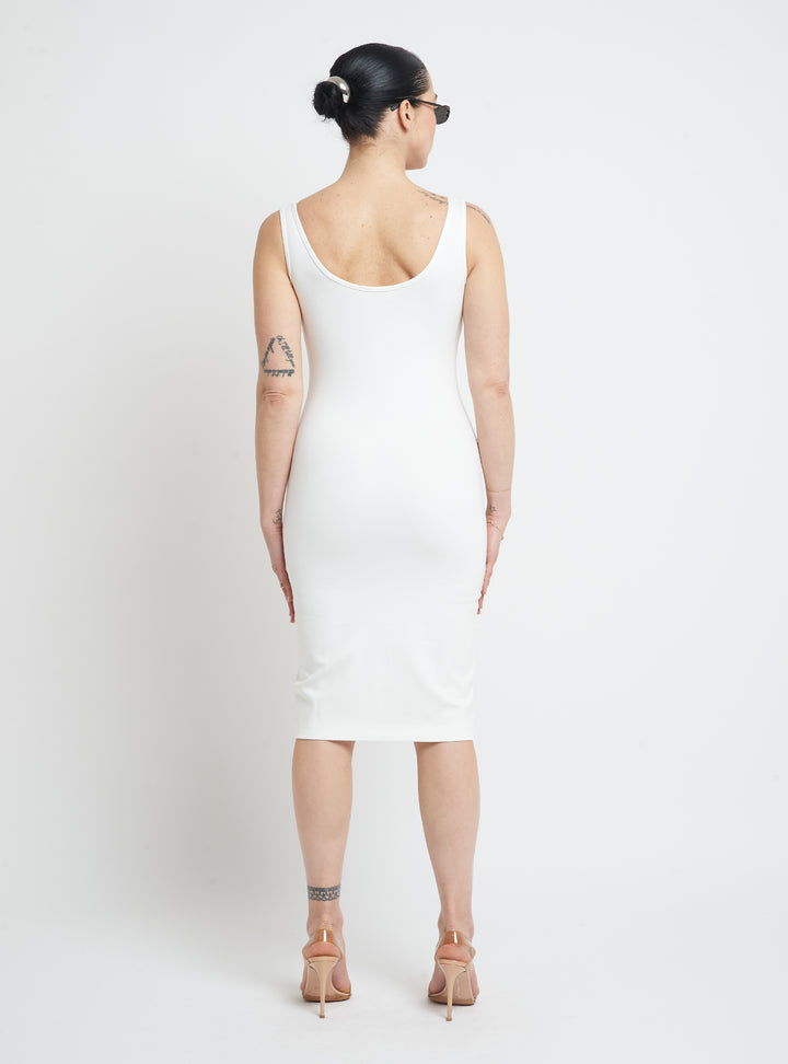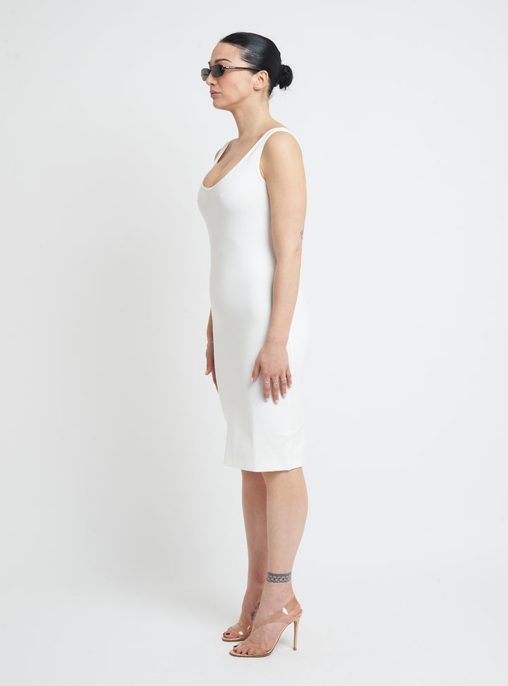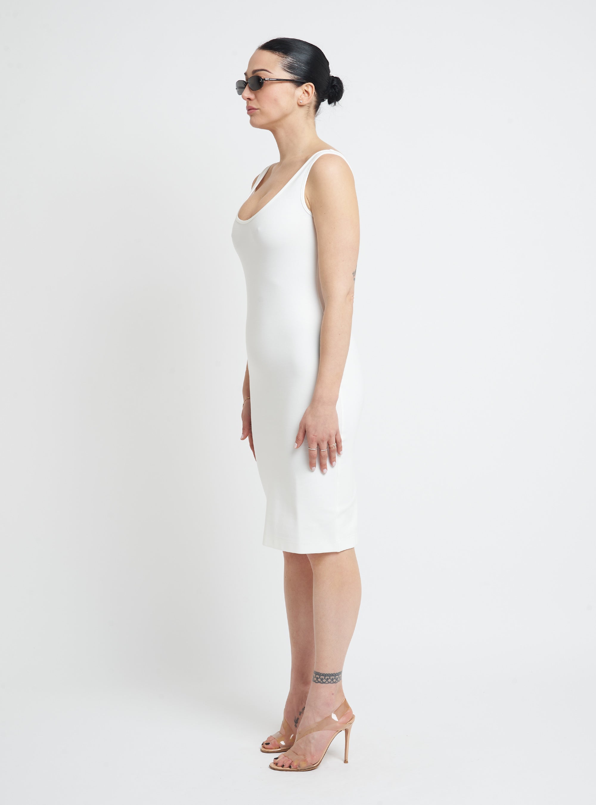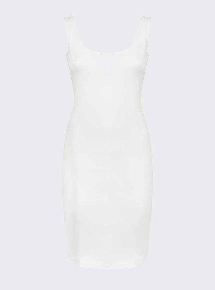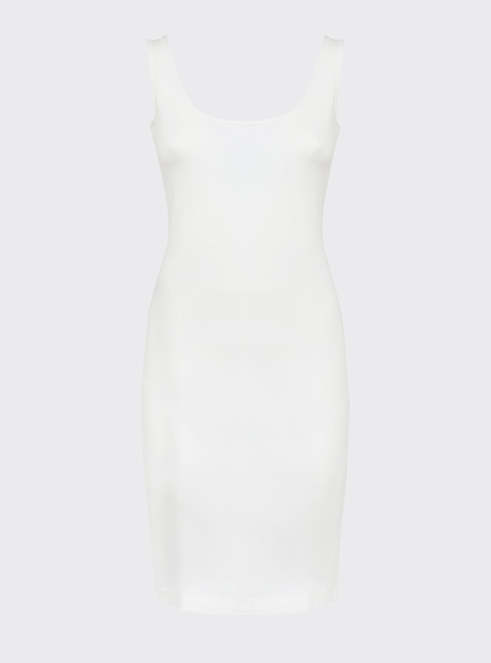 Knitted midi tank dress with wide double neckline, Slim fit.