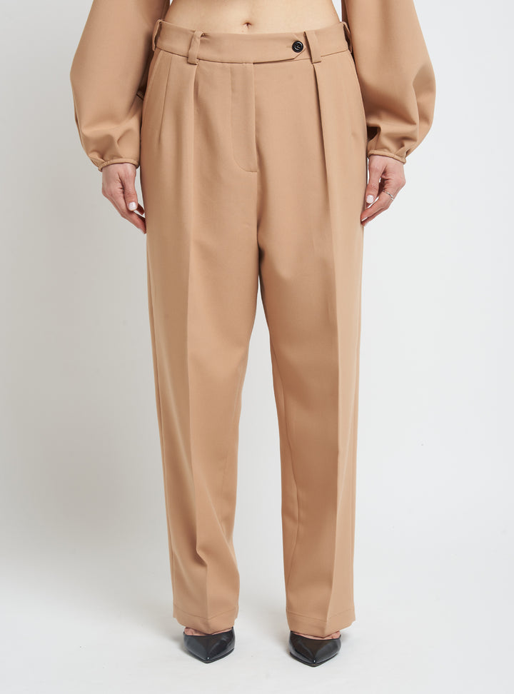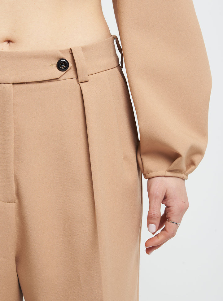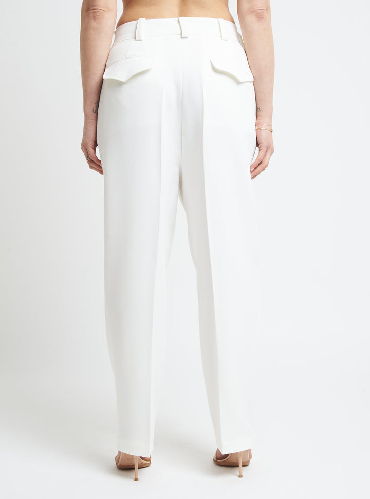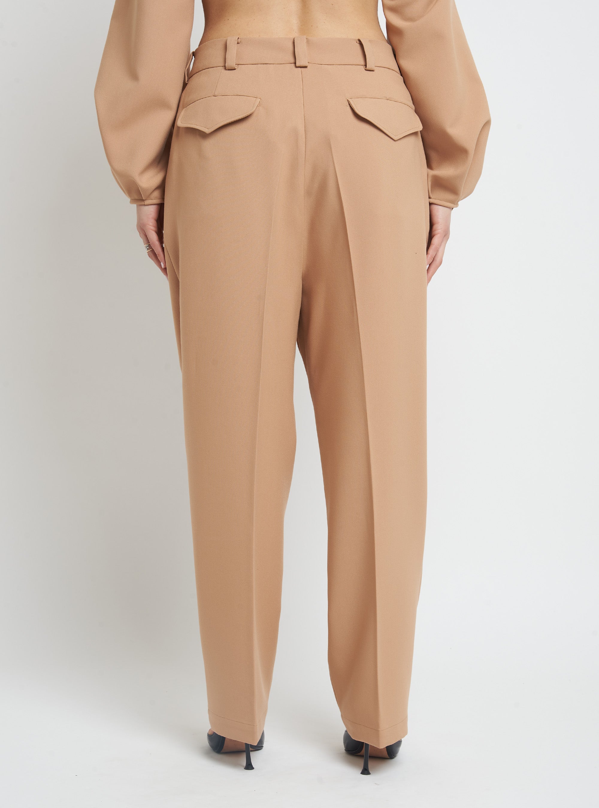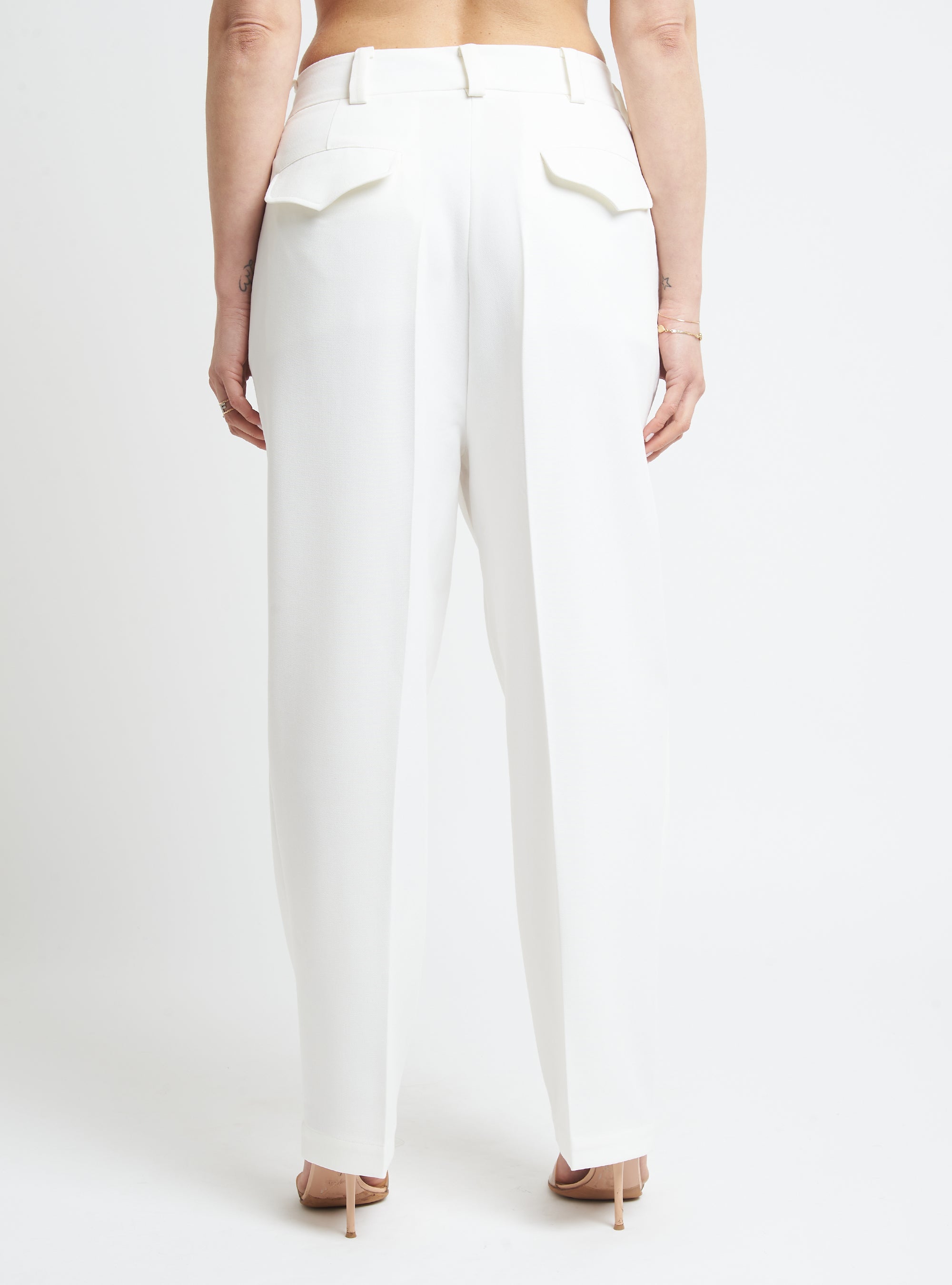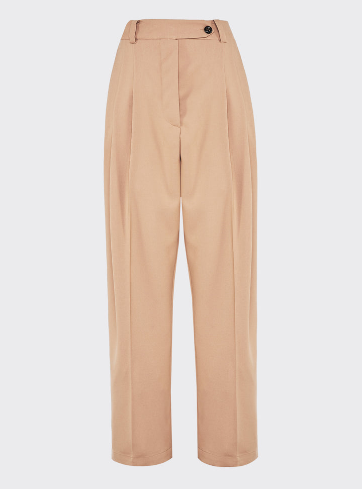 Mid-rise trousers. Front pleats and a relaxed rise create a fuller leg that tapers at the ankle for a slight carrot shape.