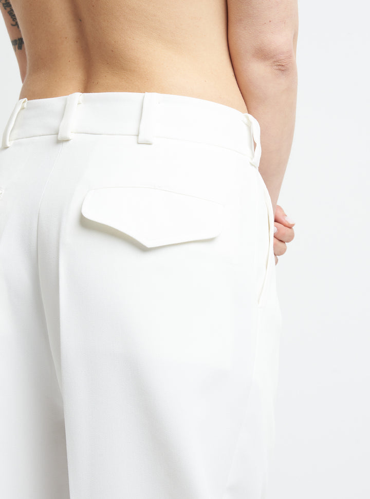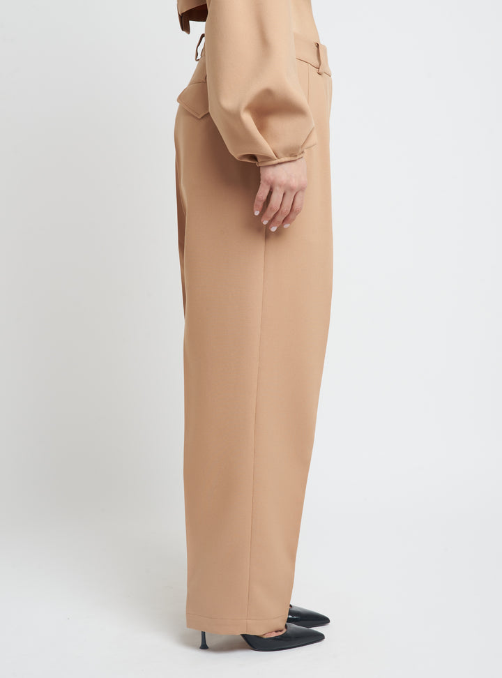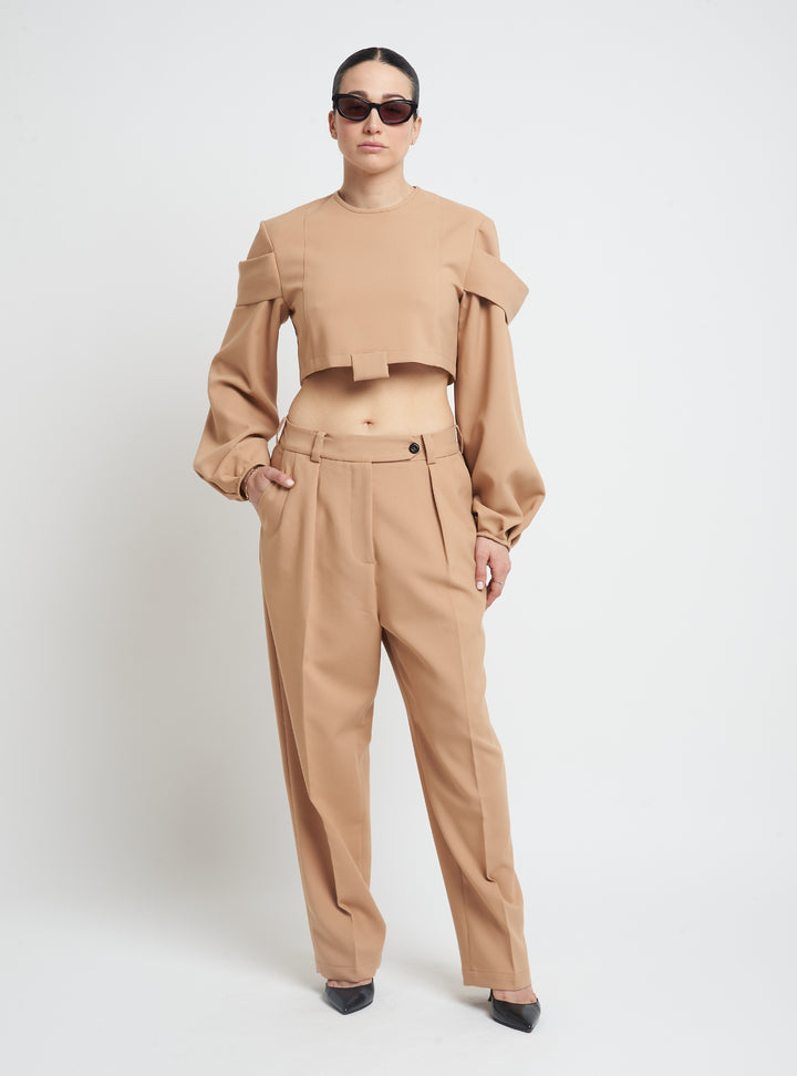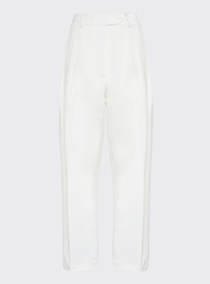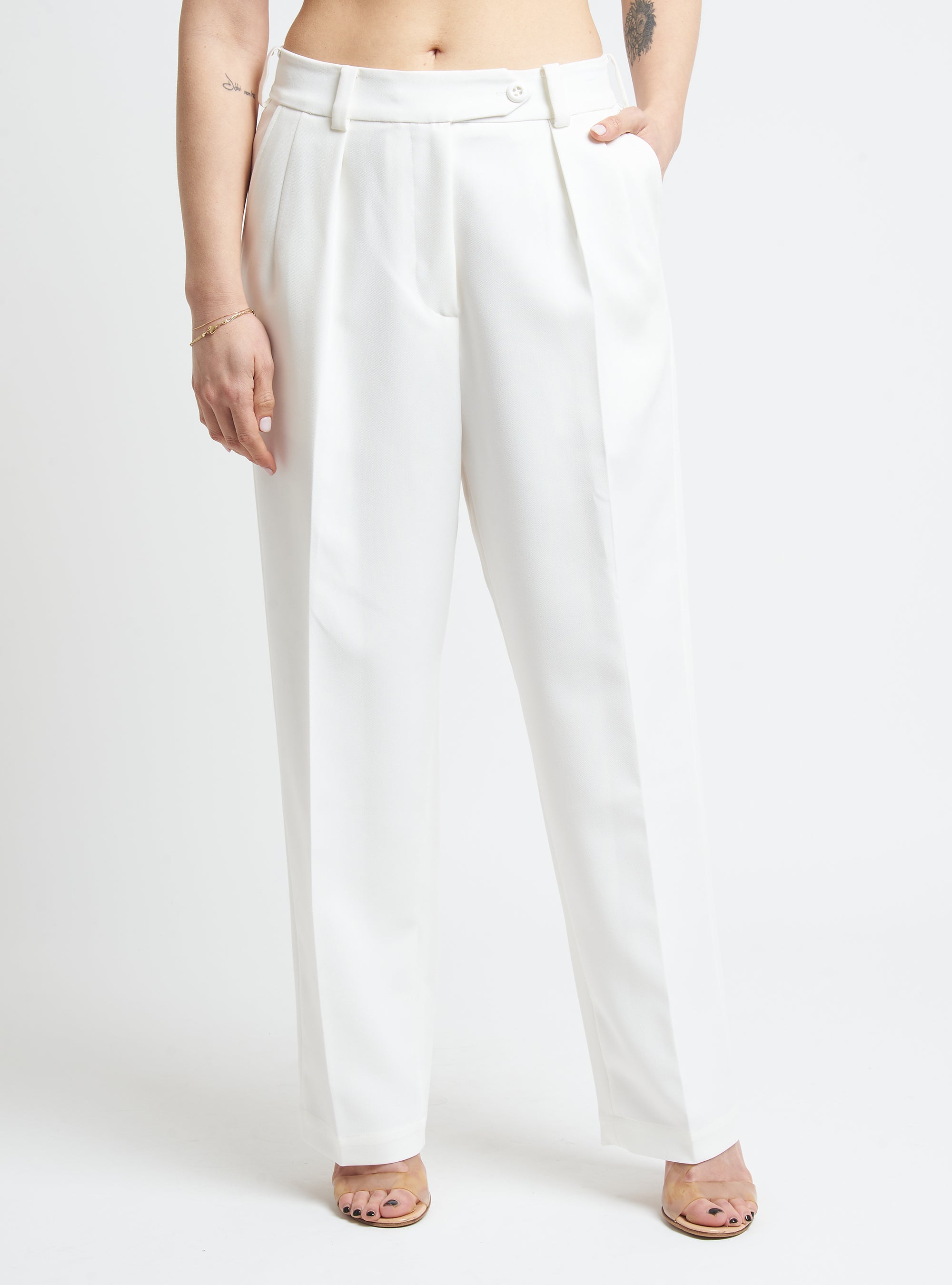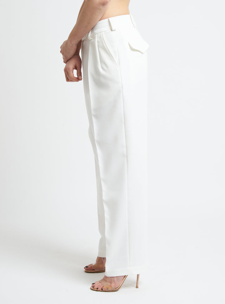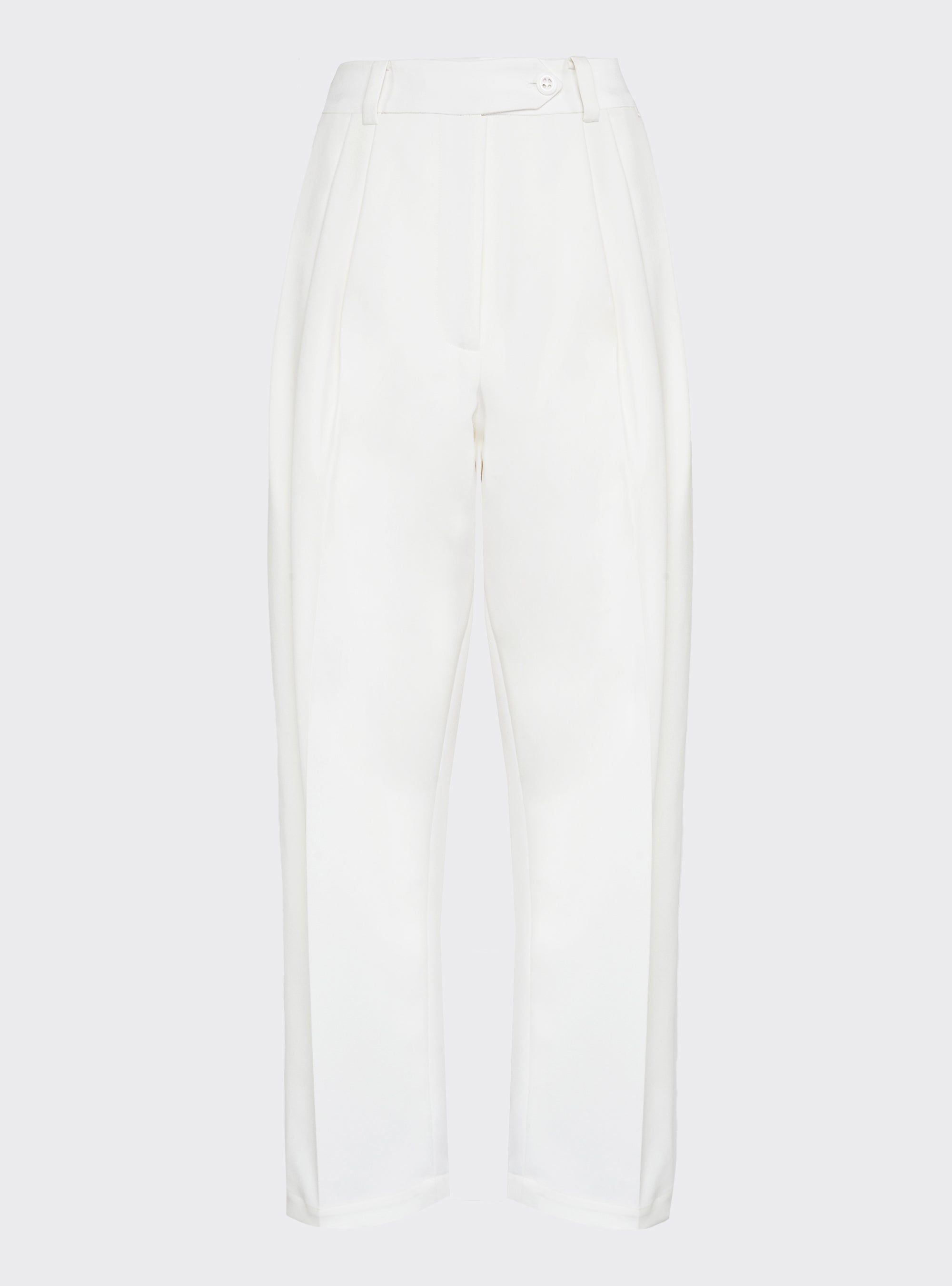 Mid-rise trousers. Front pleats and a relaxed rise create a fuller leg that tapers at the ankle for a slight carrot shape.