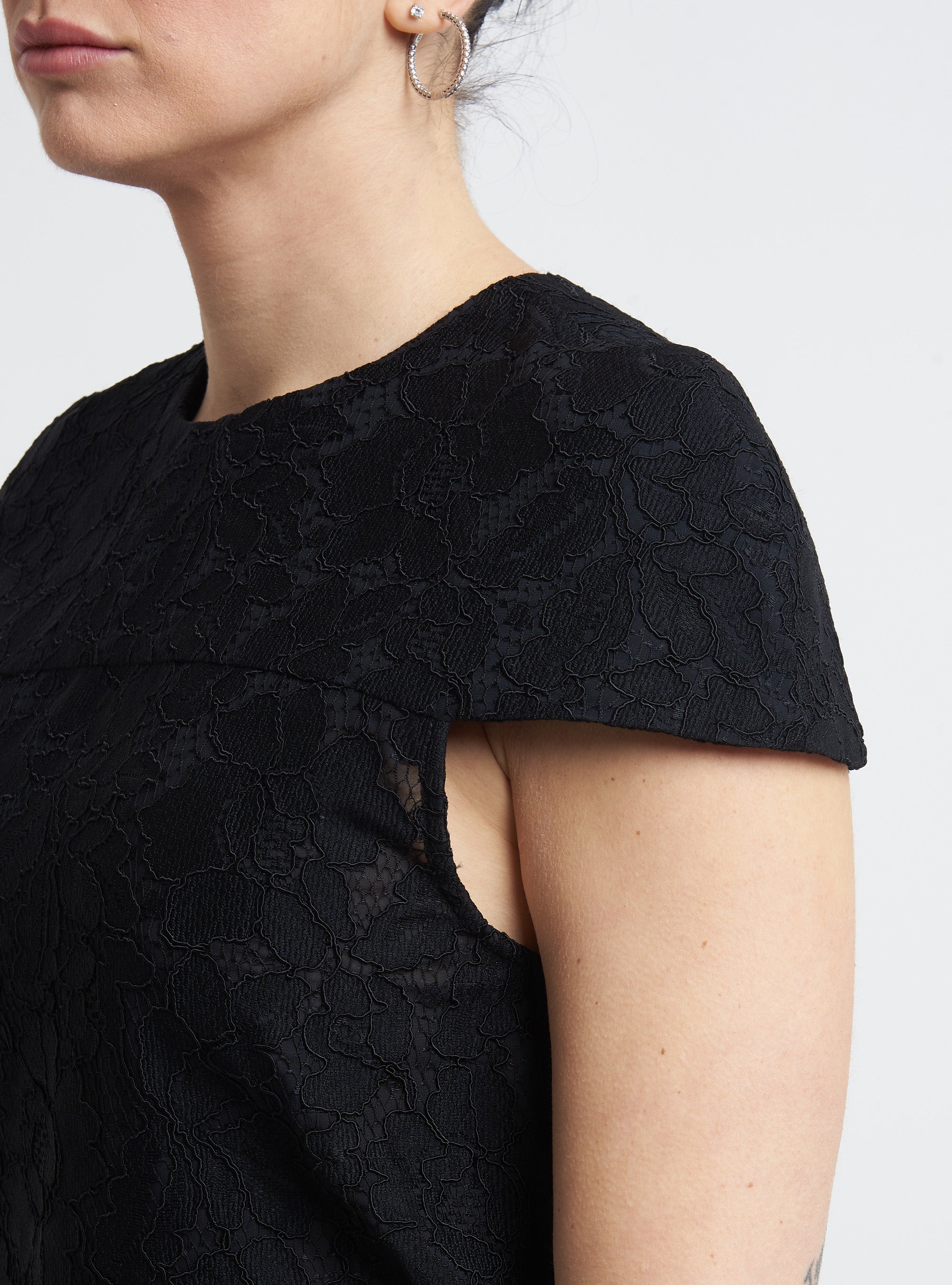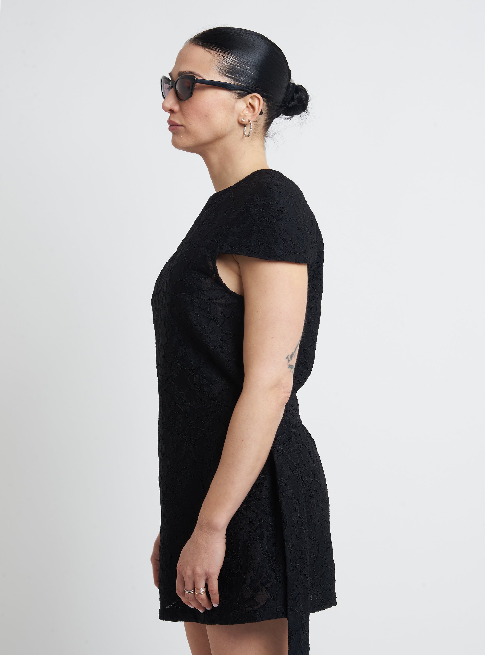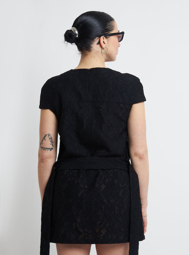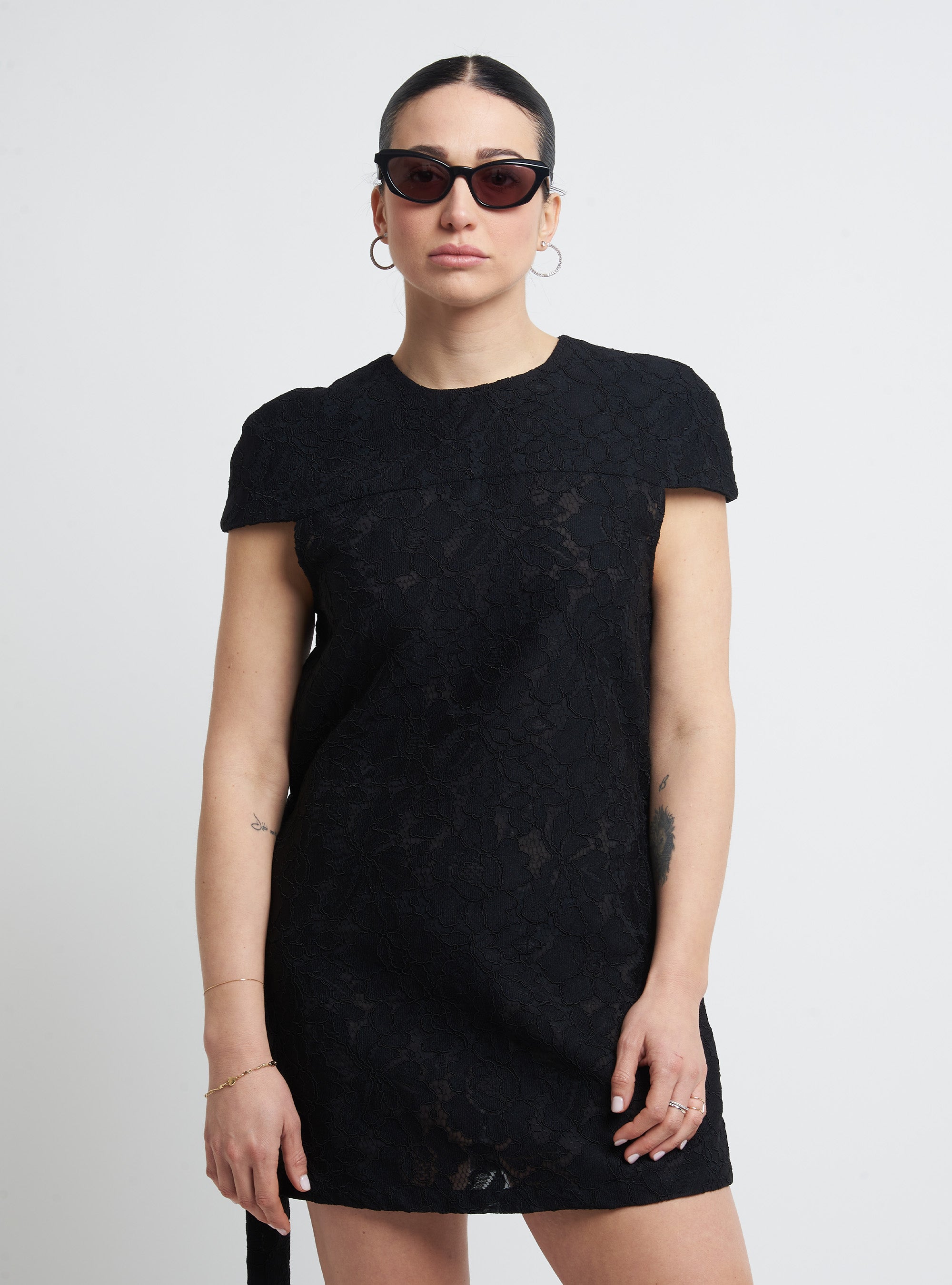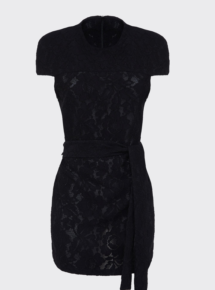 Mini dress with cape on the shoulders and removable belt at the waist.