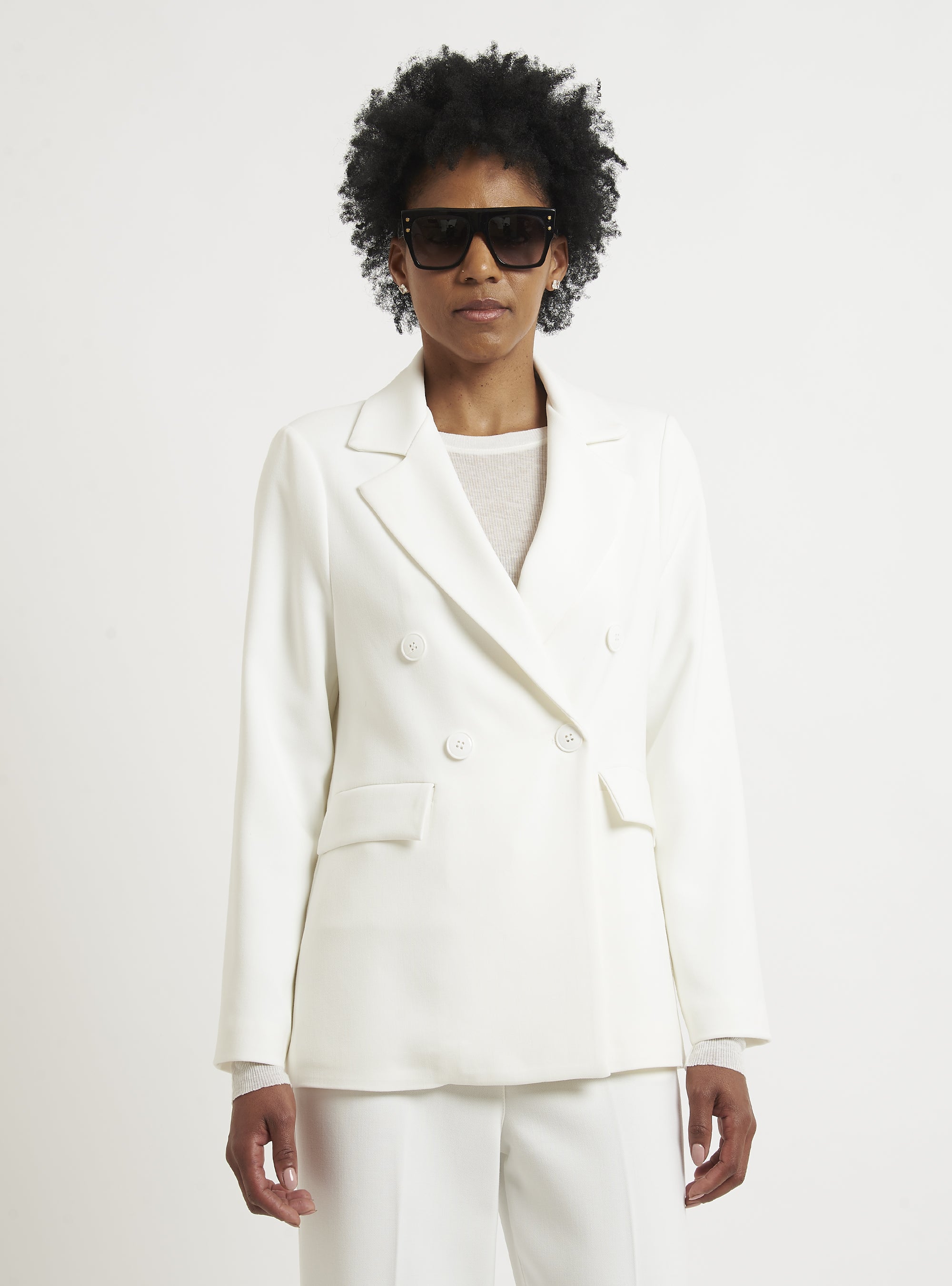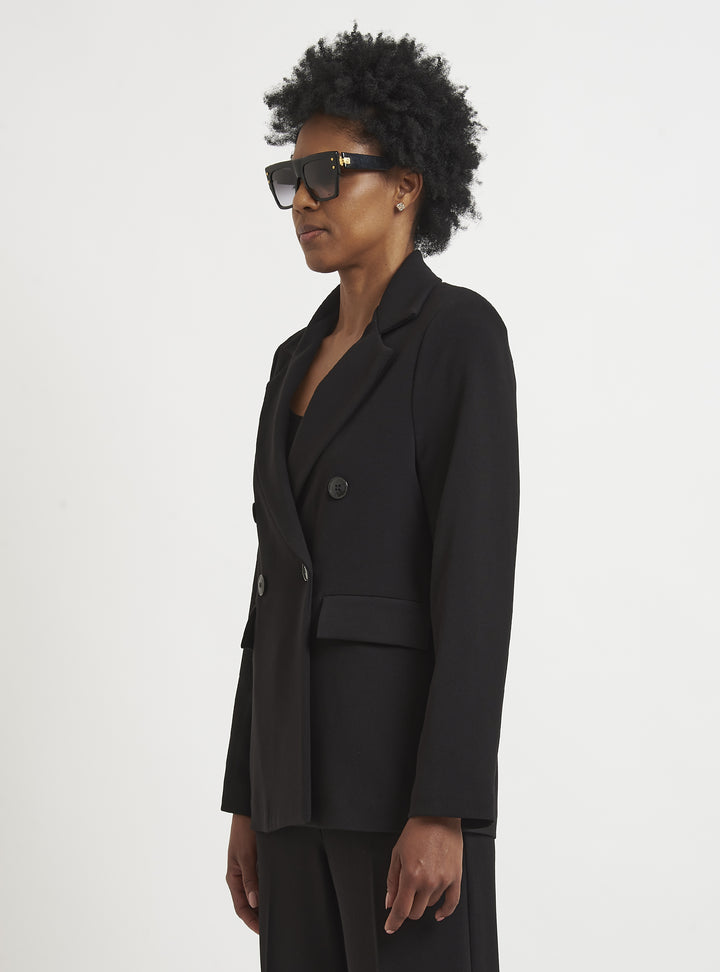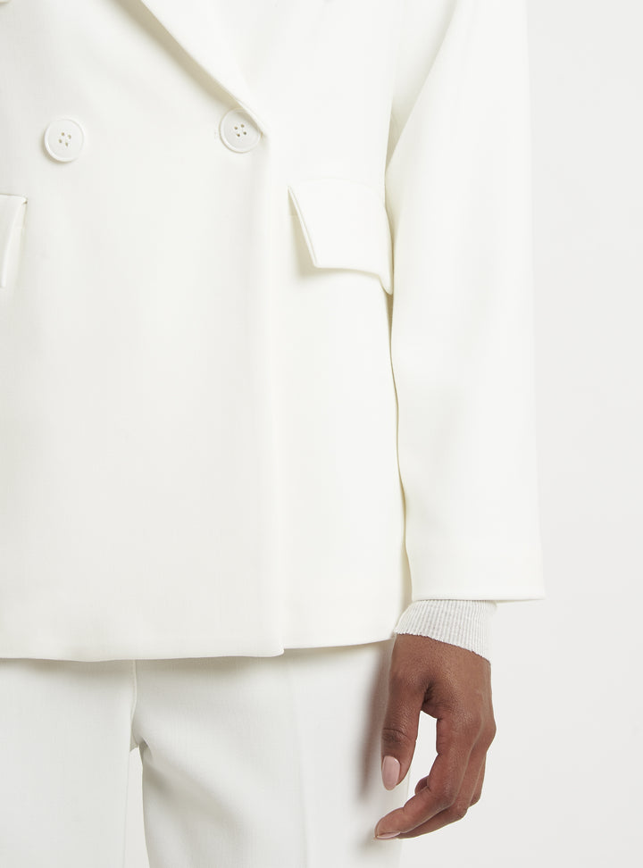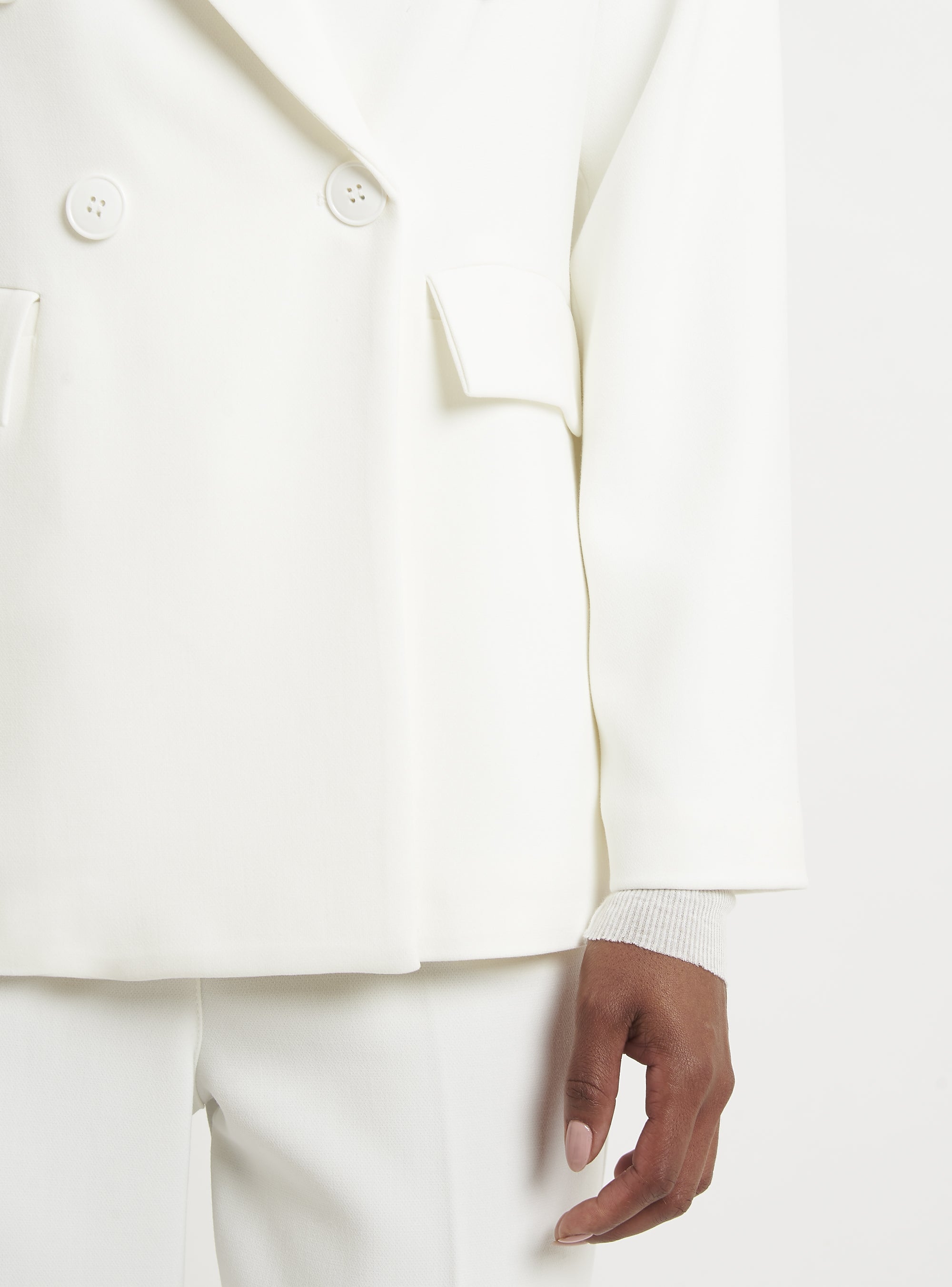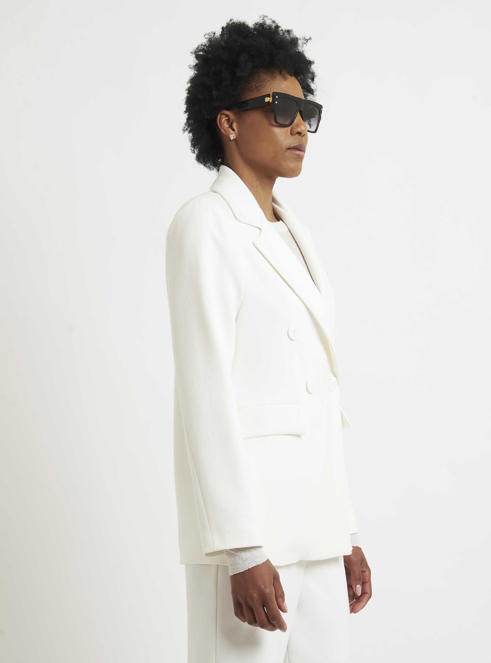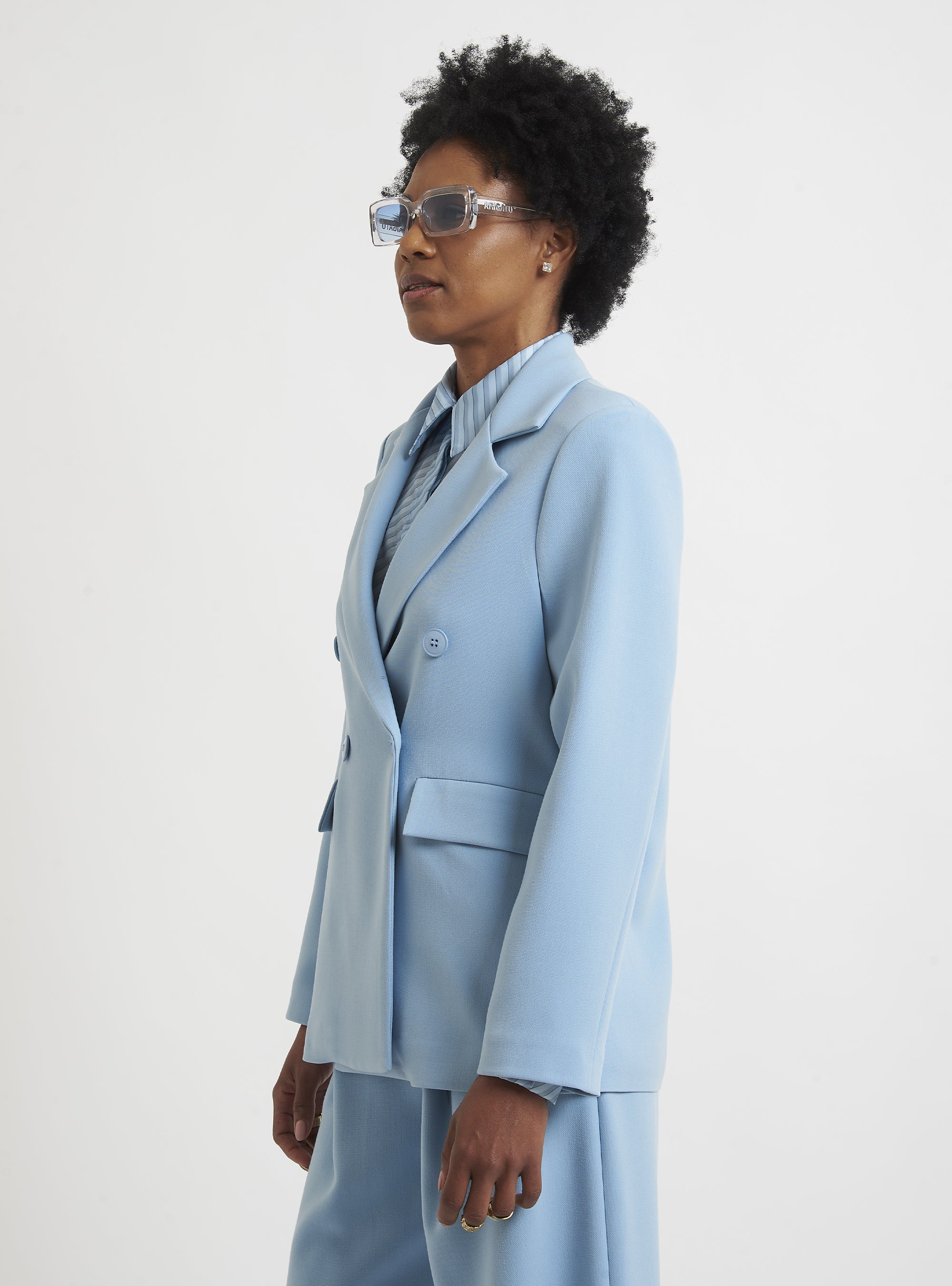 Double-breasted wool jacket. Boxy fit with peak collar and flap pockets. Versatile and suitable for any occasion. Fits true to size.
