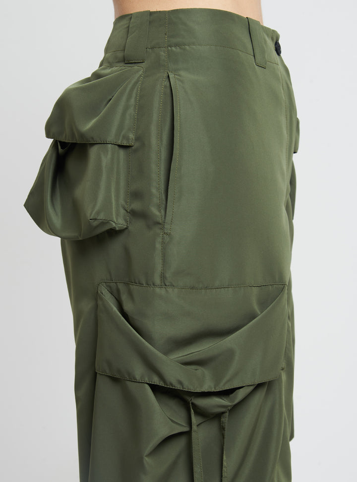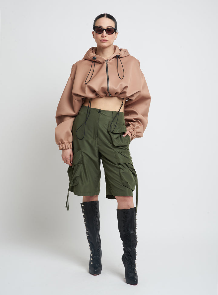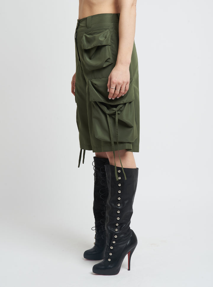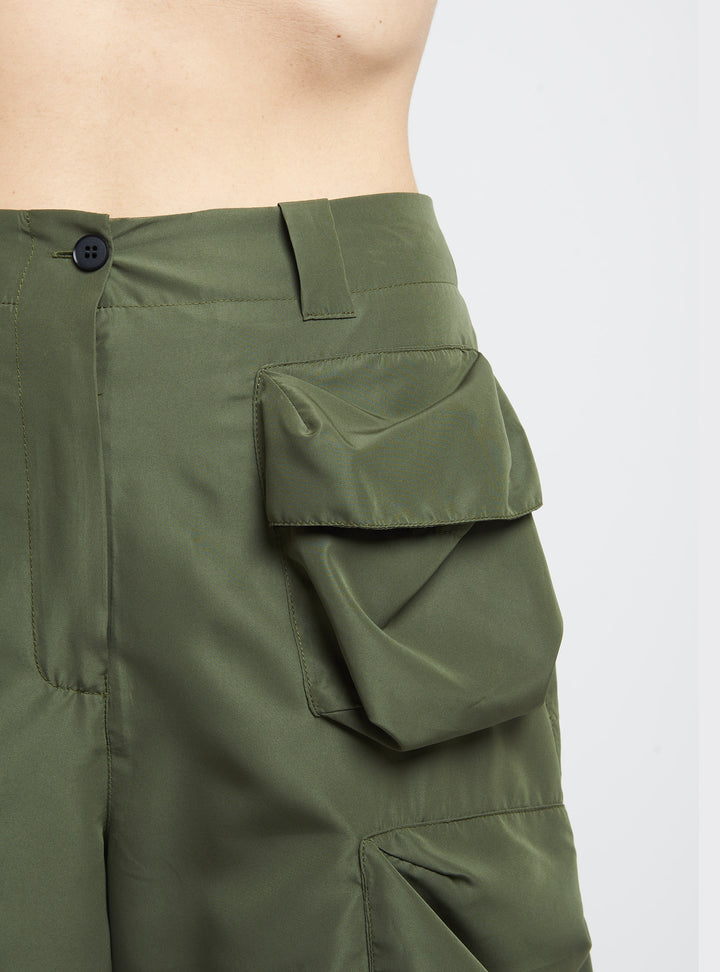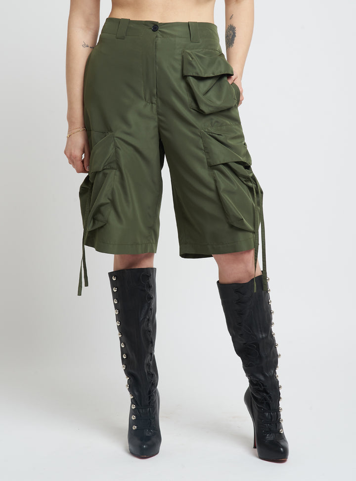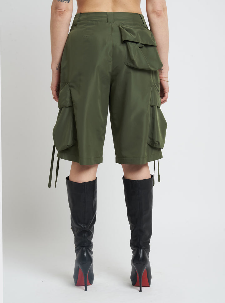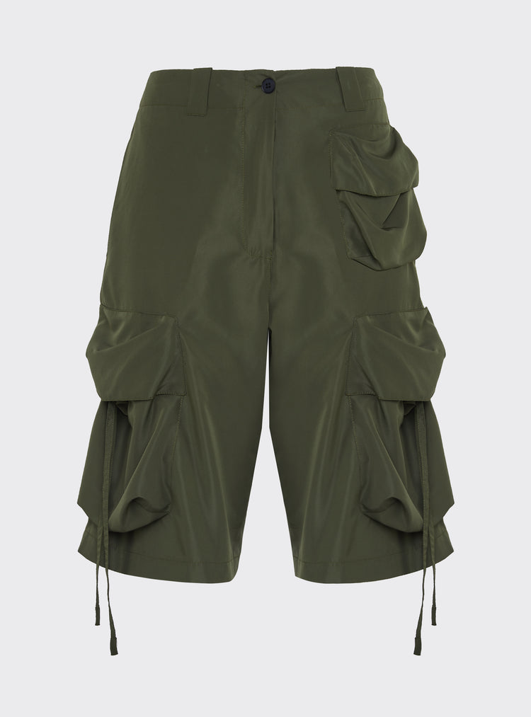Oversized cargo shorts in military green nylon with functional 3D maxi pockets with flap.