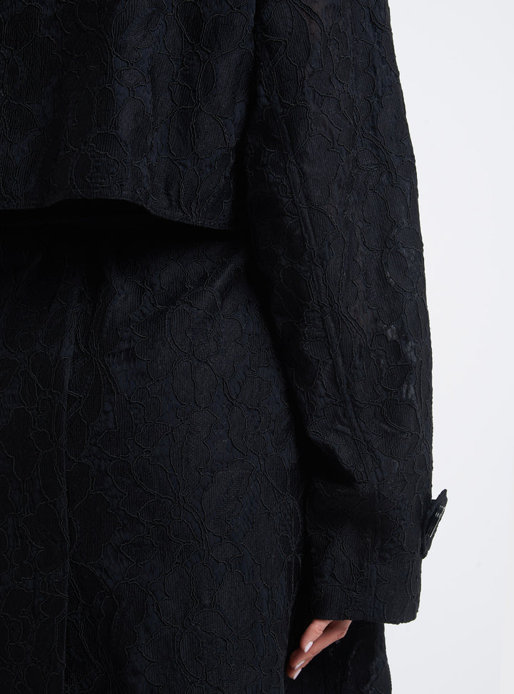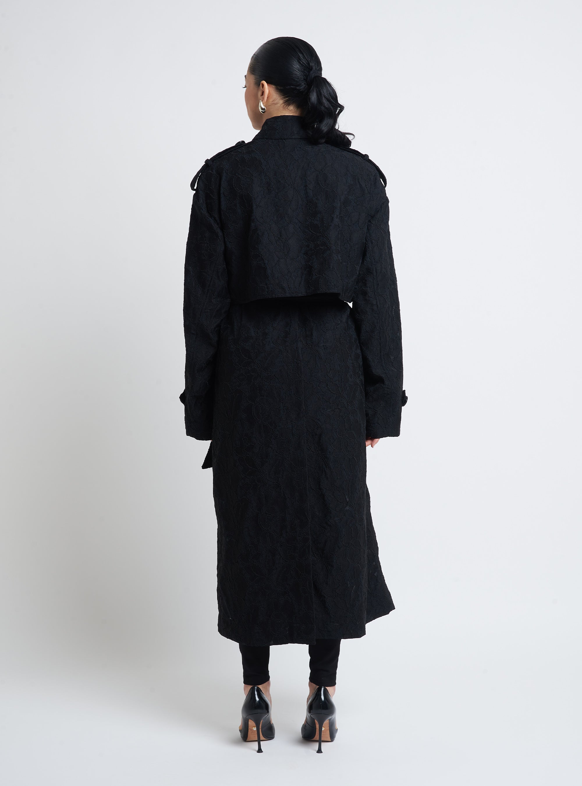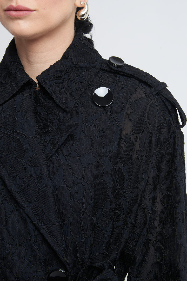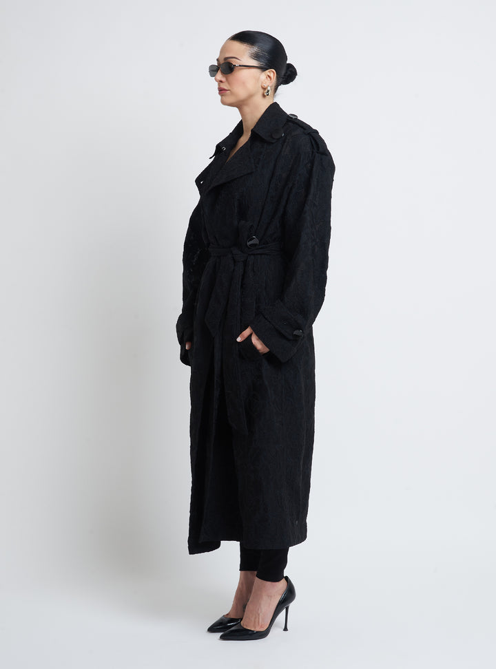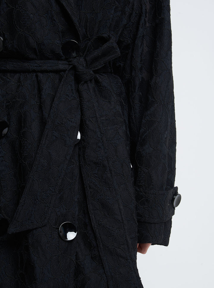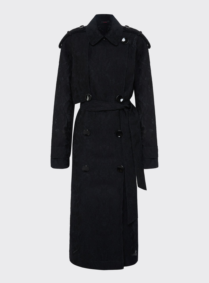 Oversized double-breasted trench coat. The model is characterized by a wide lapel collar, low set-in sleeves with frogs, side pockets and a matching fabric belt.