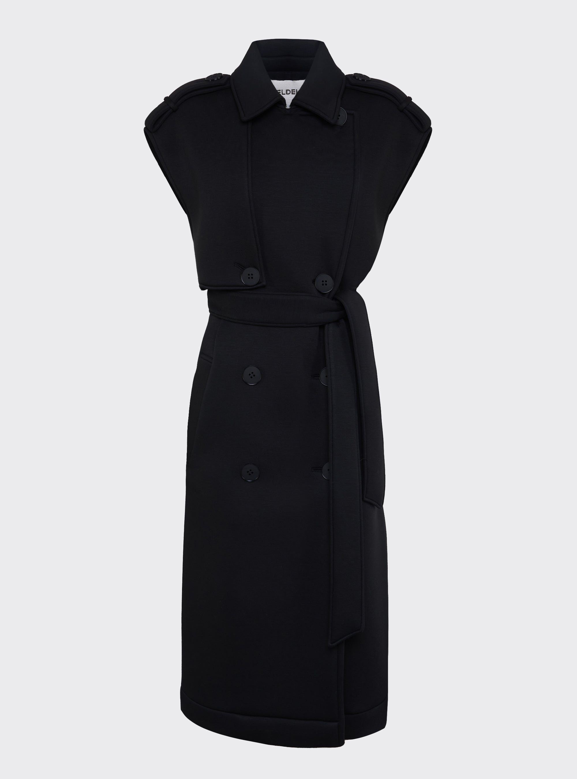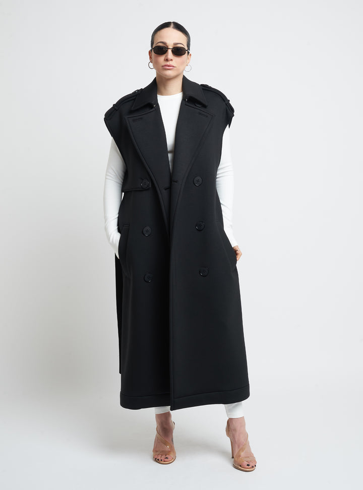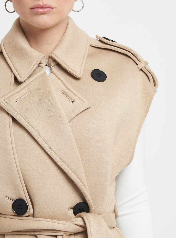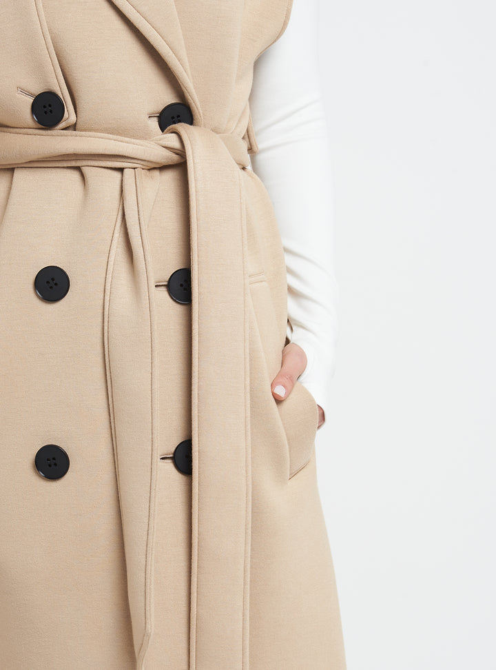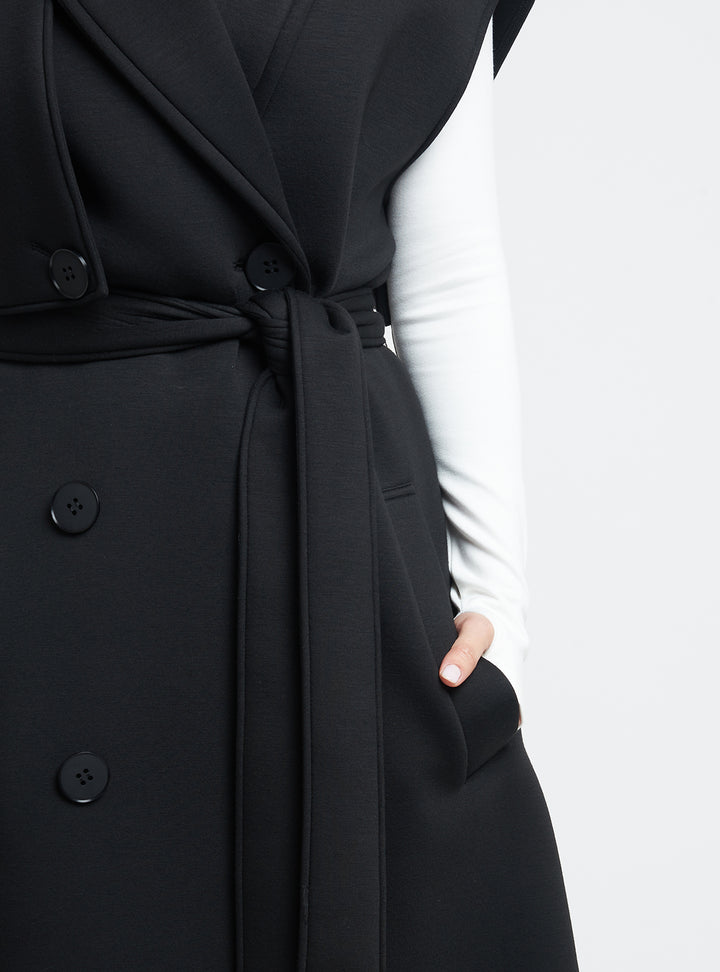 Oversized double-breasted waistcoat. The model is characterized by a wide lapel collar, with frogs, side pockets and matching fabric belt.