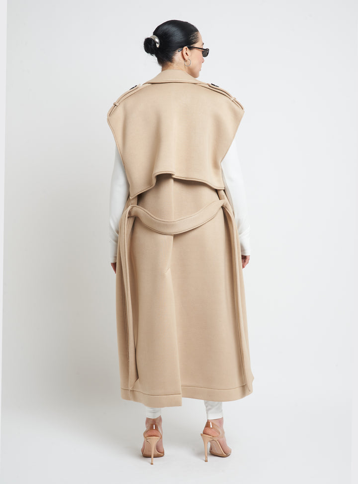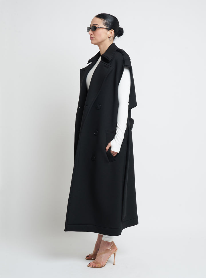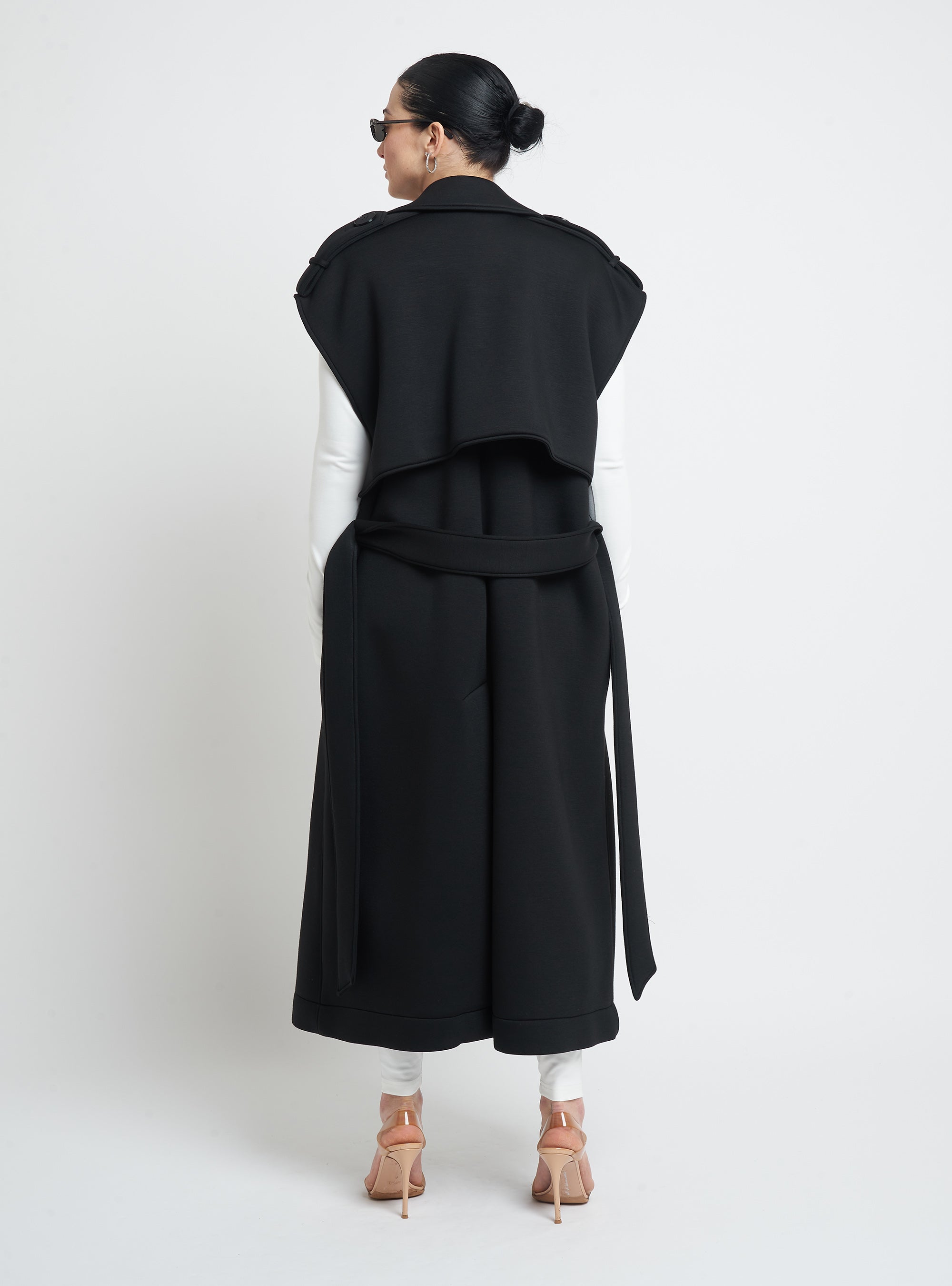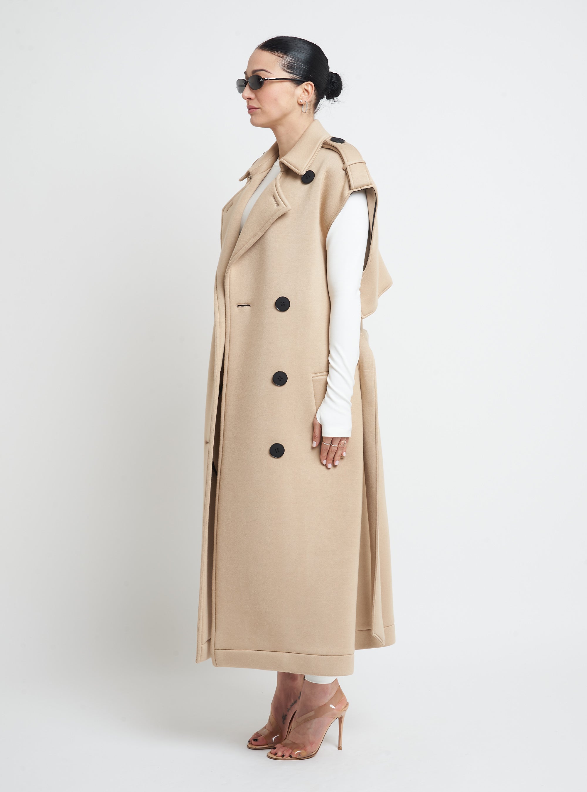 Oversized double-breasted waistcoat. The model is characterized by a wide lapel collar, with frogs, side pockets and matching fabric belt.