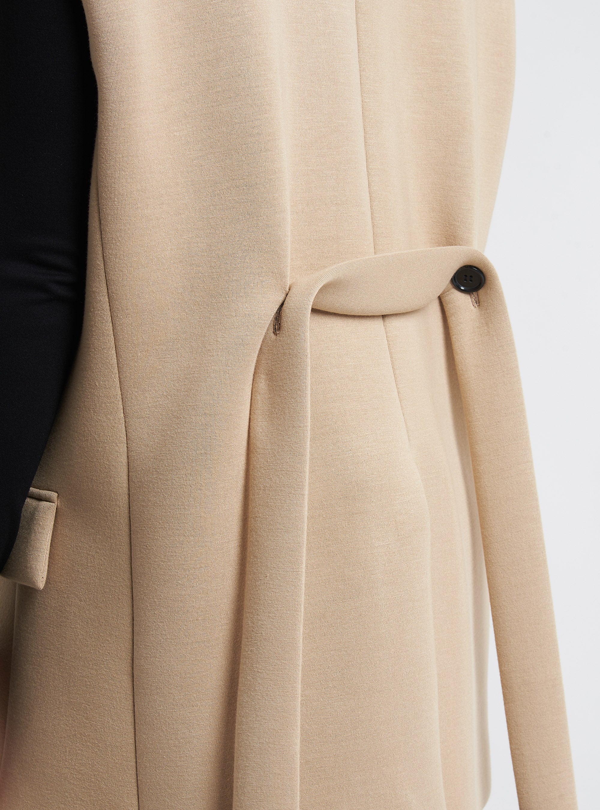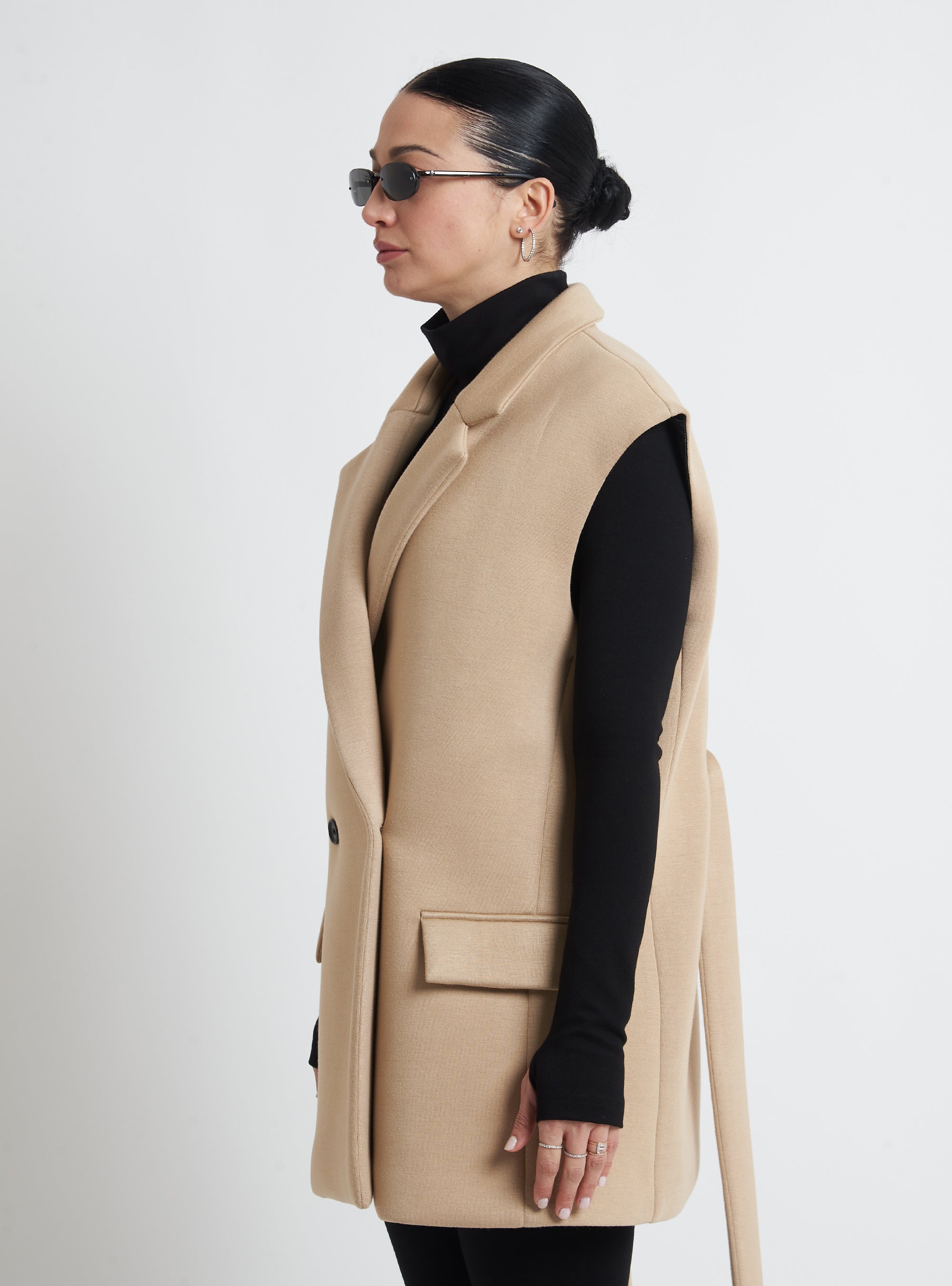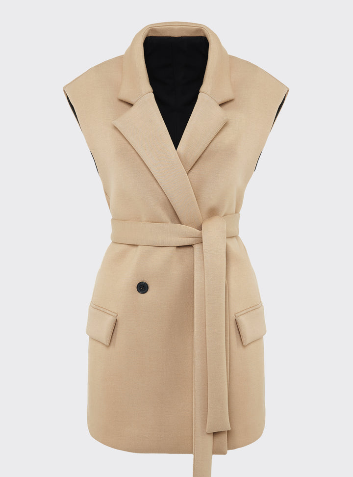 Oversized double-breasted waistcoat. Comfortable fit with peak lapels, aesthetic pocket with flap and removable belt.