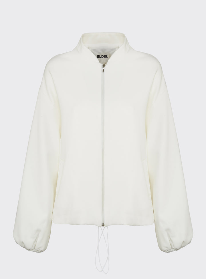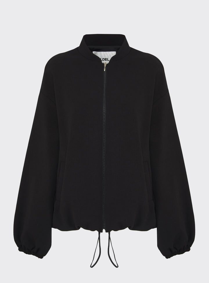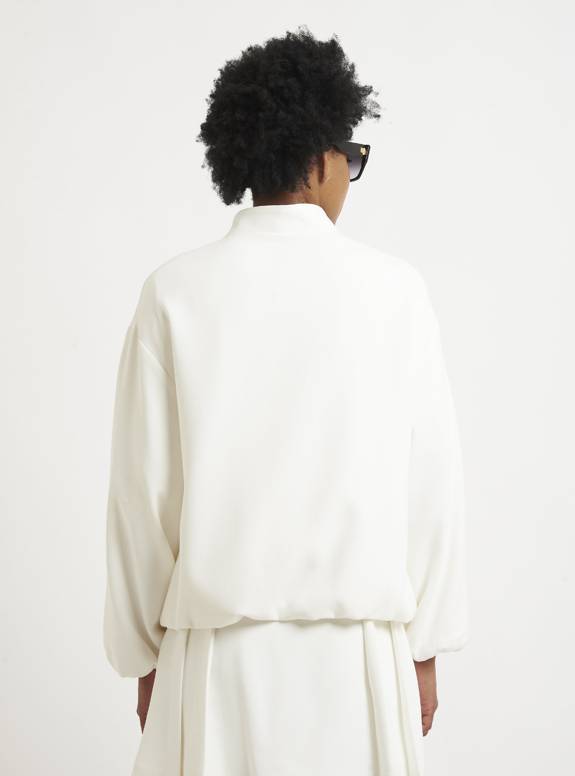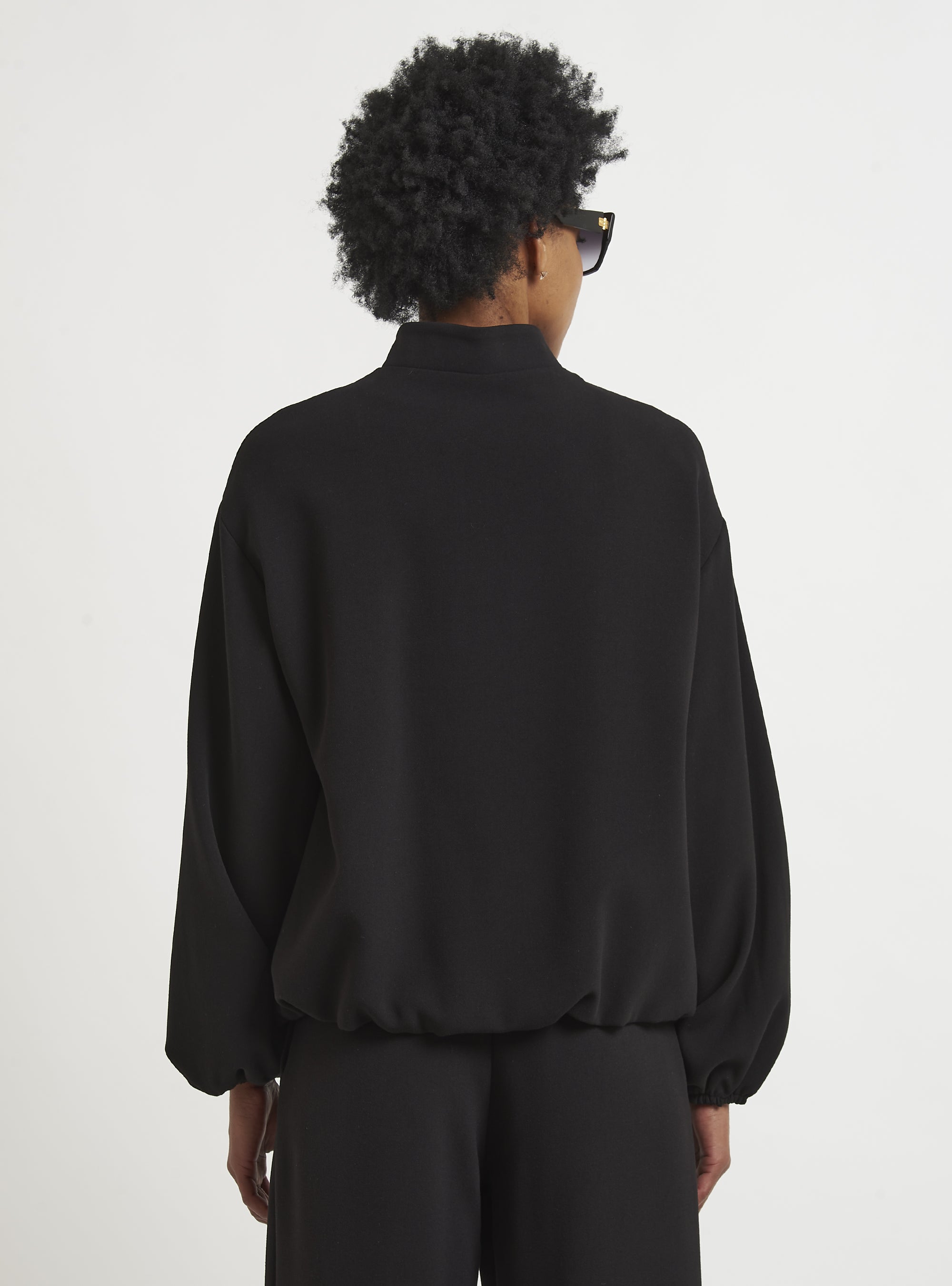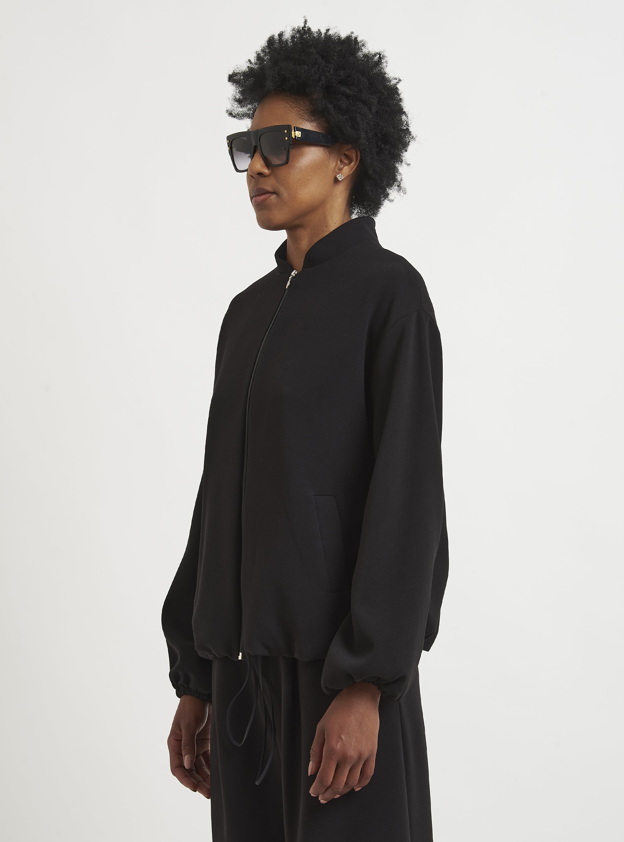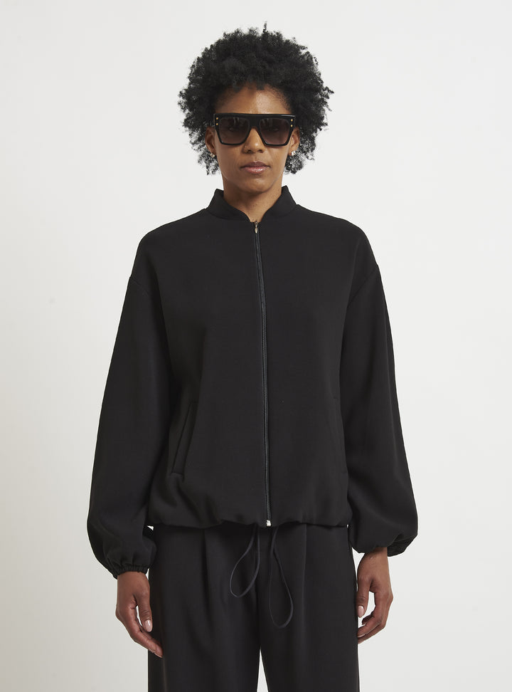 Relaxed-fit wool bomber jacket. Puff sleeves and an elastic hem create a gently rounded silhouette. True to size.