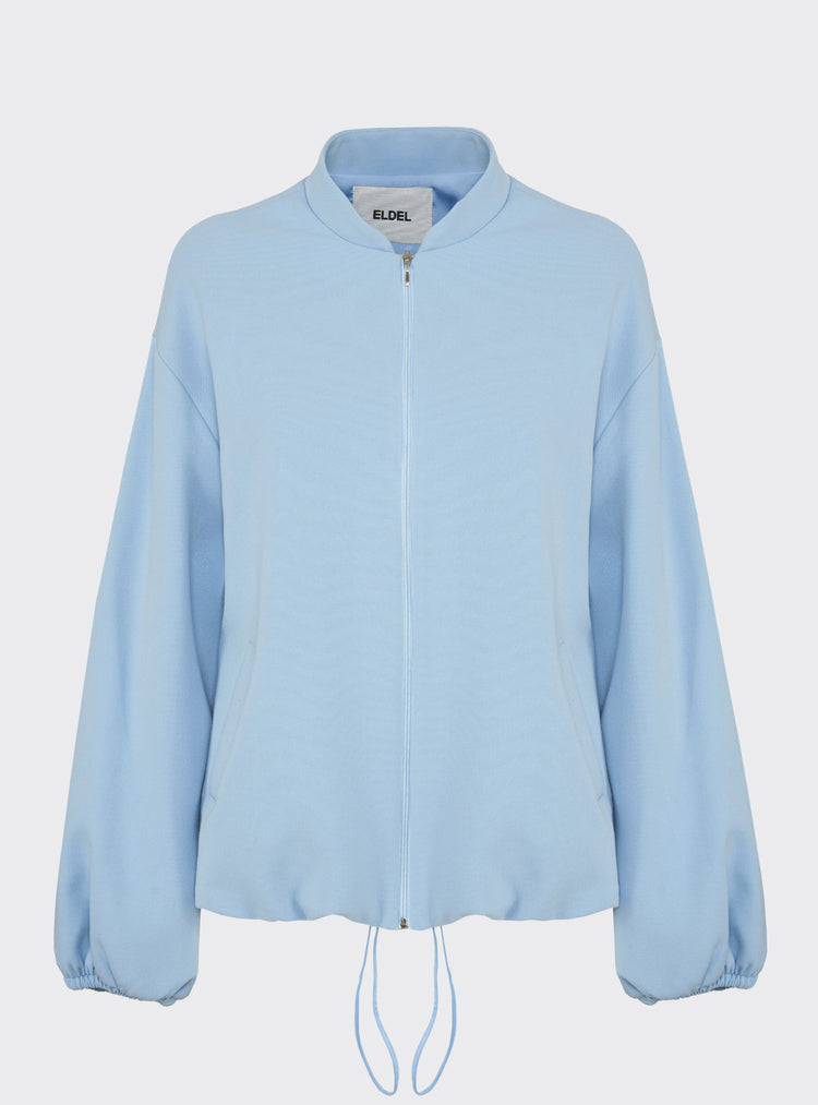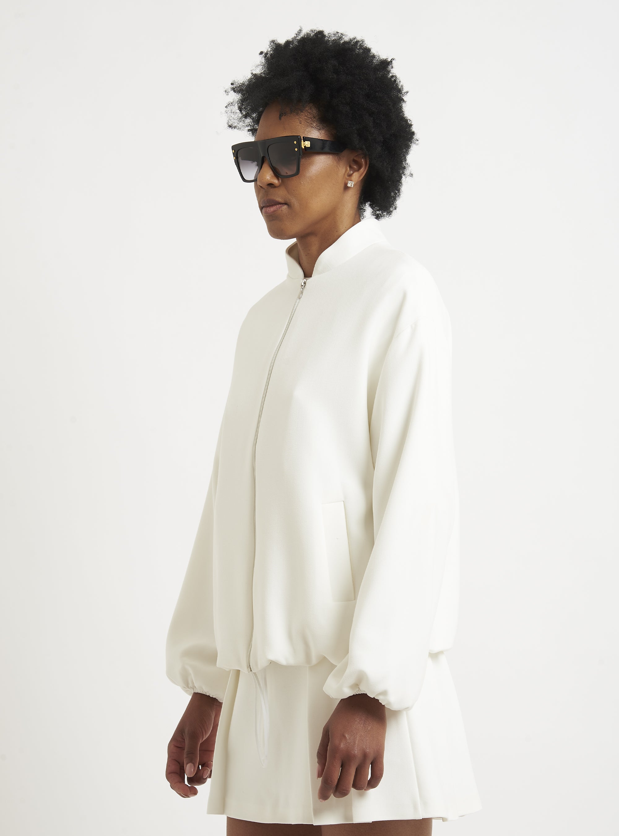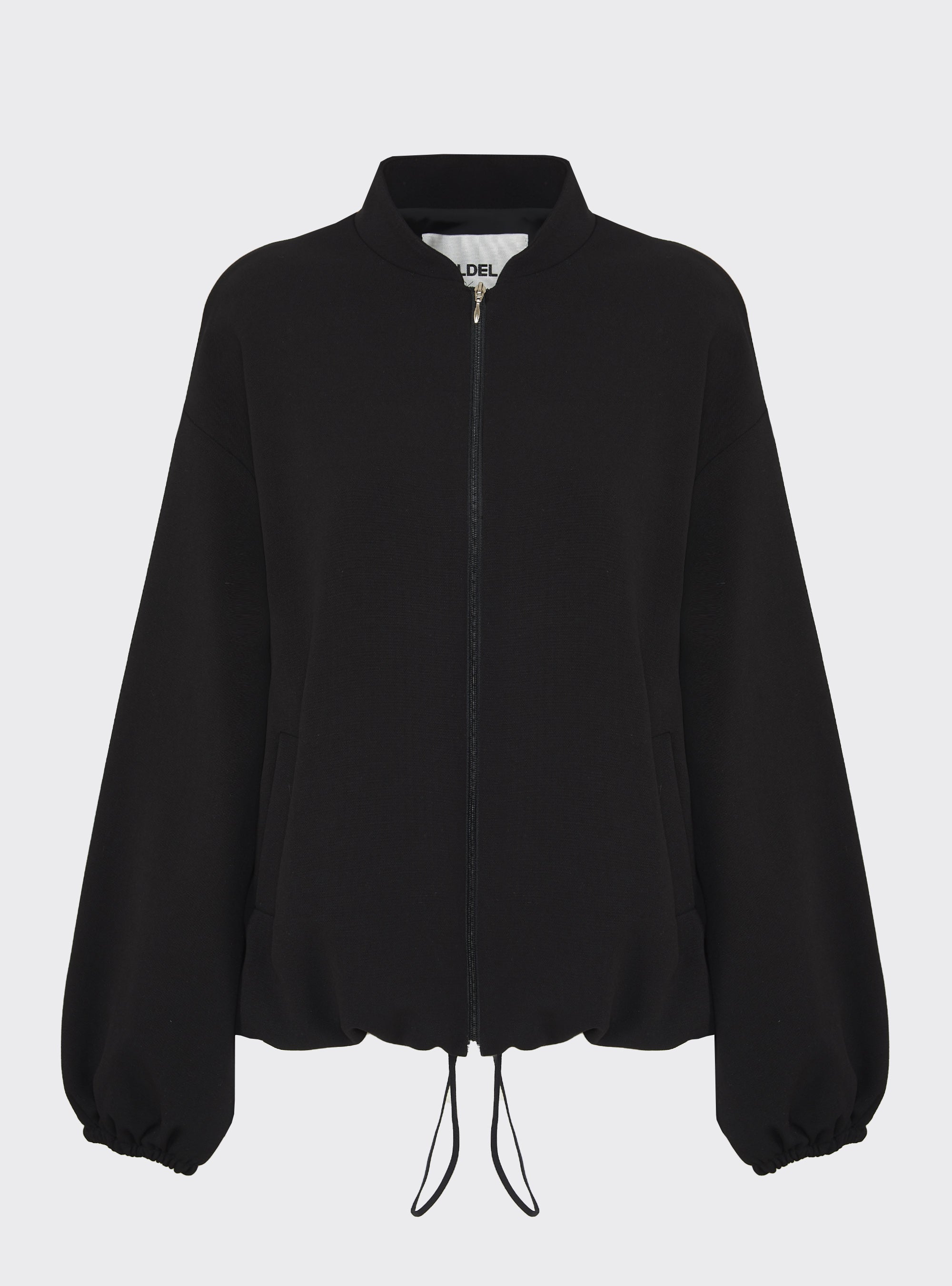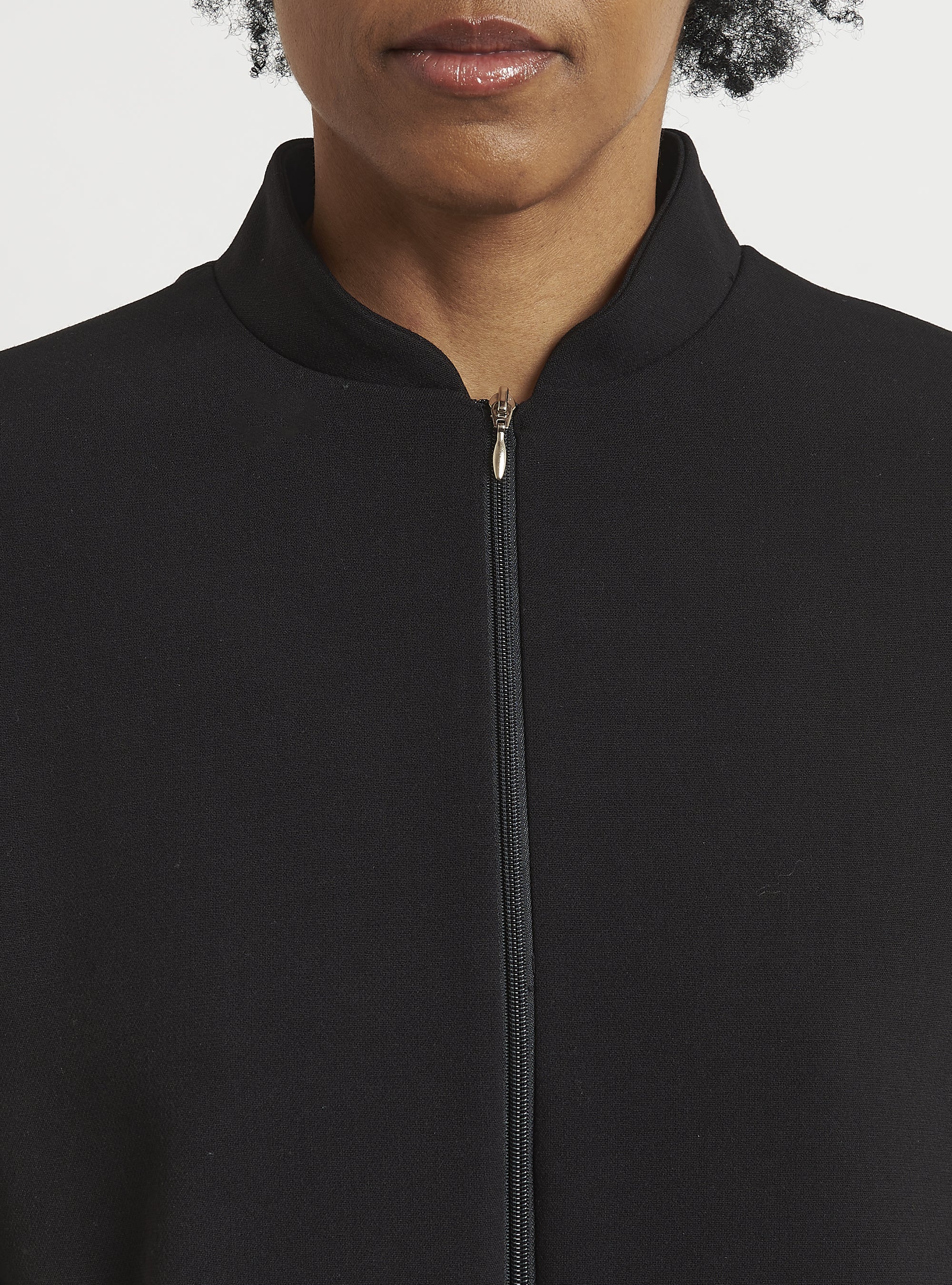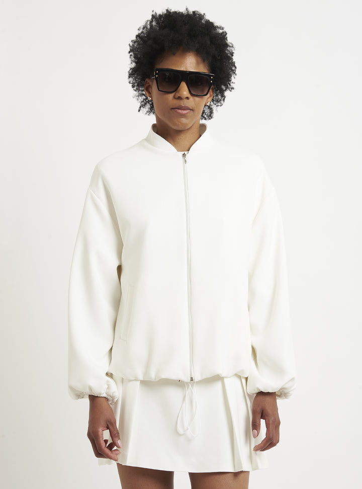 Relaxed-fit wool bomber jacket. Puff sleeves and an elastic hem create a gently rounded silhouette. True to size.