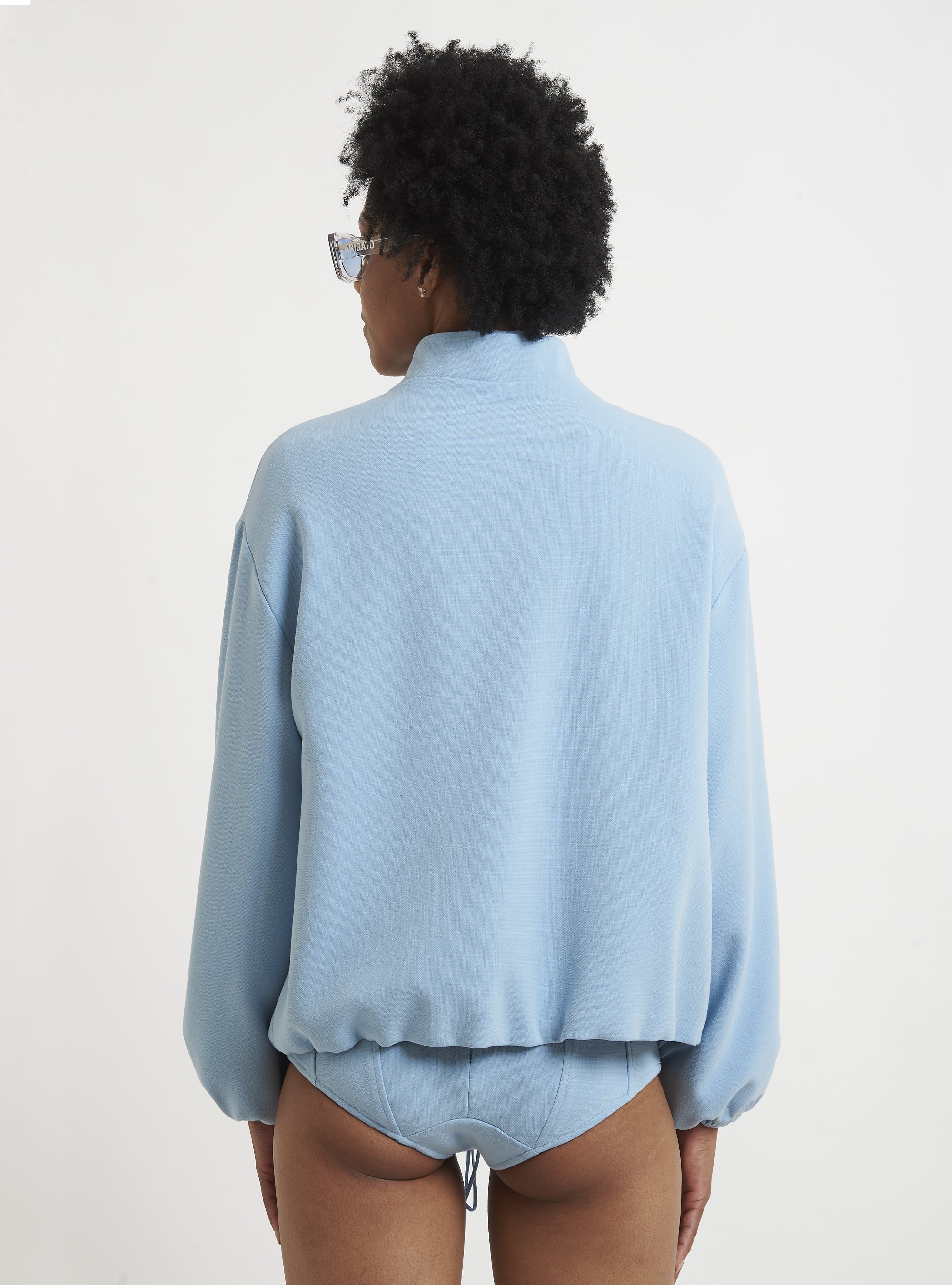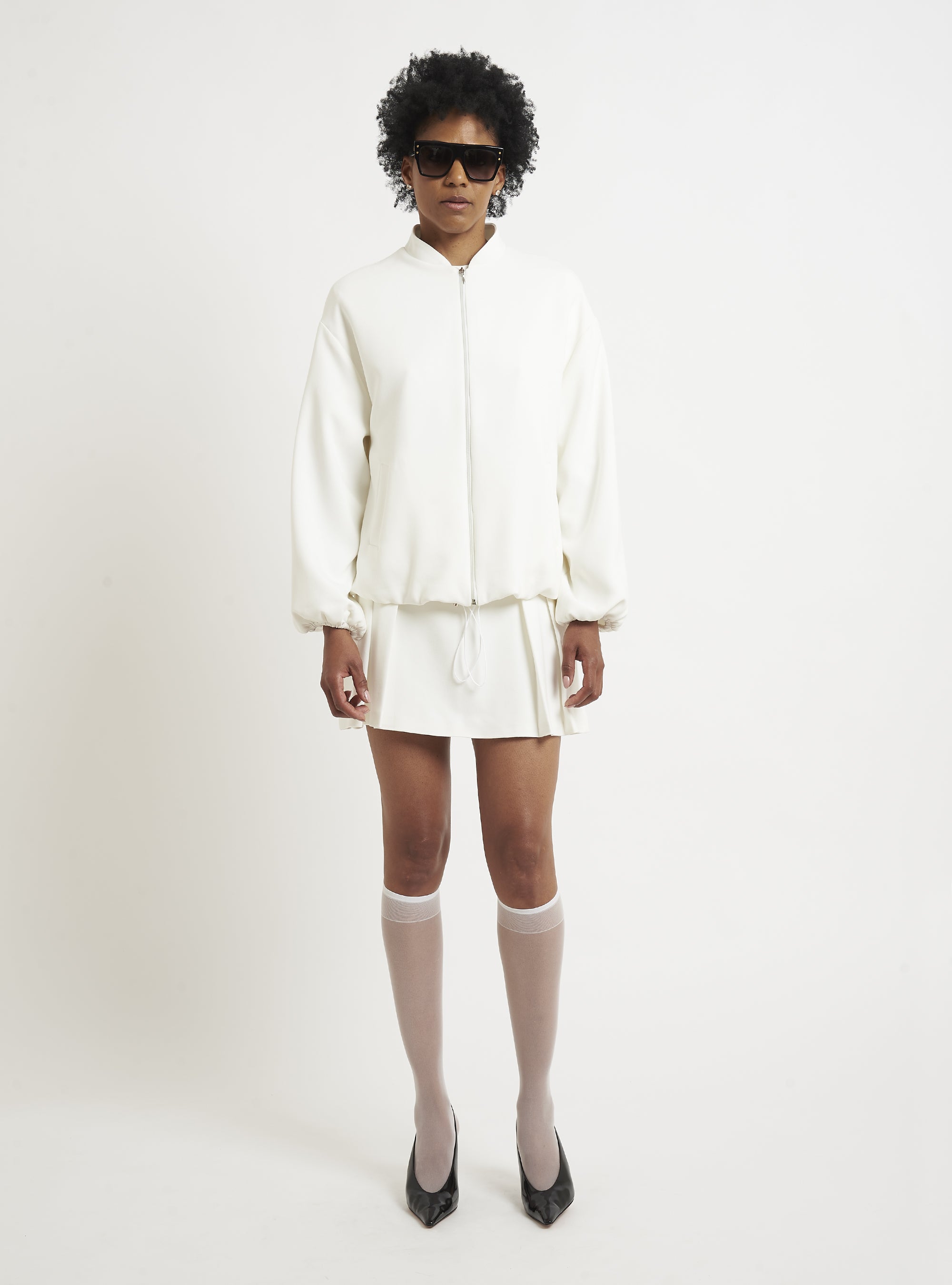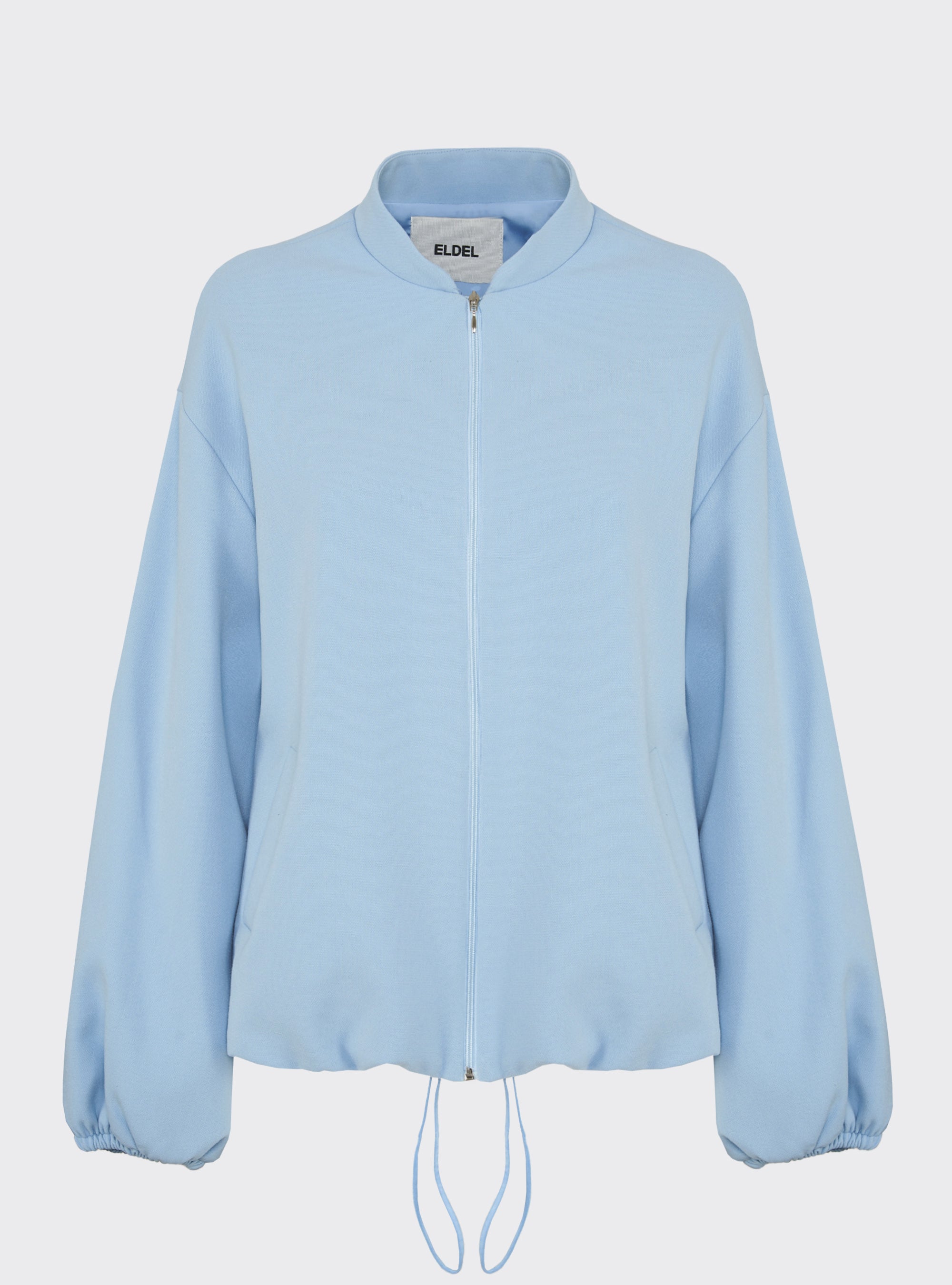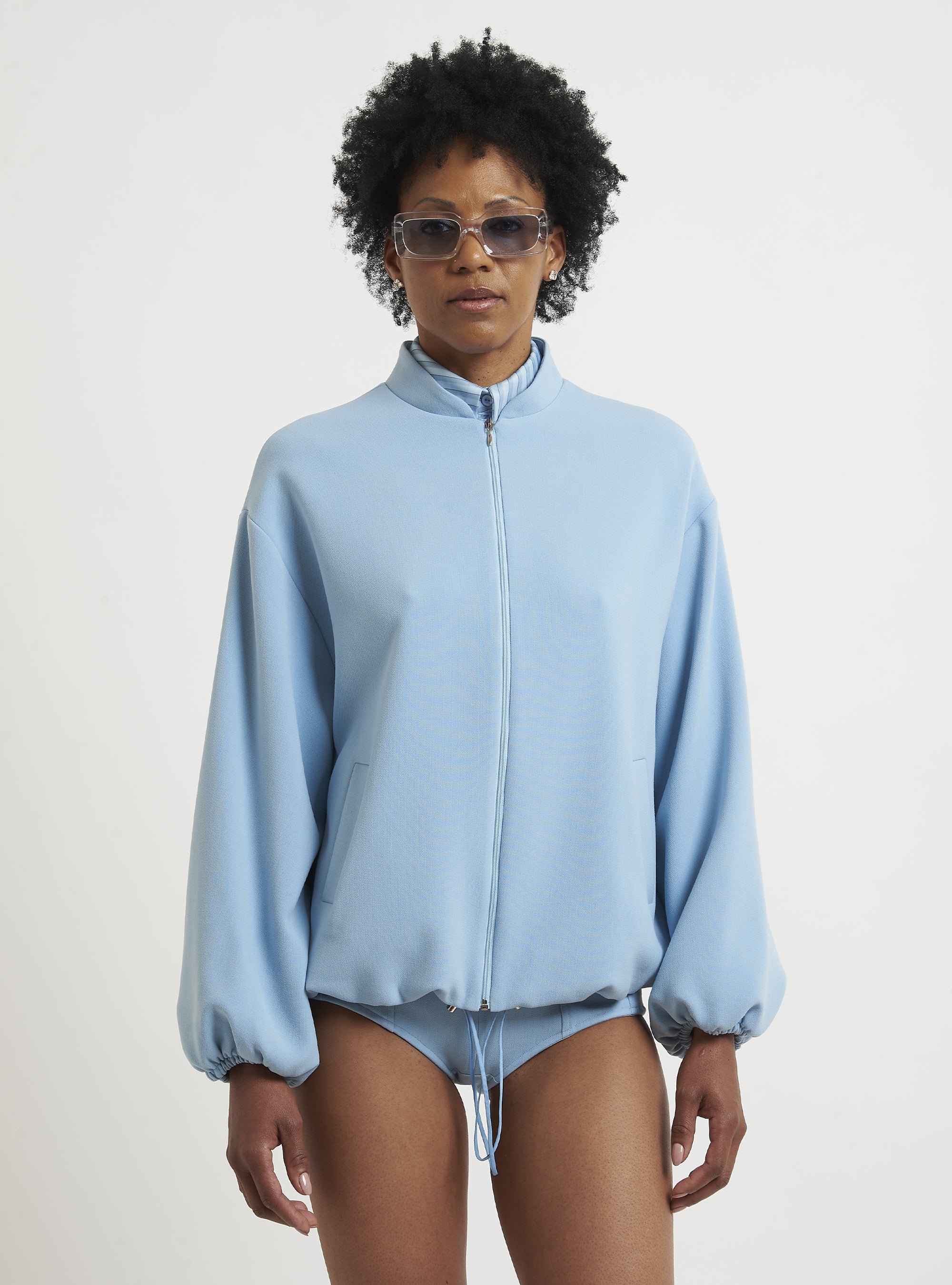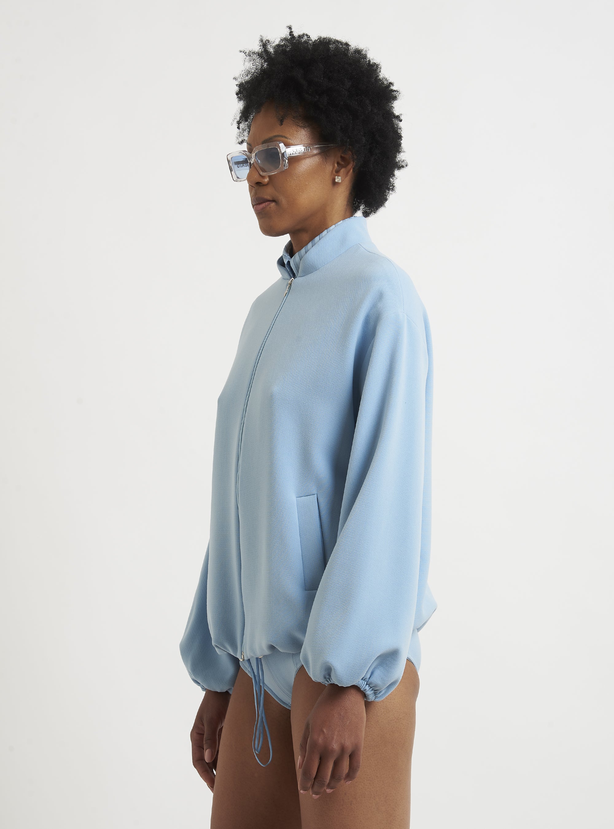 Relaxed-fit wool bomber jacket. Puff sleeves and an elastic hem create a gently rounded silhouette. True to size.
