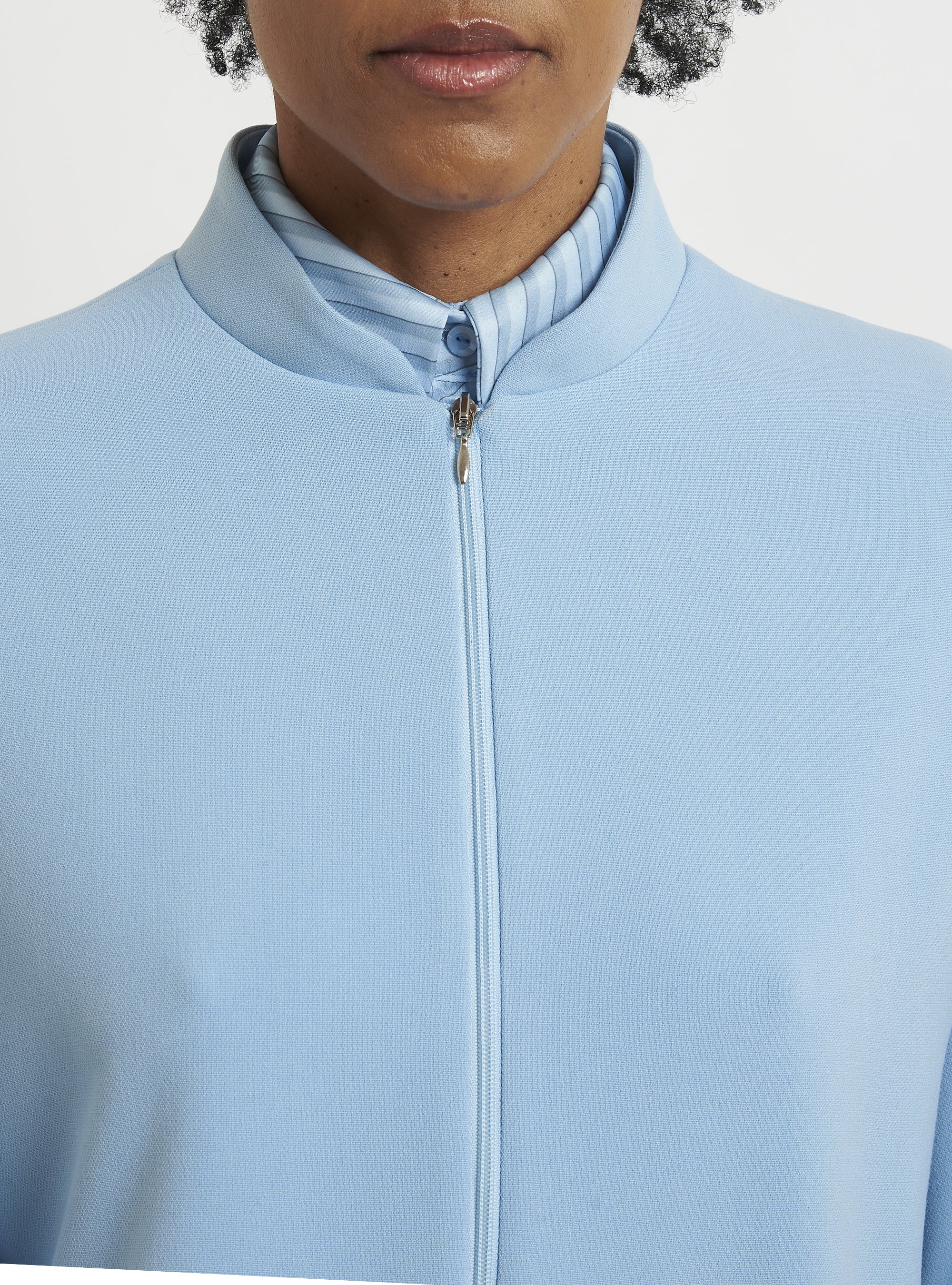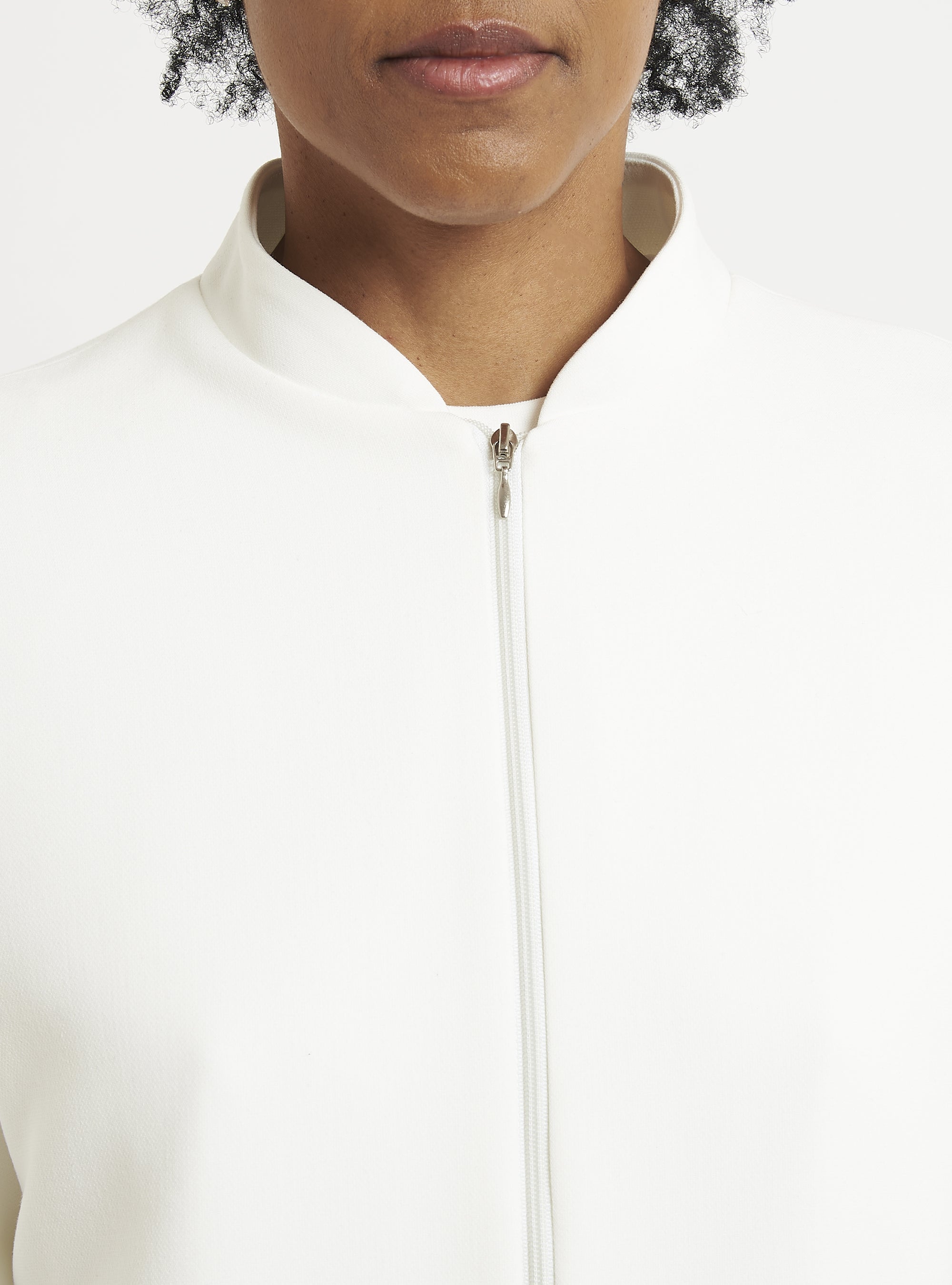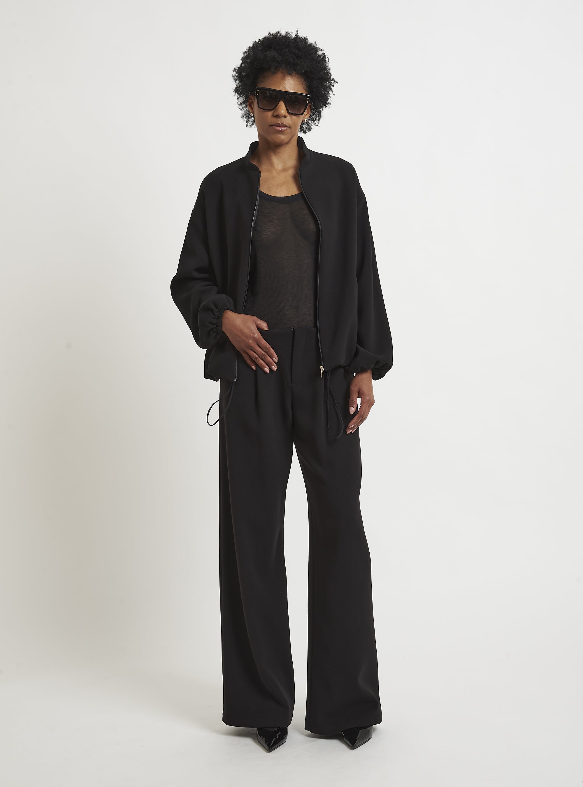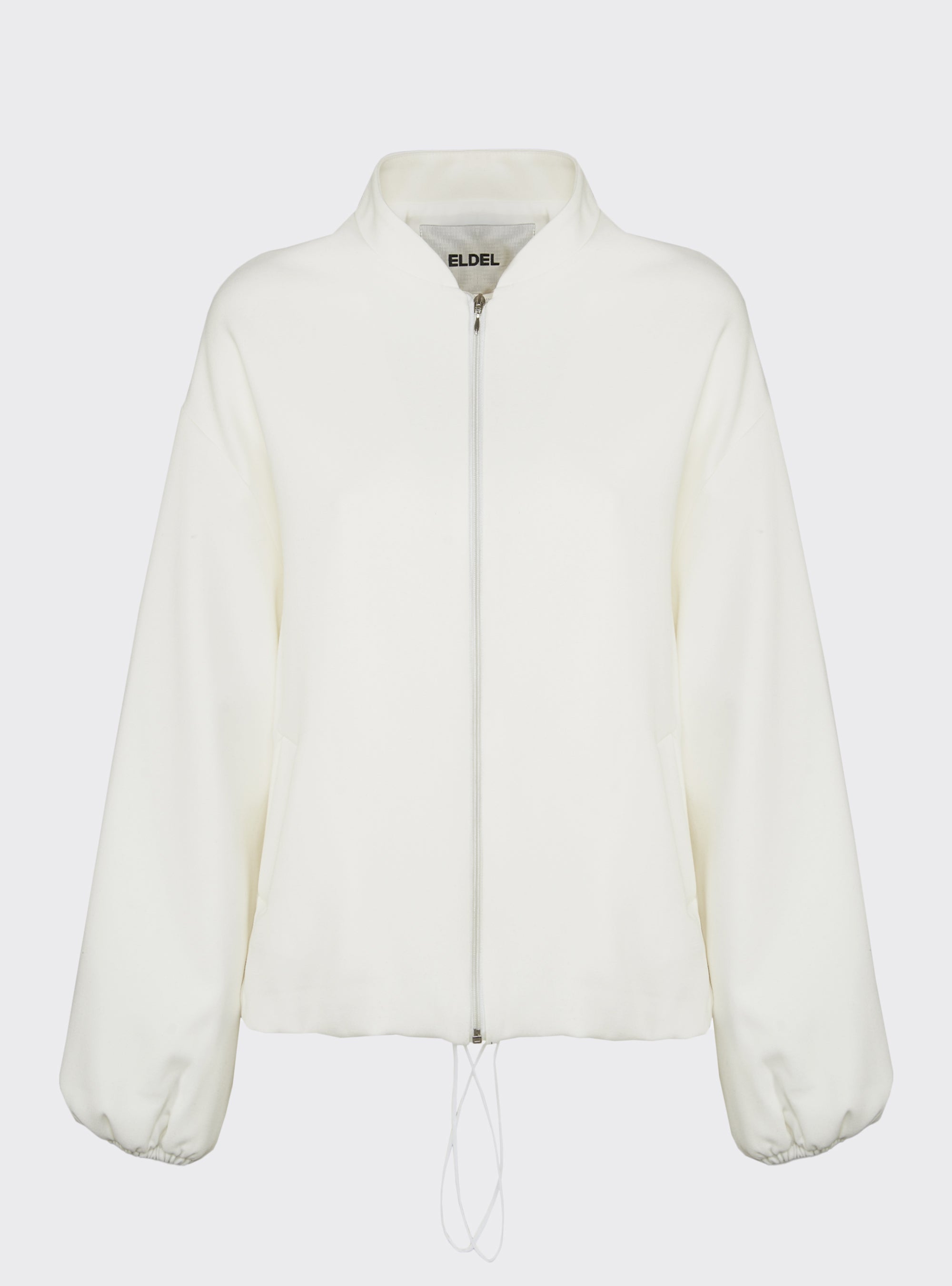 Relaxed-fit wool bomber jacket. Puff sleeves and an elastic hem create a gently rounded silhouette. True to size.