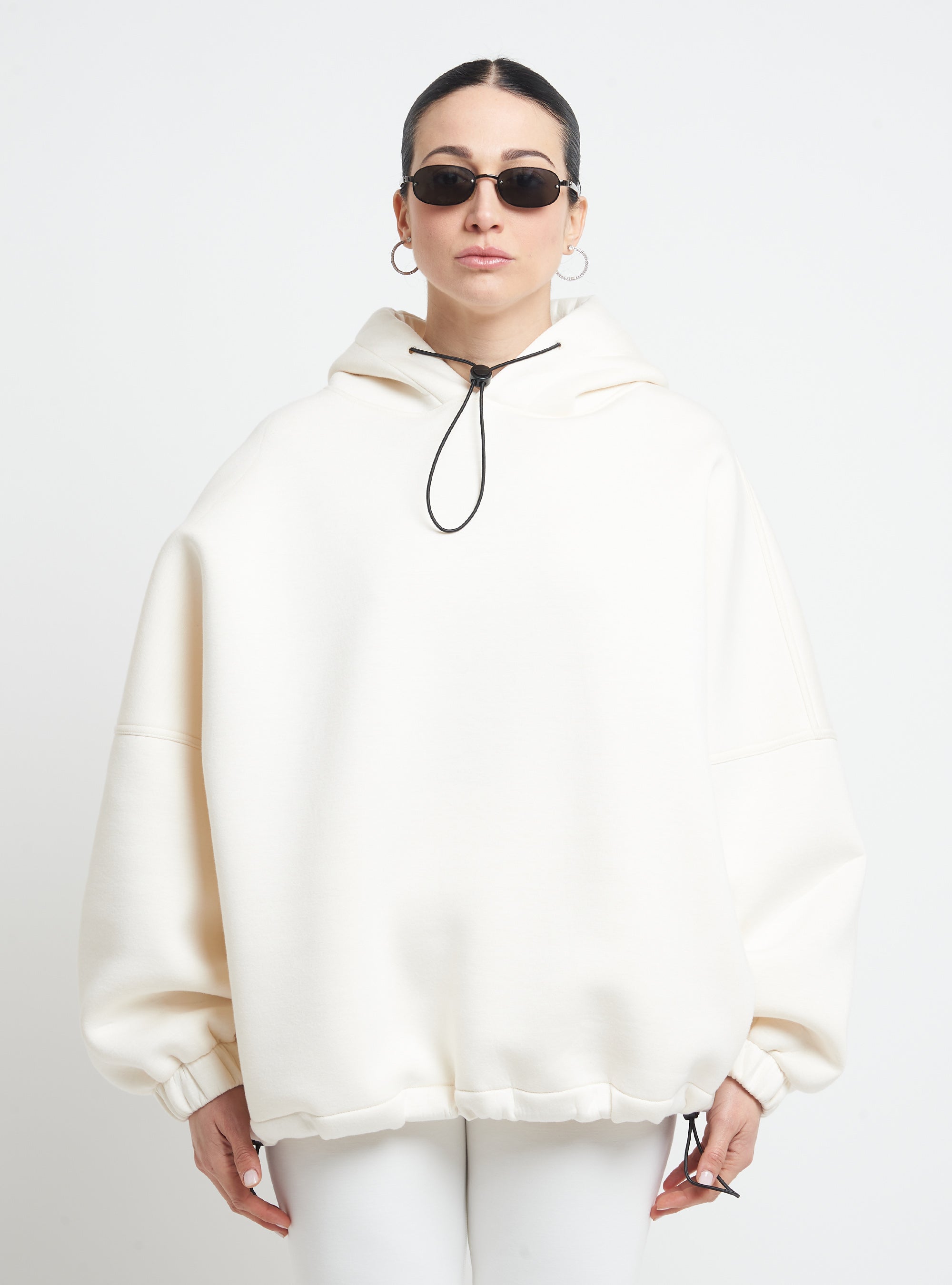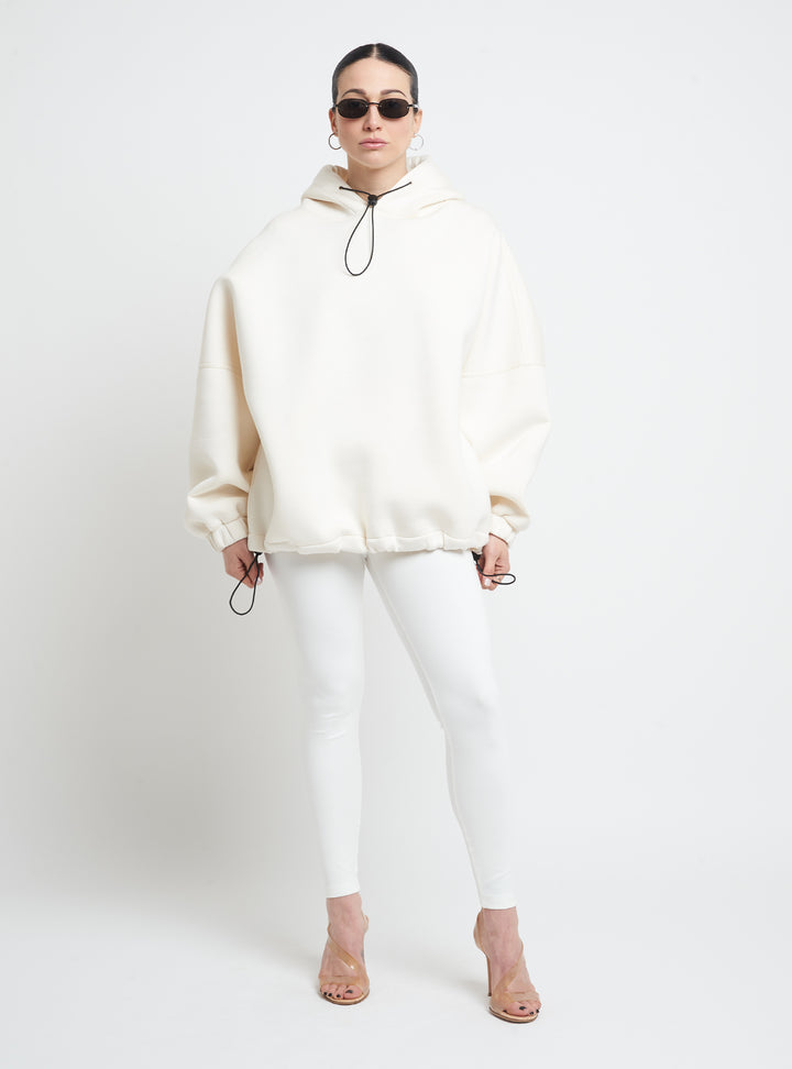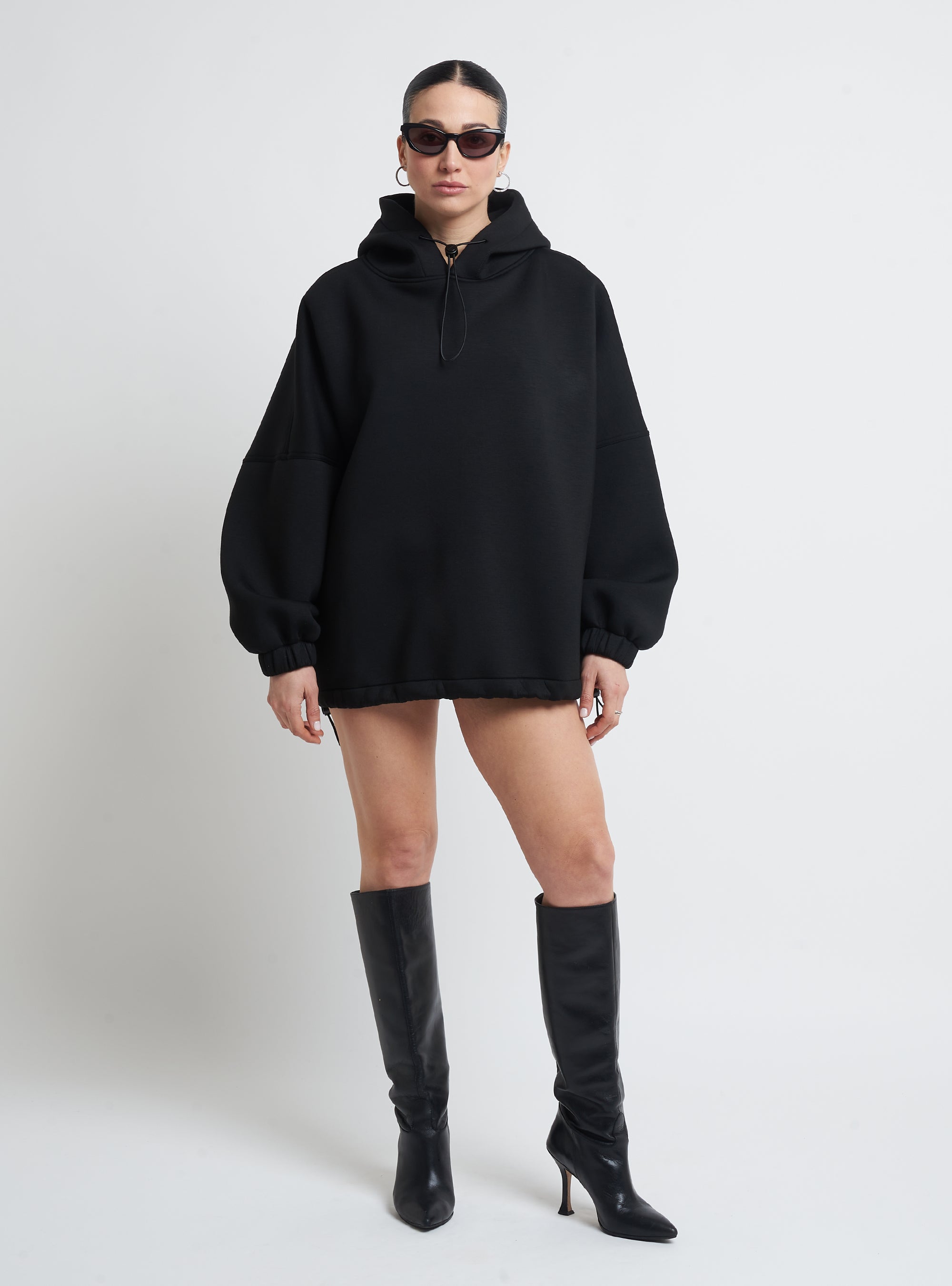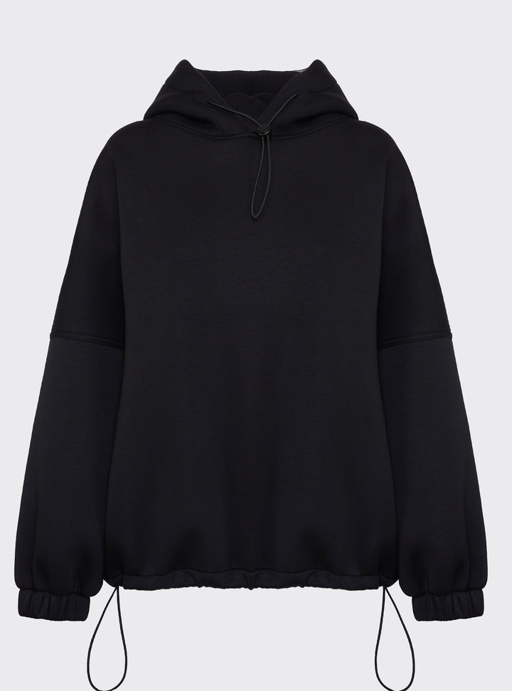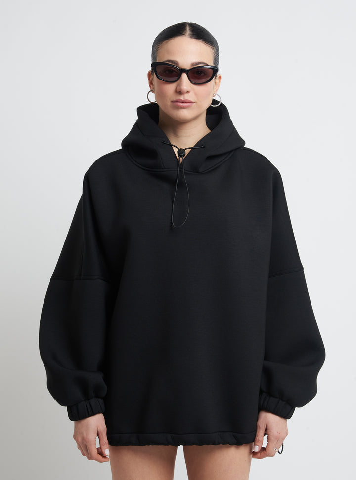 Super oversized sweatshirt with hood, finished with an adjustable drawstring, in neoprene. This piece was designed with many body types and gender expressions in mind.