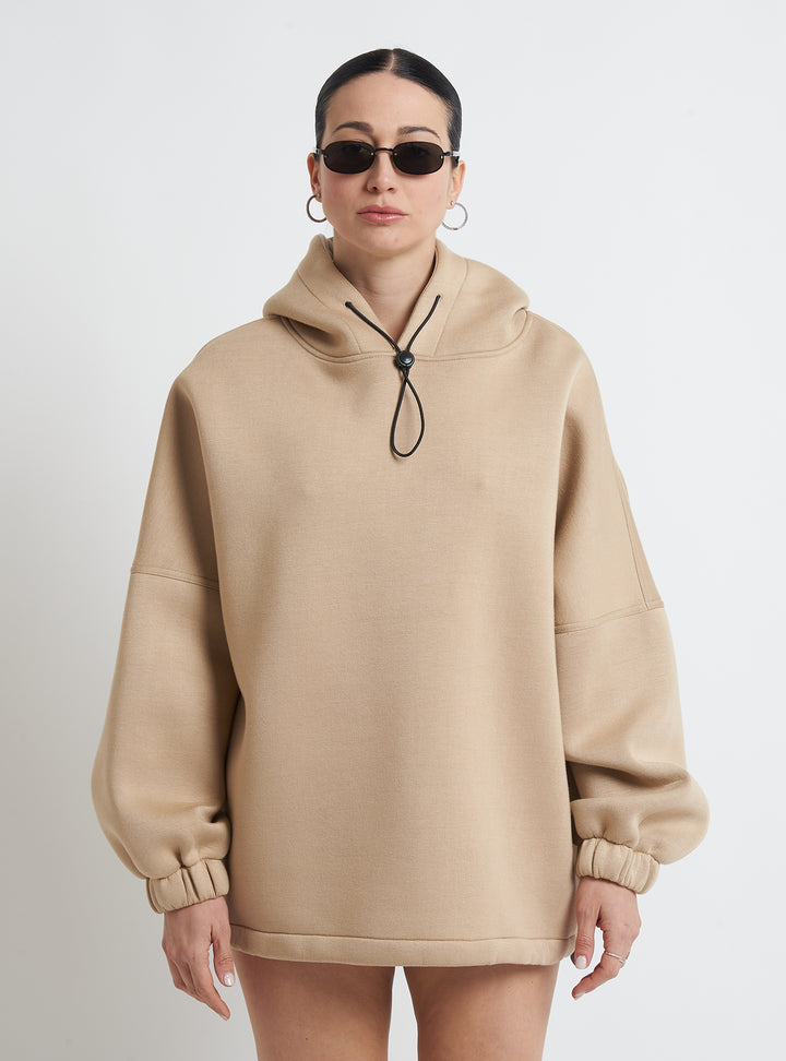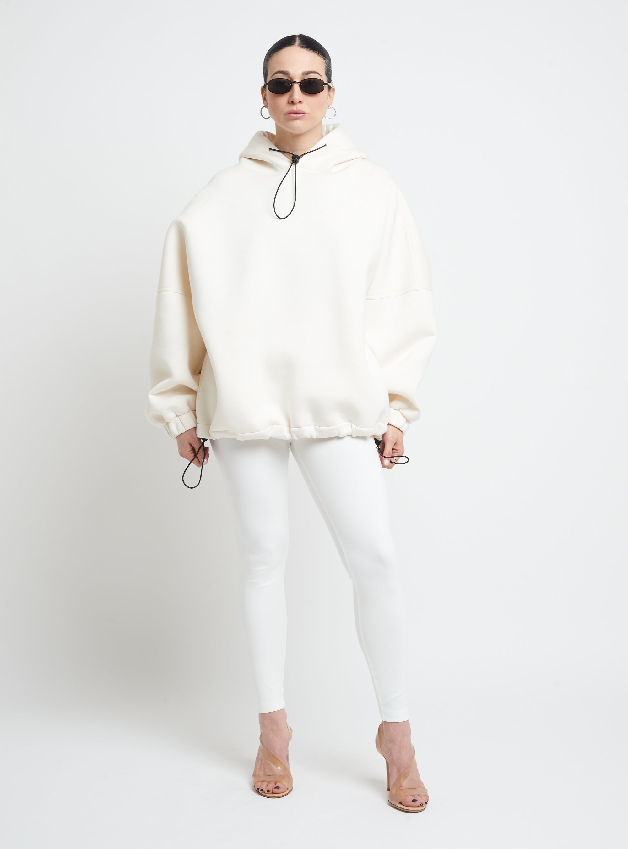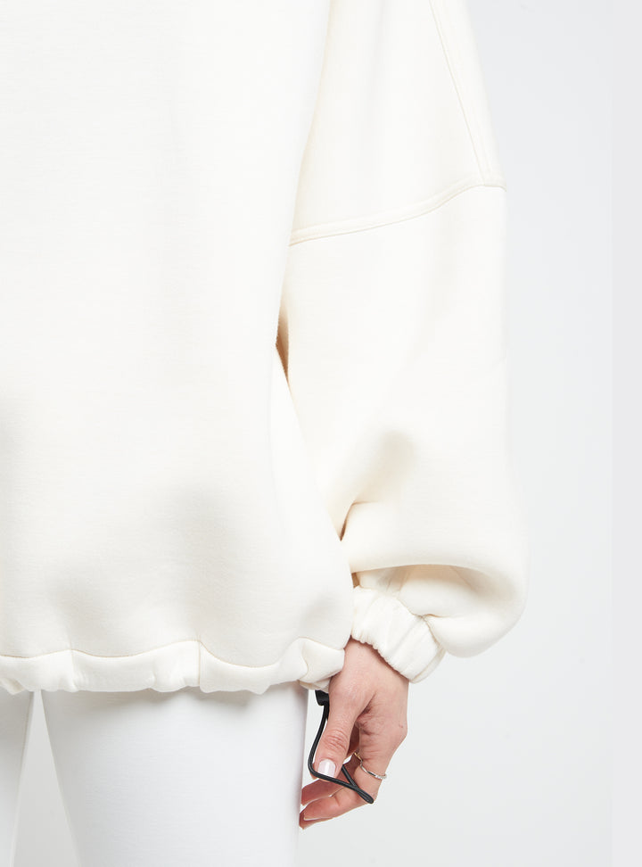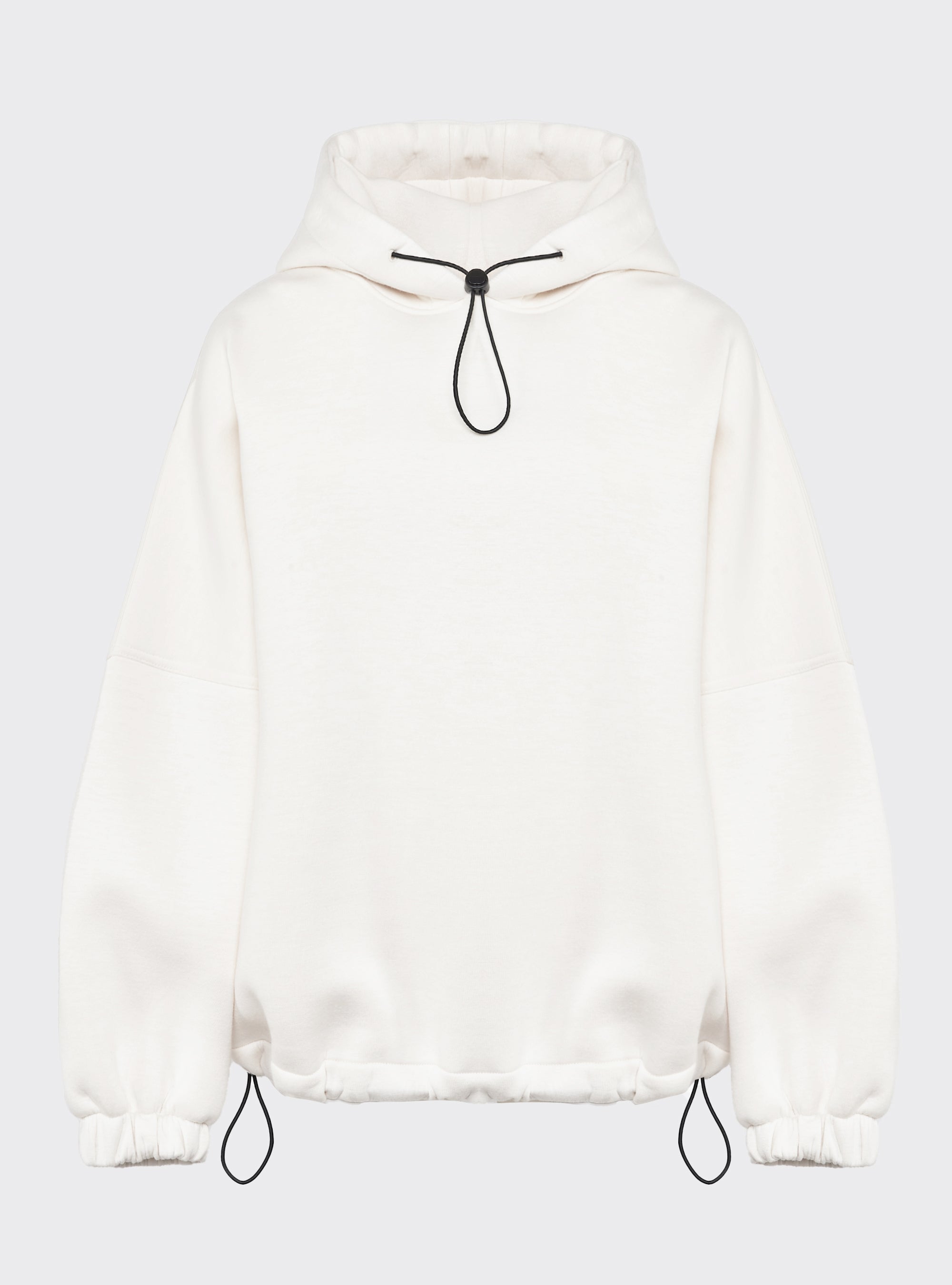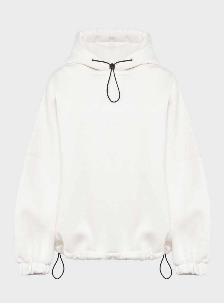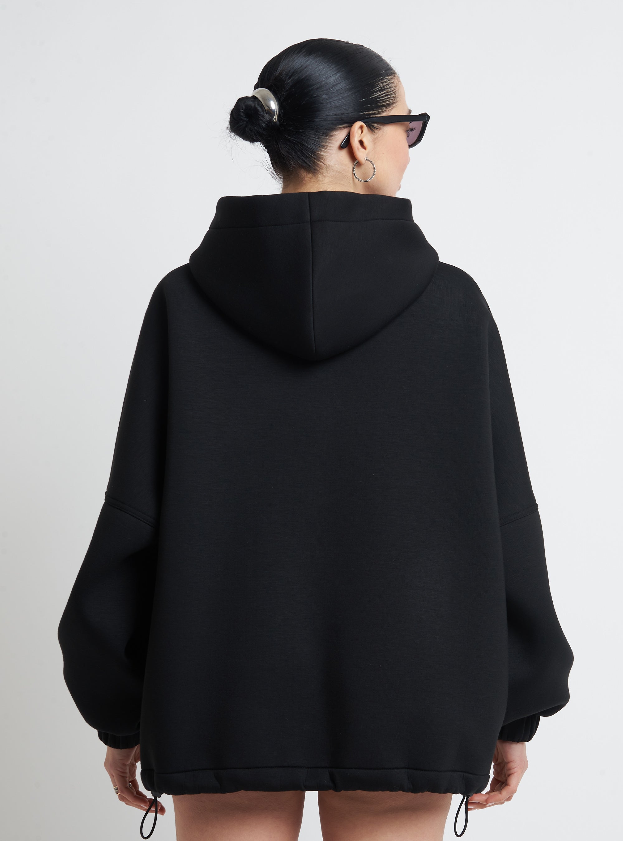 Super oversized sweatshirt with hood, finished with an adjustable drawstring, in neoprene. This piece was designed with many body types and gender expressions in mind.