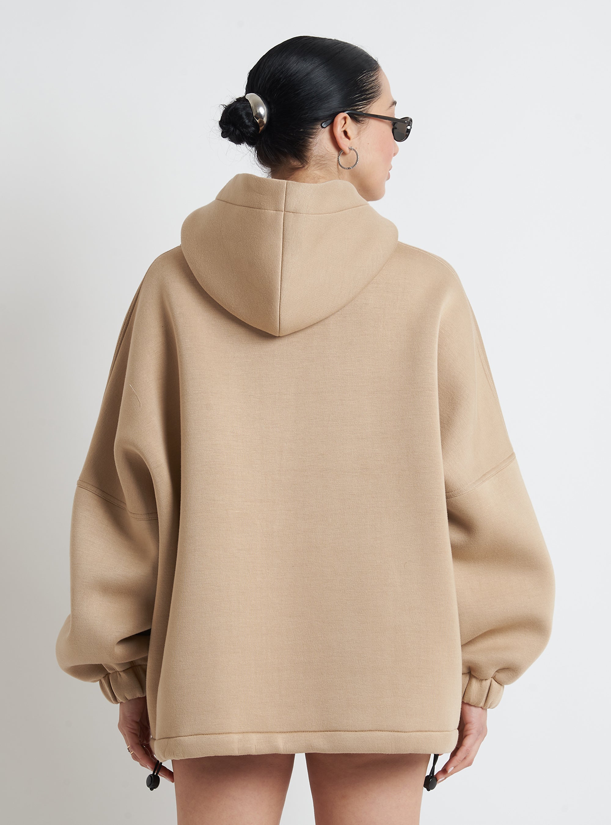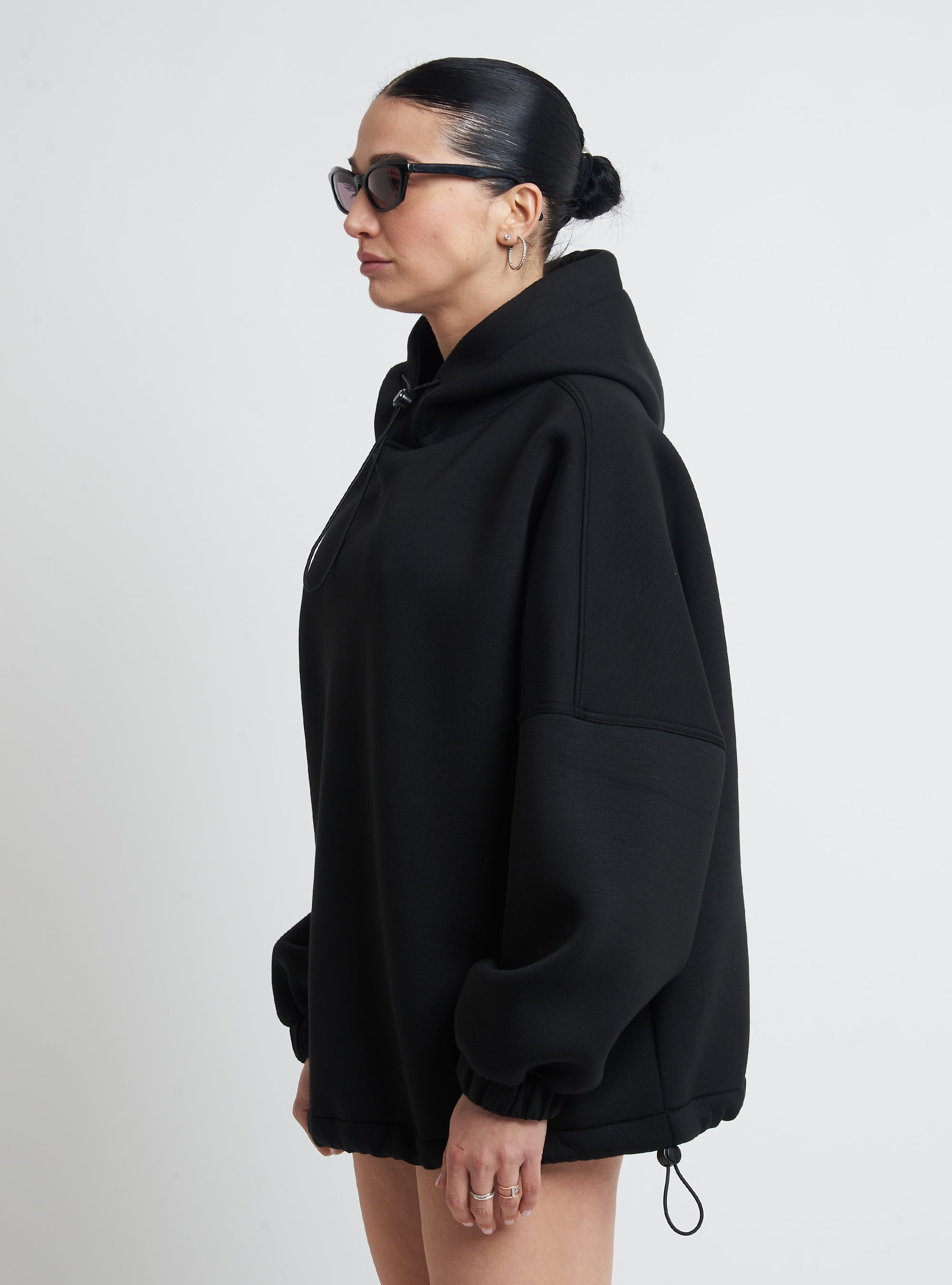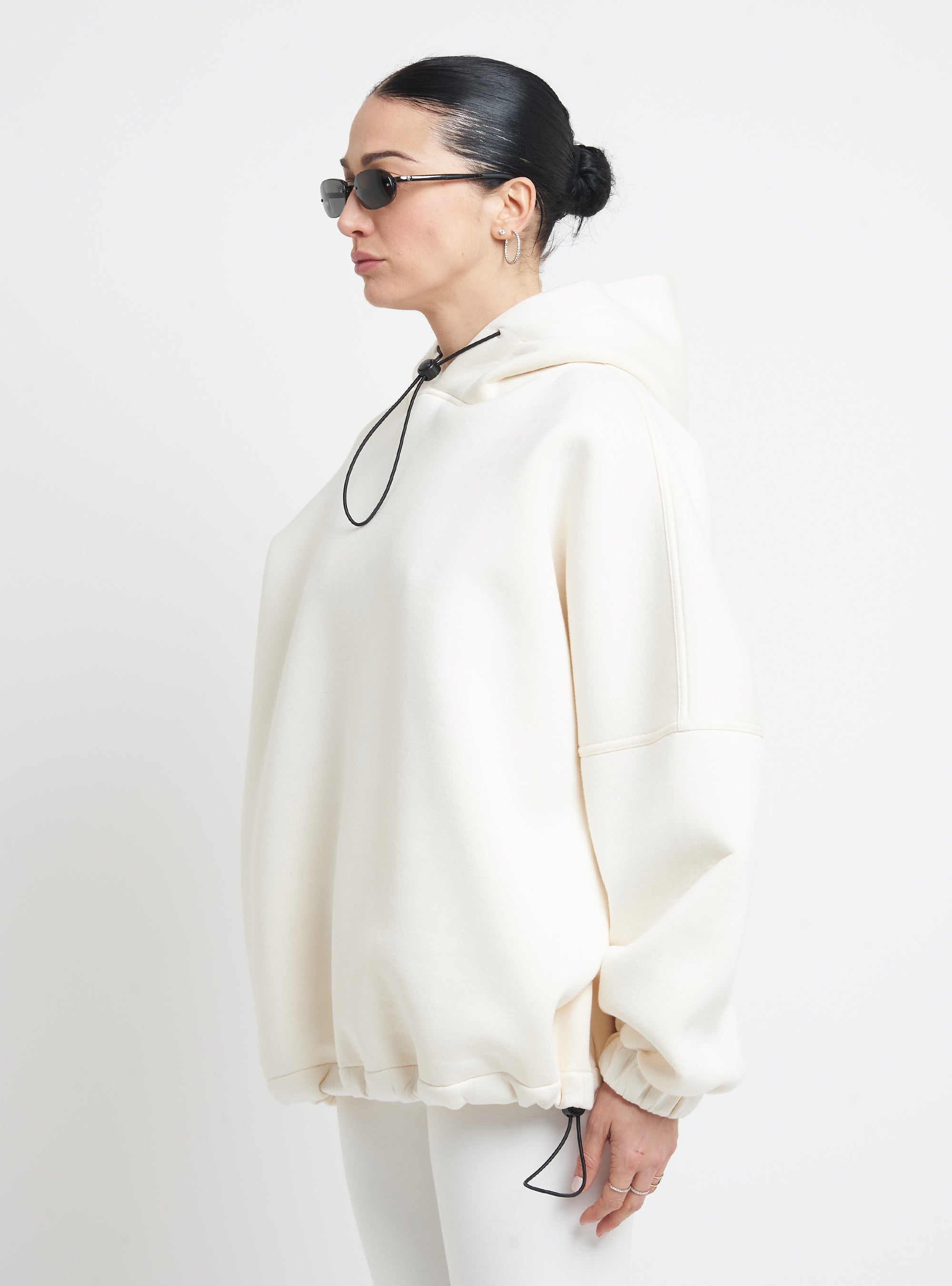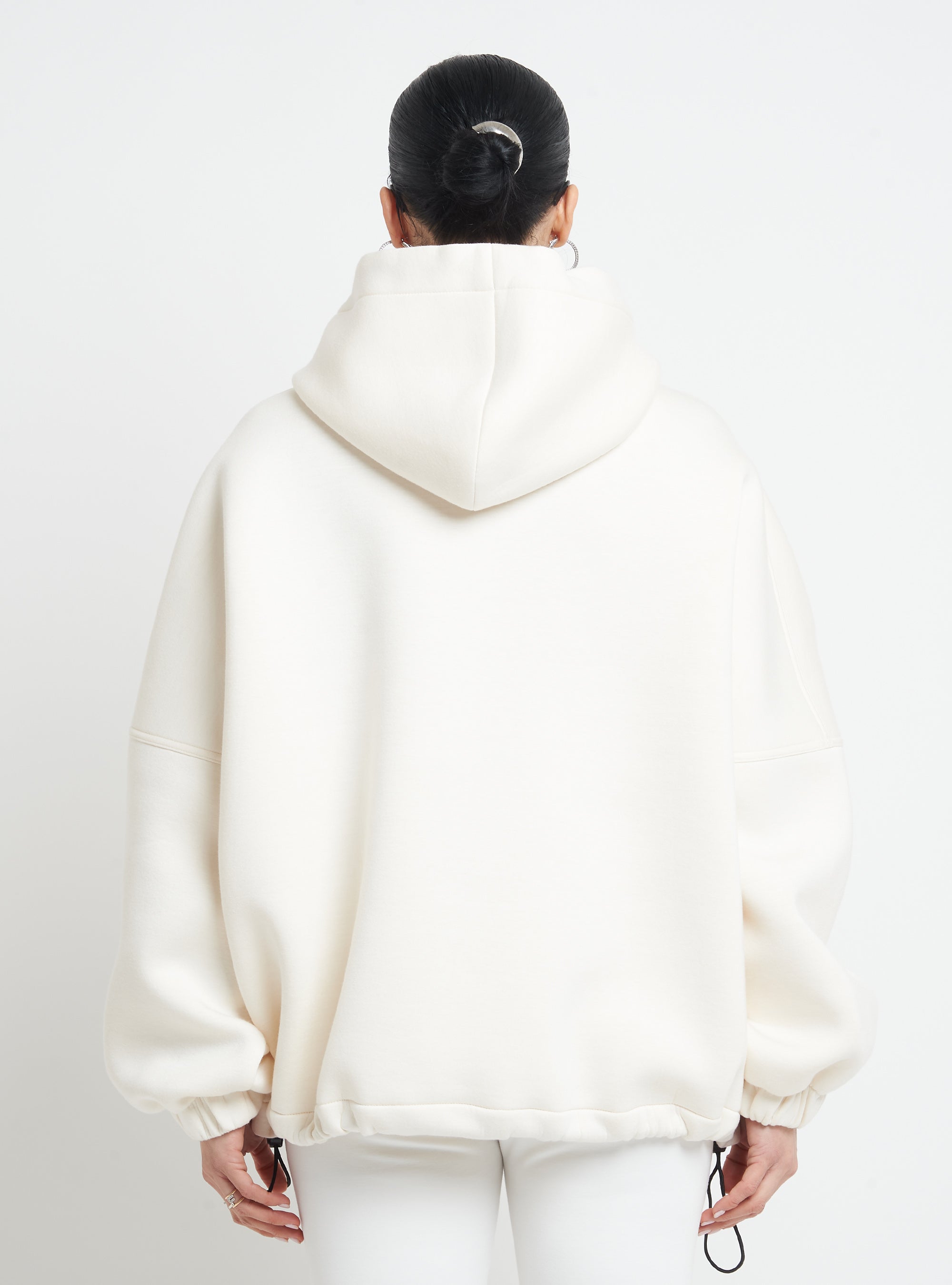 Super oversized sweatshirt with hood, finished with an adjustable drawstring, in neoprene. This piece was designed with many body types and gender expressions in mind.