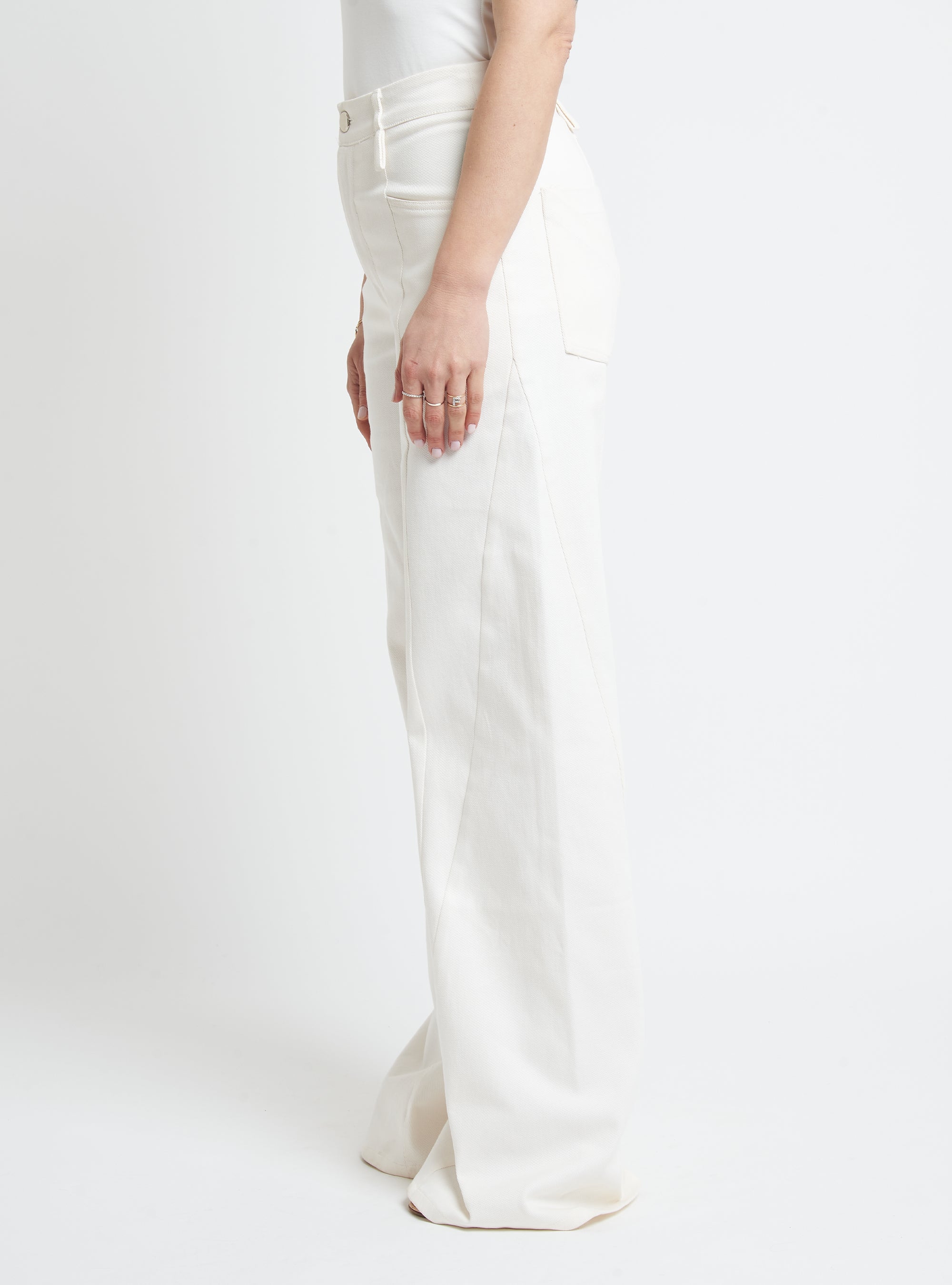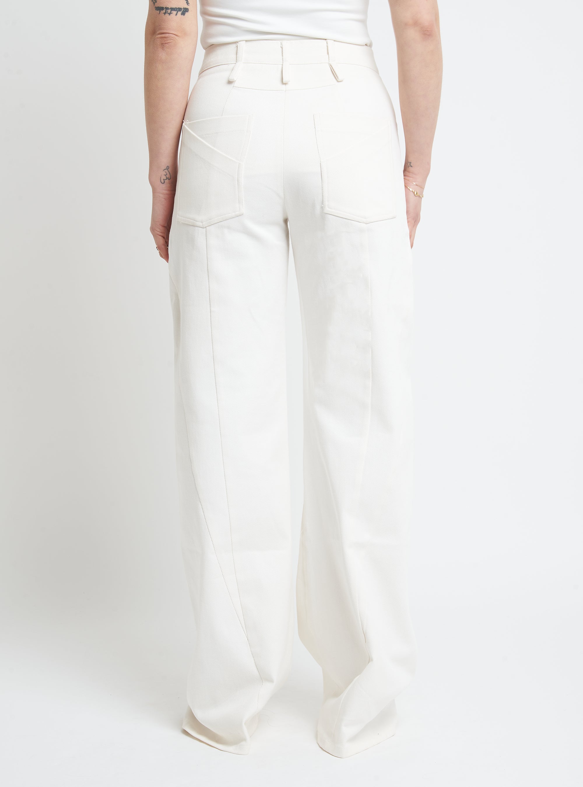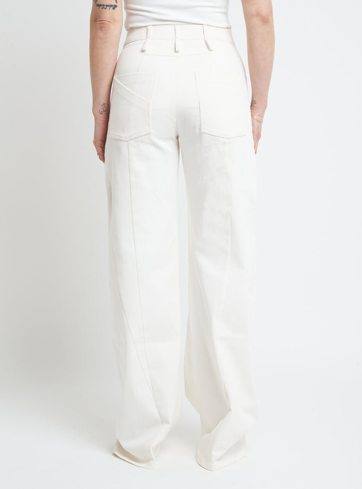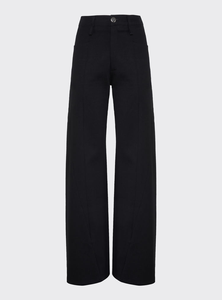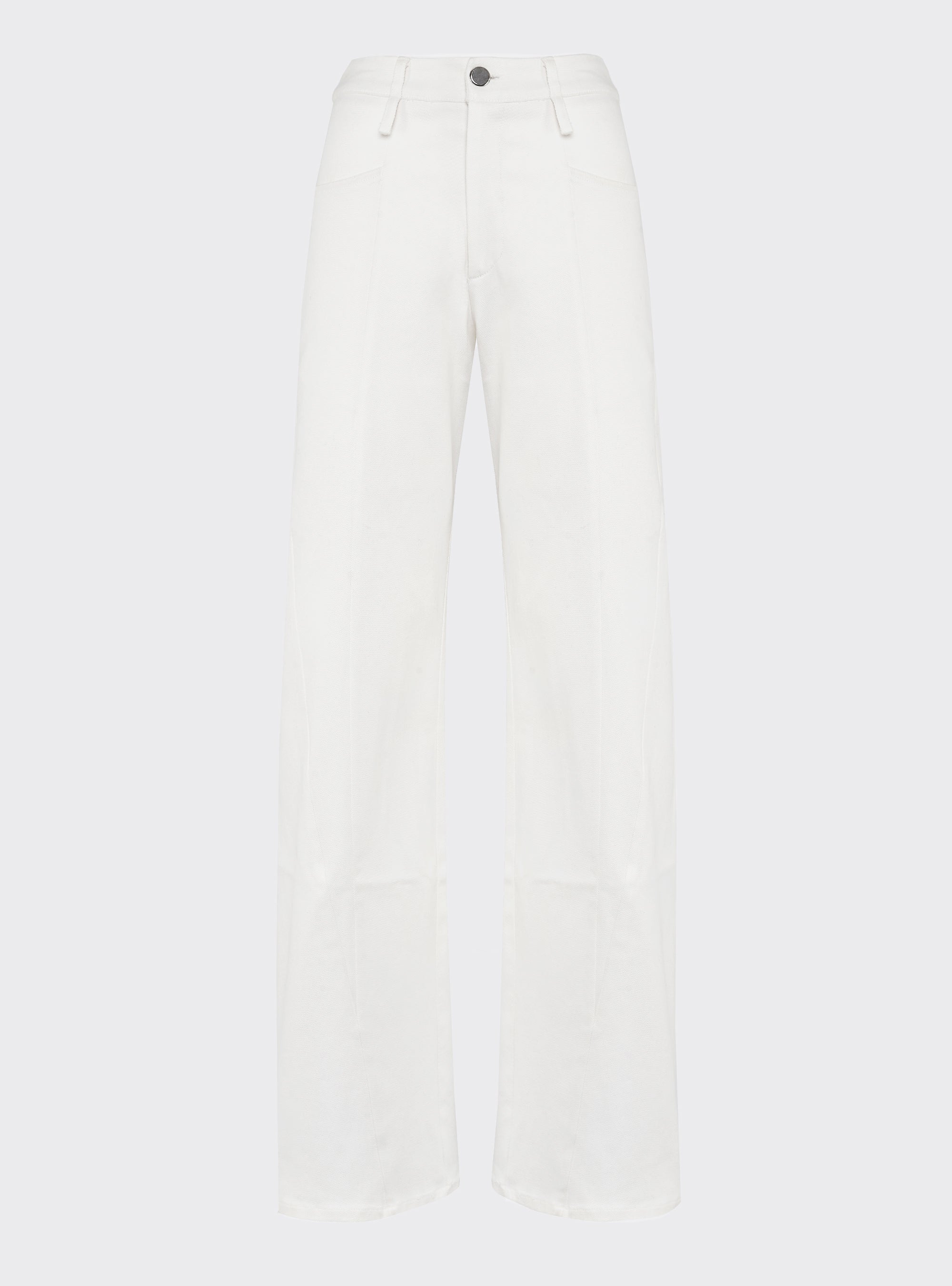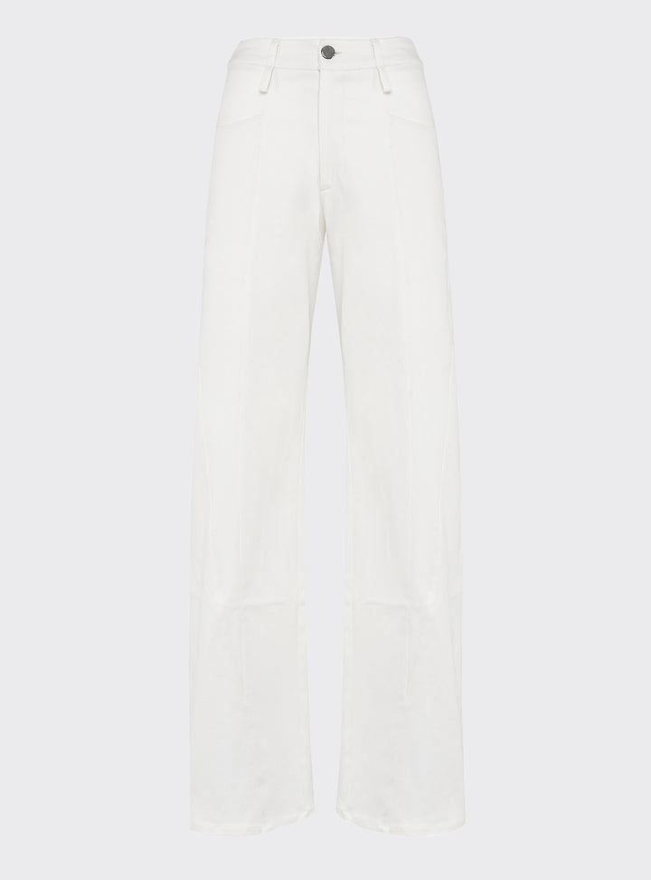 Wide-leg denim trousers featuring body-contouring stitching. Regular fit.