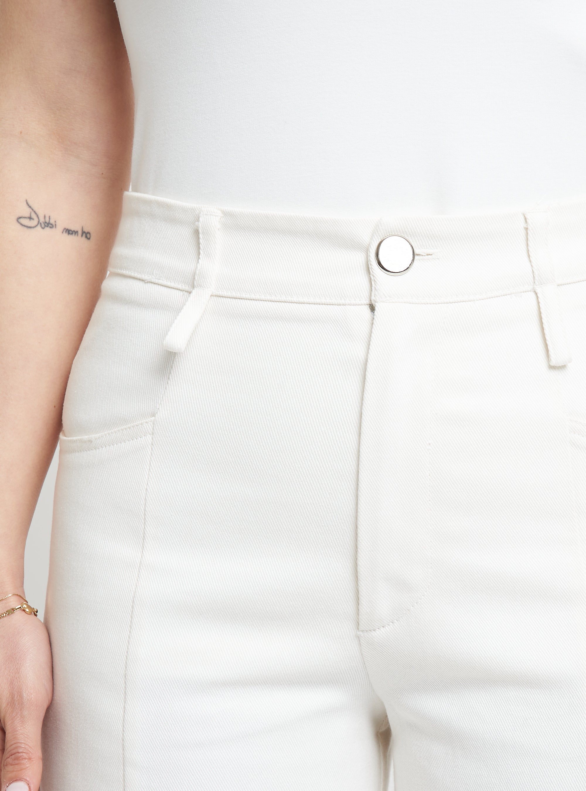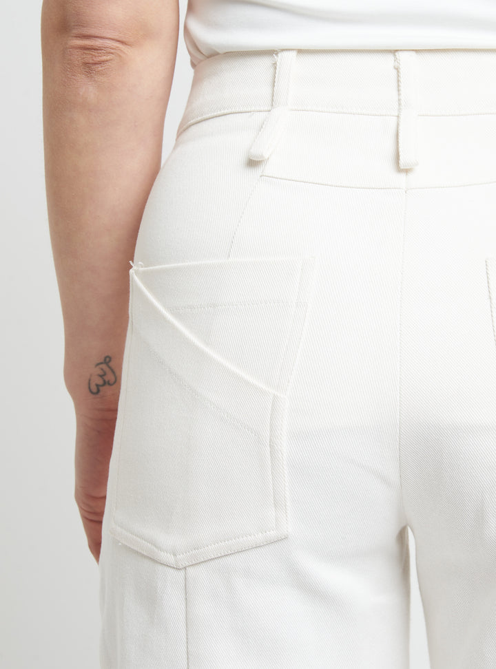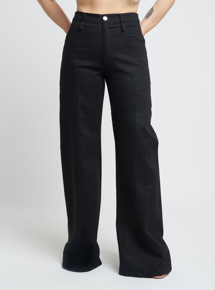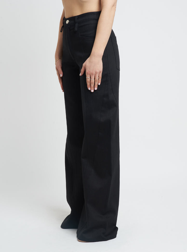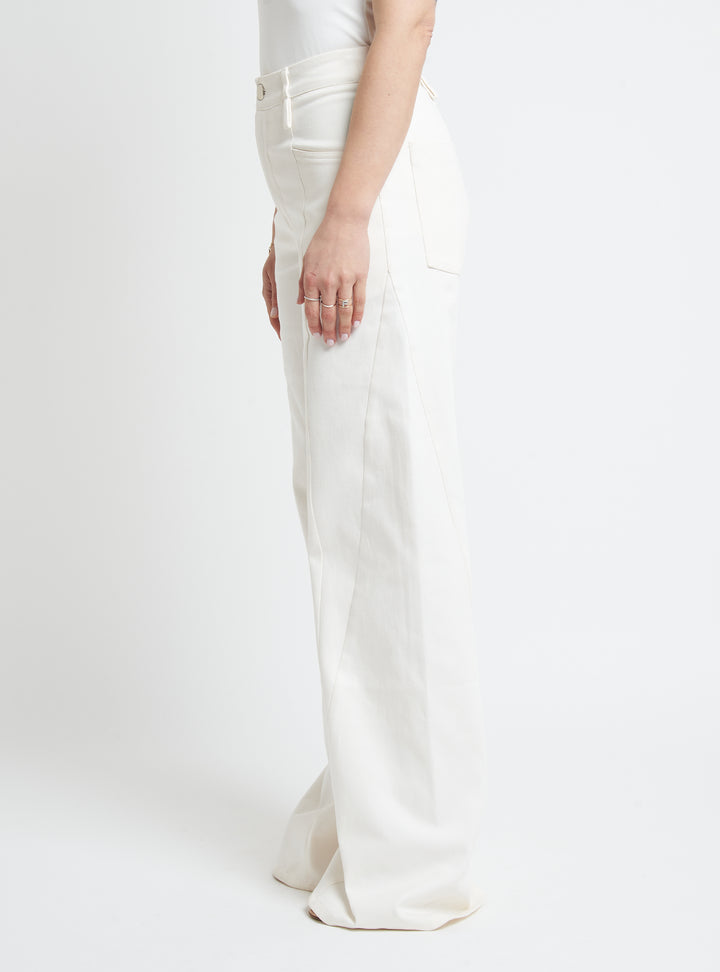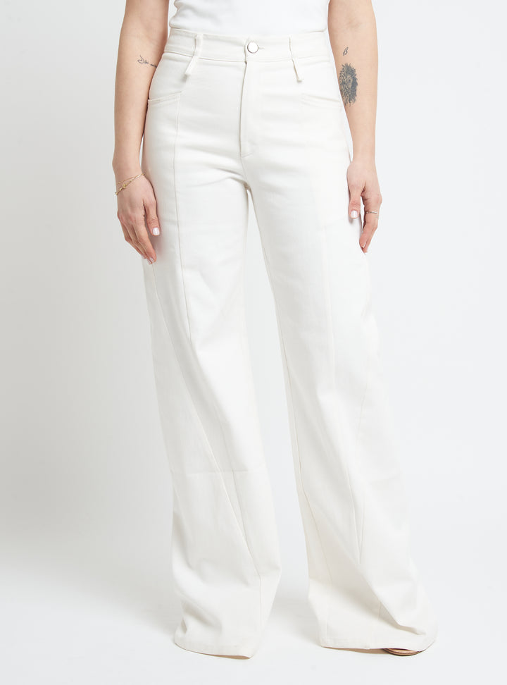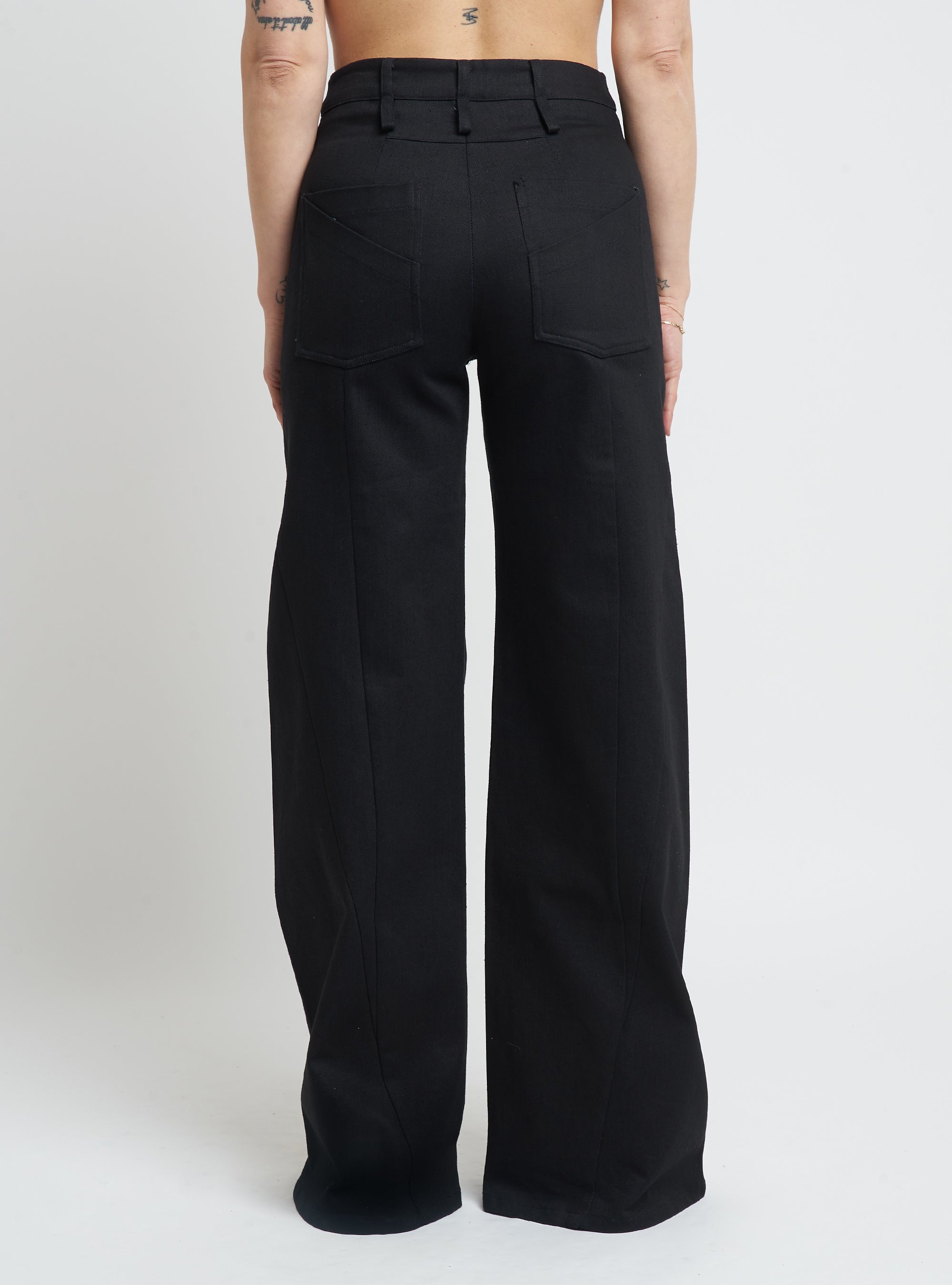 Wide-leg denim trousers featuring body-contouring stitching. Regular fit.